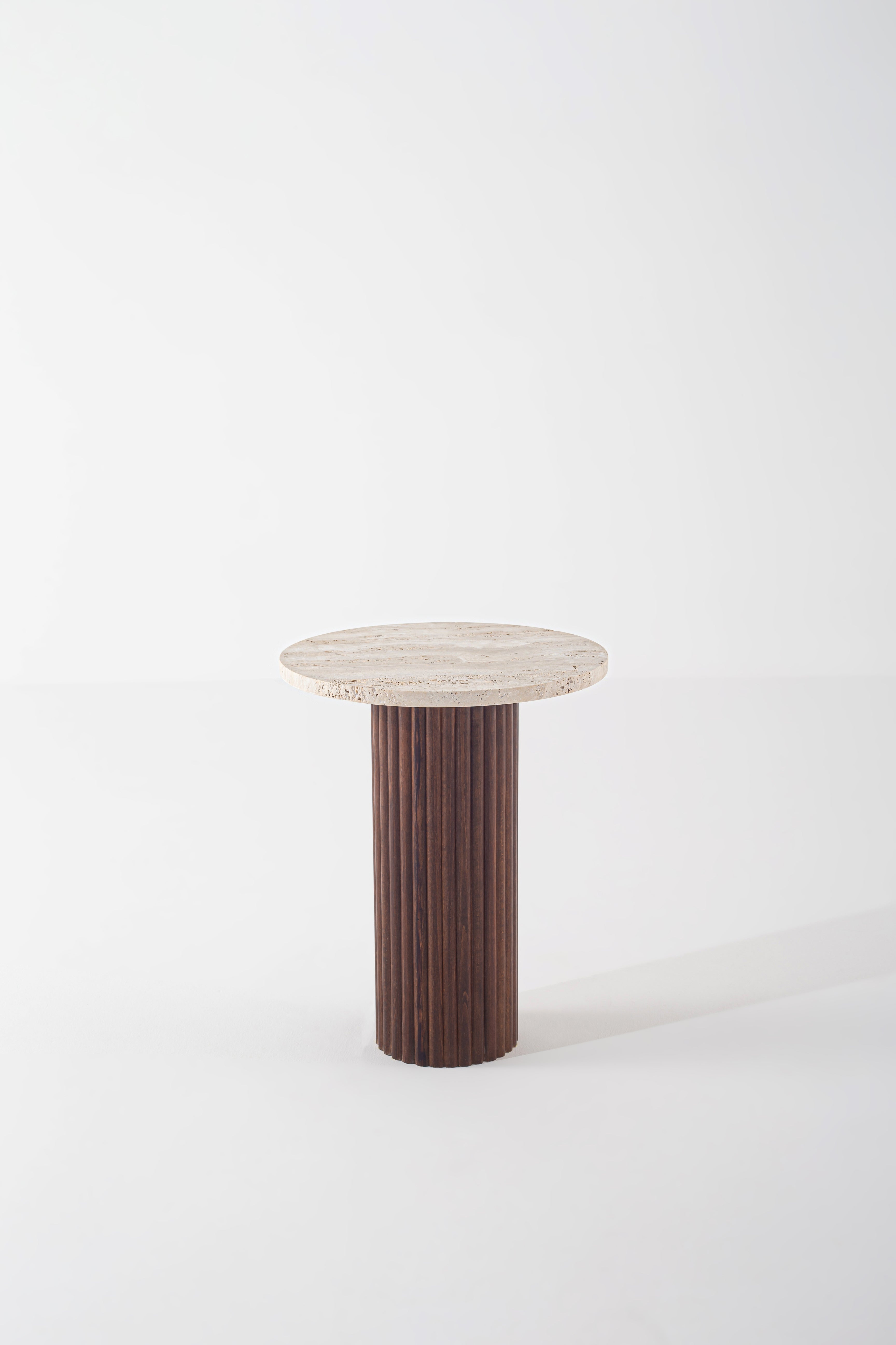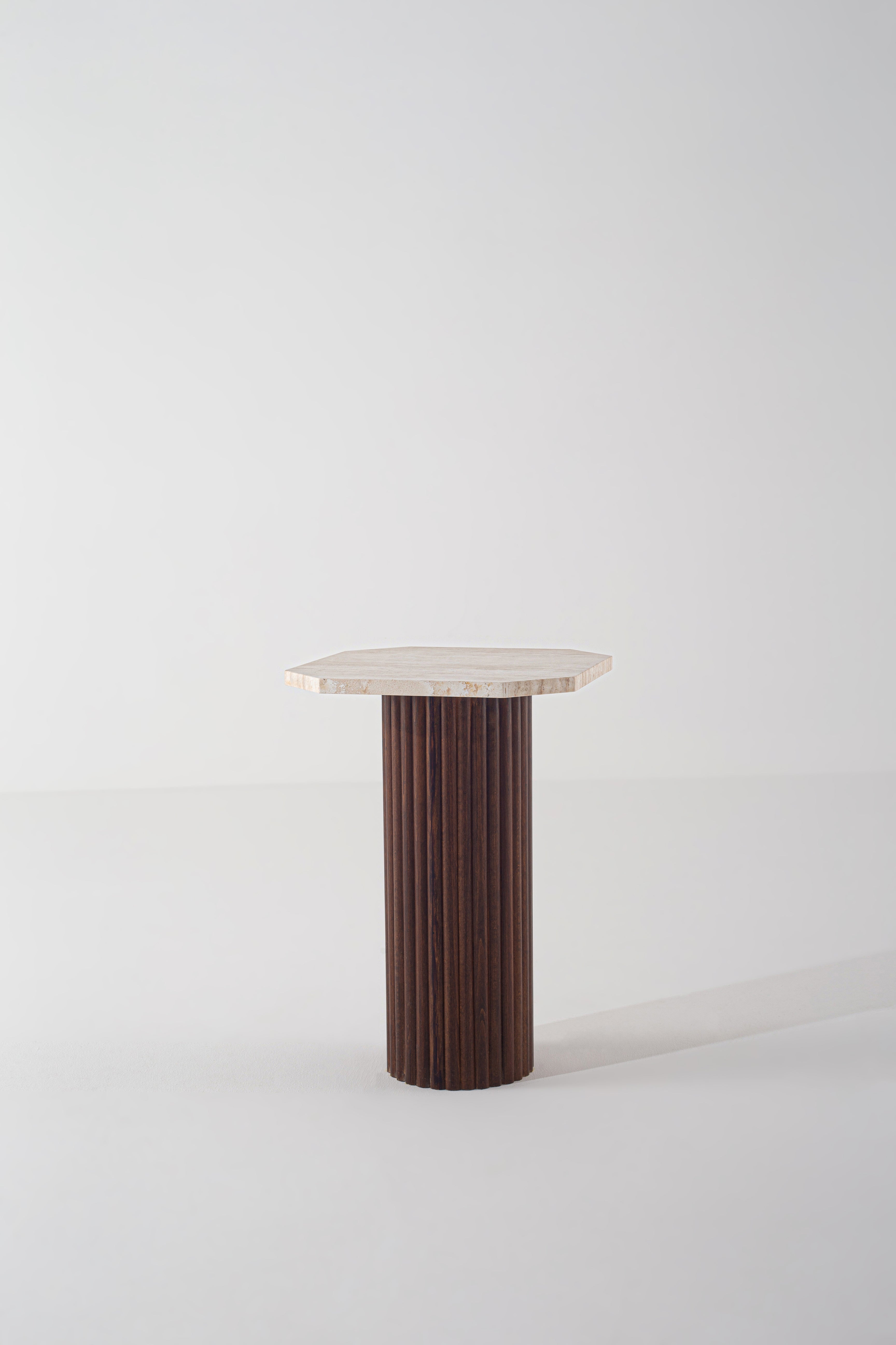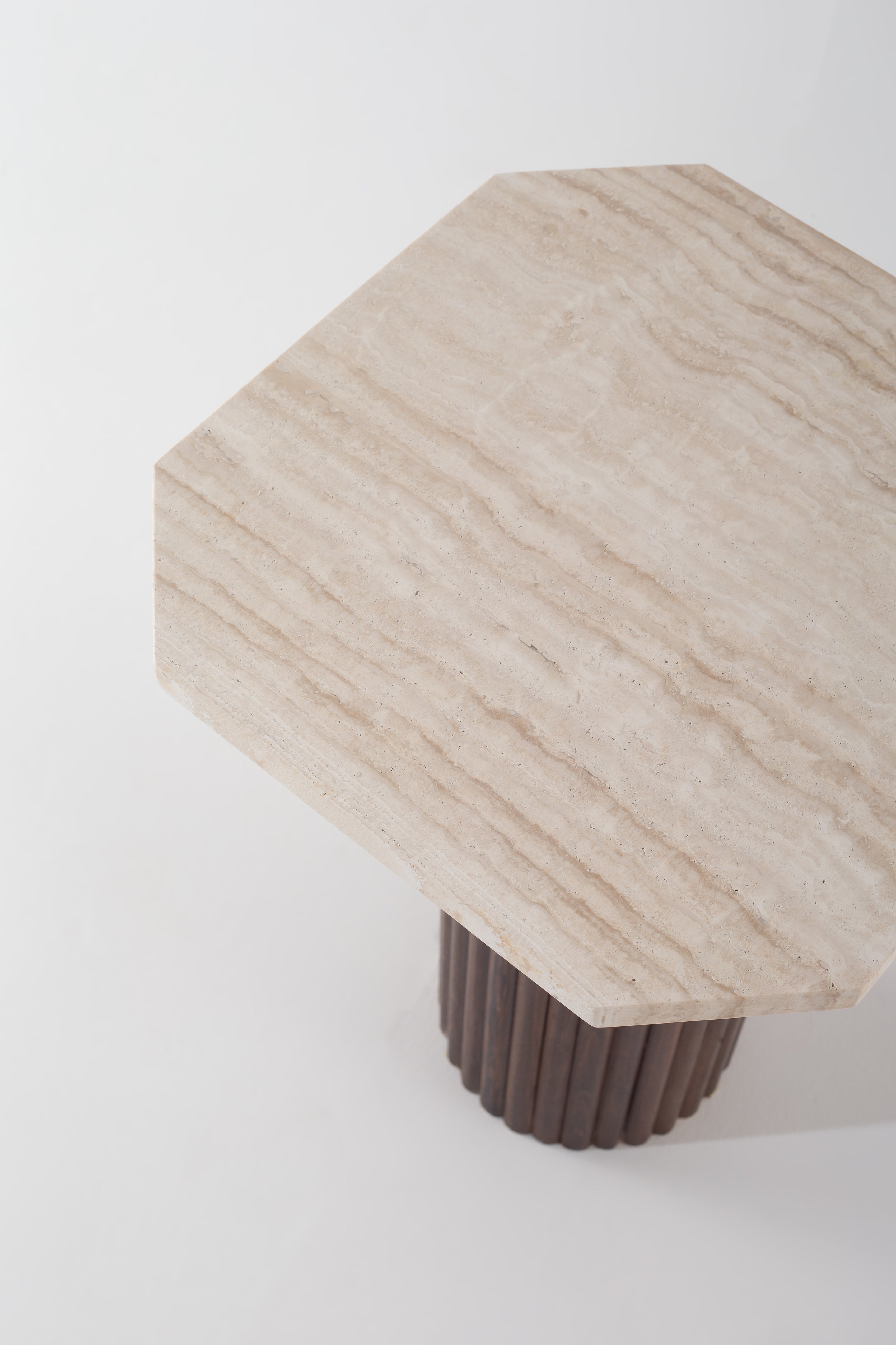 Your space deserves a striking accent, and this side table delivers. Featuring a bold wooden base with vertical fluting, it pairs seamlessly with your choice of tabletop—sleek marble, organic travertine, or deep wood—each offering a distinct aesthetic. The geometric top, available in round or octagonal shapes, enhances the sculptural appeal, making it a conversation-worthy piece in any modern or contemporary interior. Whether placed beside your sofa, armchair, or bed, this table adds both function and a touch of artisanal craftsmanship to your décor.