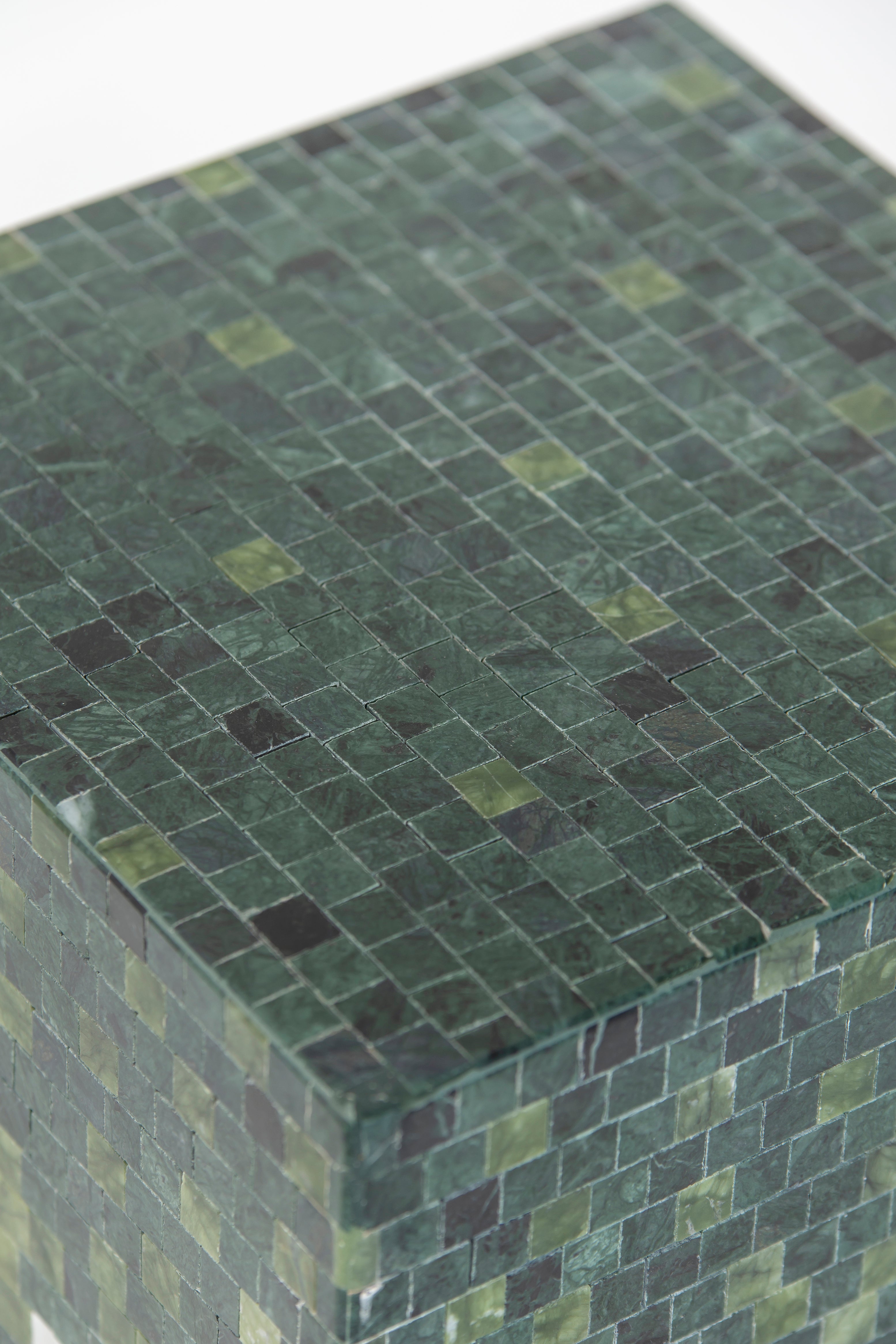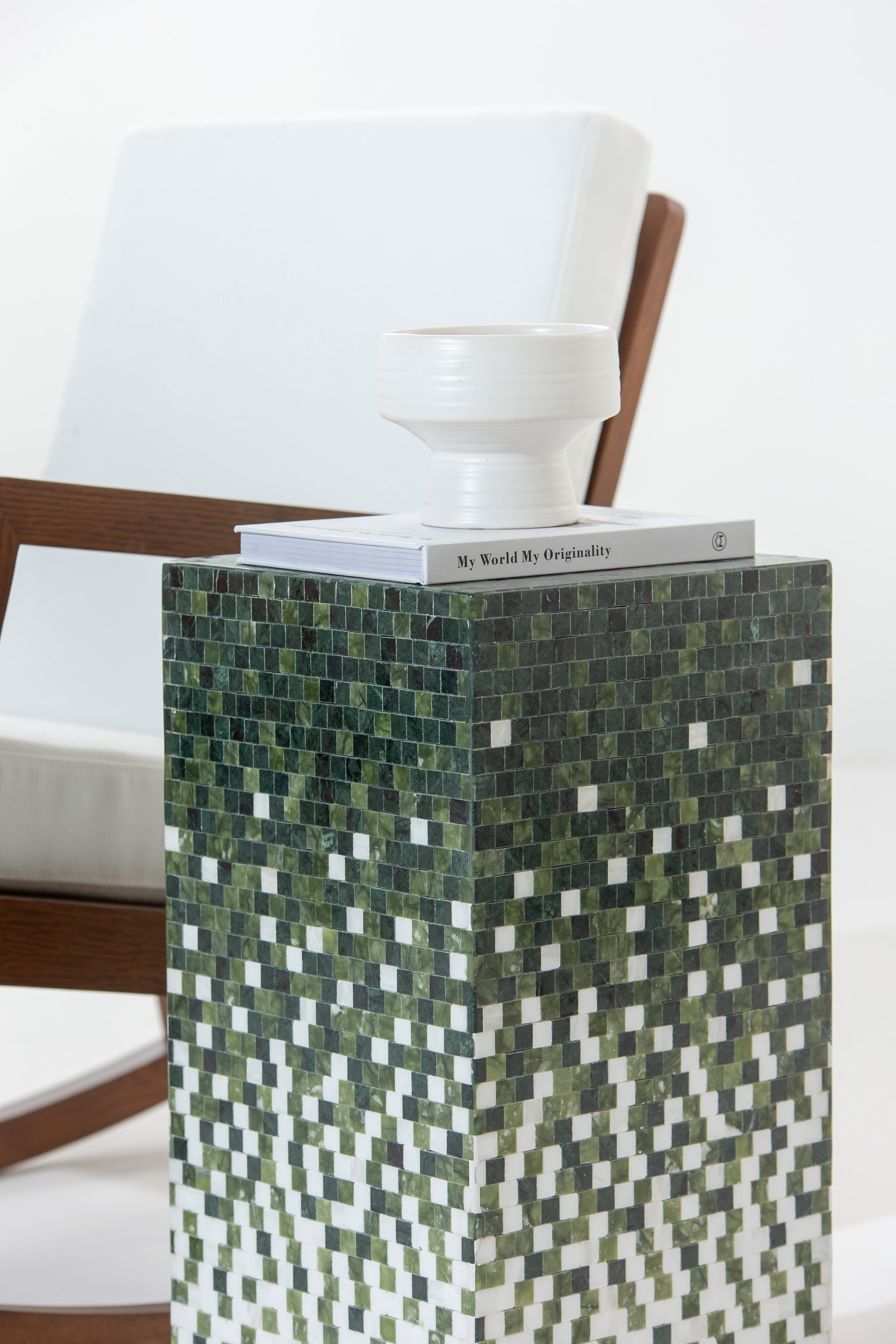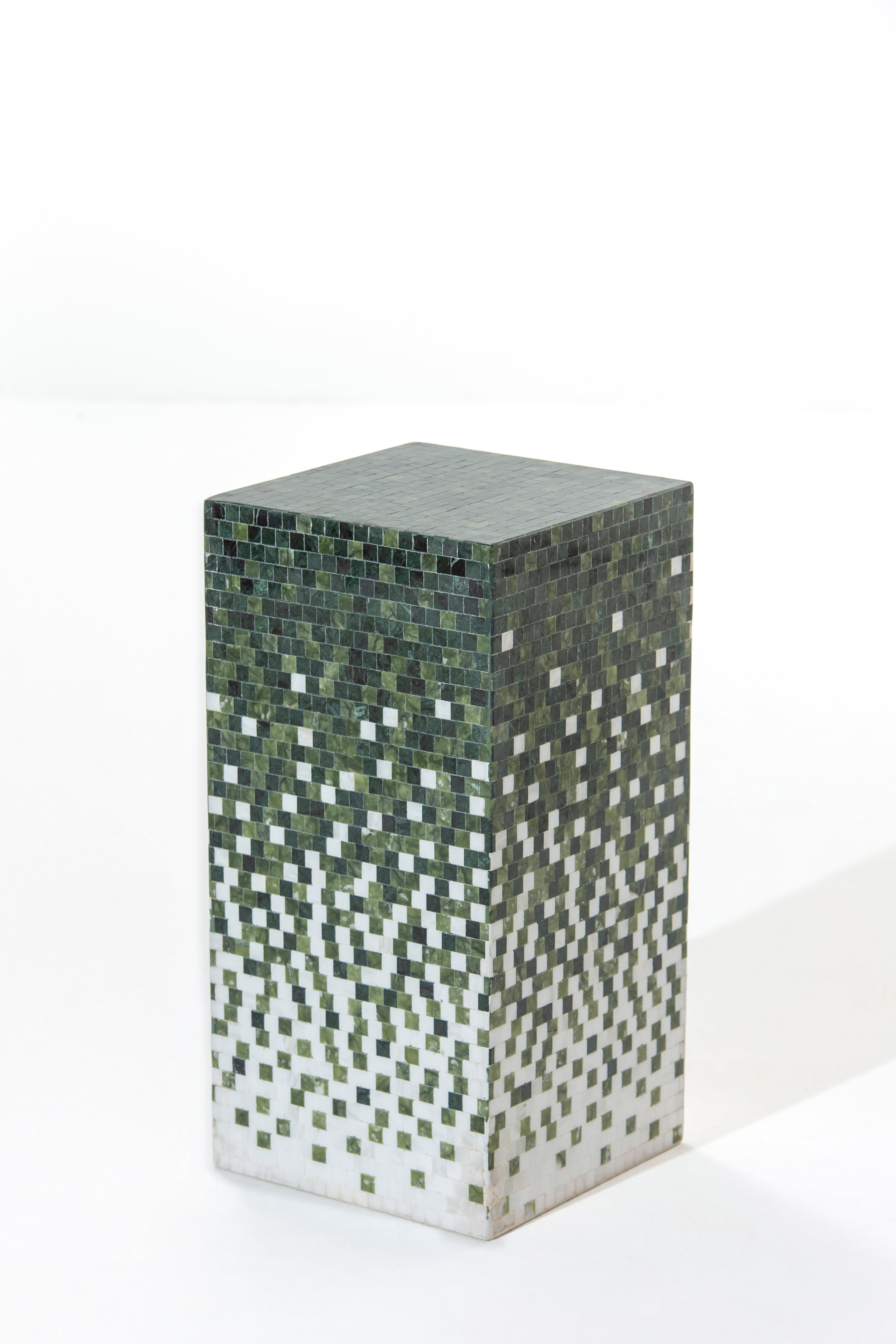 A handcrafted work of art designed to refresh your living space. This exquisite display pedestal, created from natural marble mosaic, showcases a vibrant green gradient transitioning from crisp whites to lush olive and deep forest greens, creating a dynamic, textured surface. Its sleek, rectangular shape offers versatile placement as a modern side table or sculpture stand, making it a perfect accent for contemporary or biophilic home decor. Discover timeless elegance and natural tranquility with this unique, durable marble plinth, enhancing your cherished pieces.