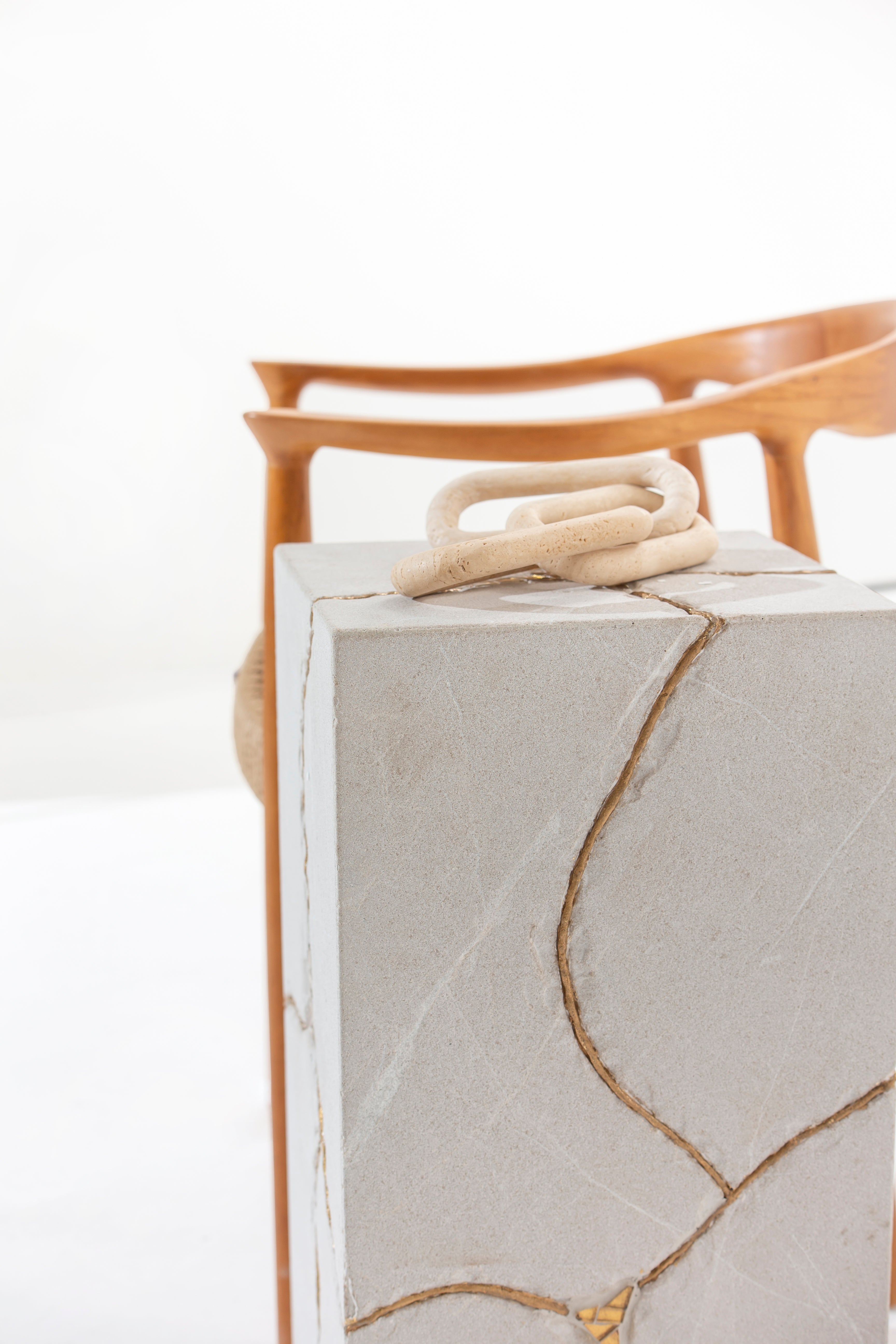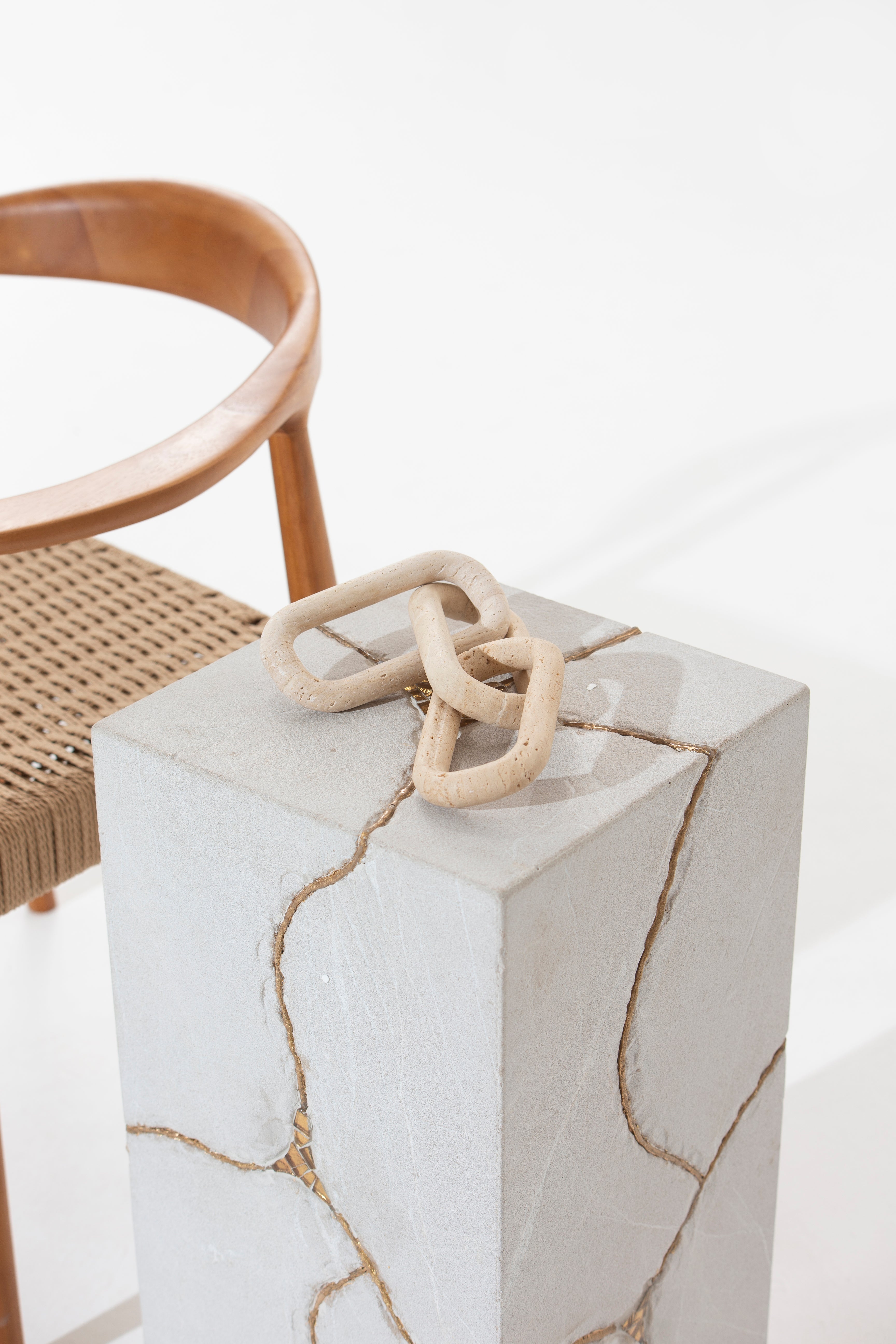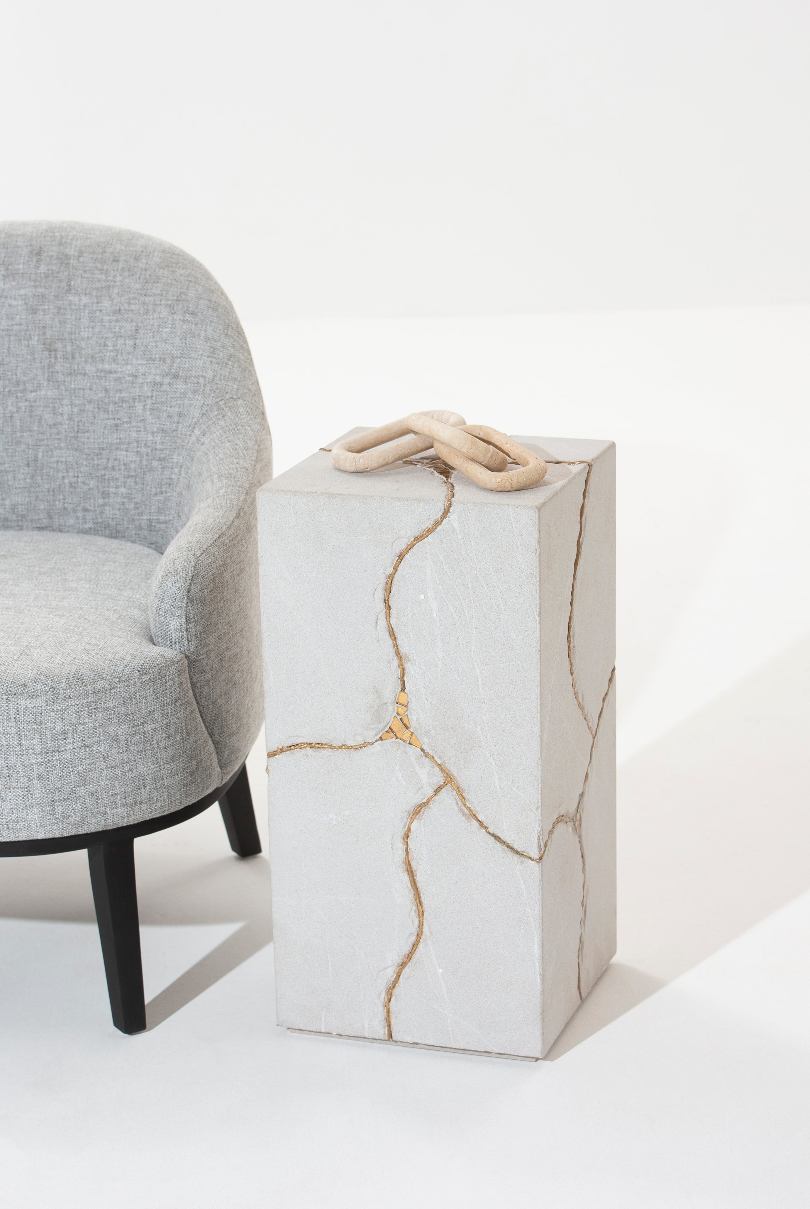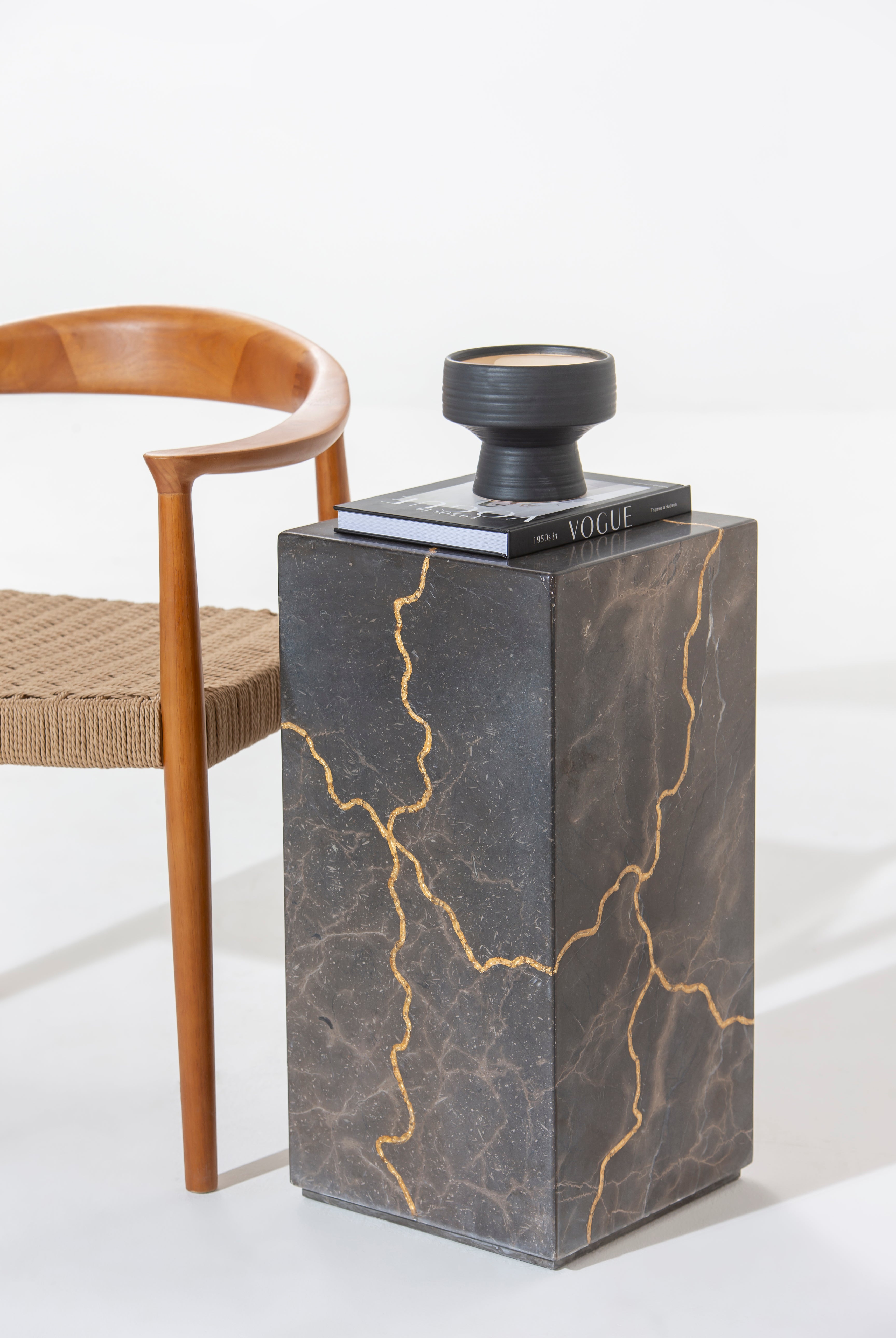 A modern fusion of elegance and artisan detail. Picture yourself placing your favorite sculpture, vase, or plant atop this rectangular pedestal, its soft ivory-toned engraved marble surface showcasing organic gold-colored veins that mimic the timeless Japanese art of Kintsugi. The smooth, matte stone texture contrasts beautifully with the shimmering fractured lines, creating a striking visual balance. Whether in your living room, hallway, or gallery space, this sculptural plinth becomes a bold expression of your curated aesthetic and refined taste.