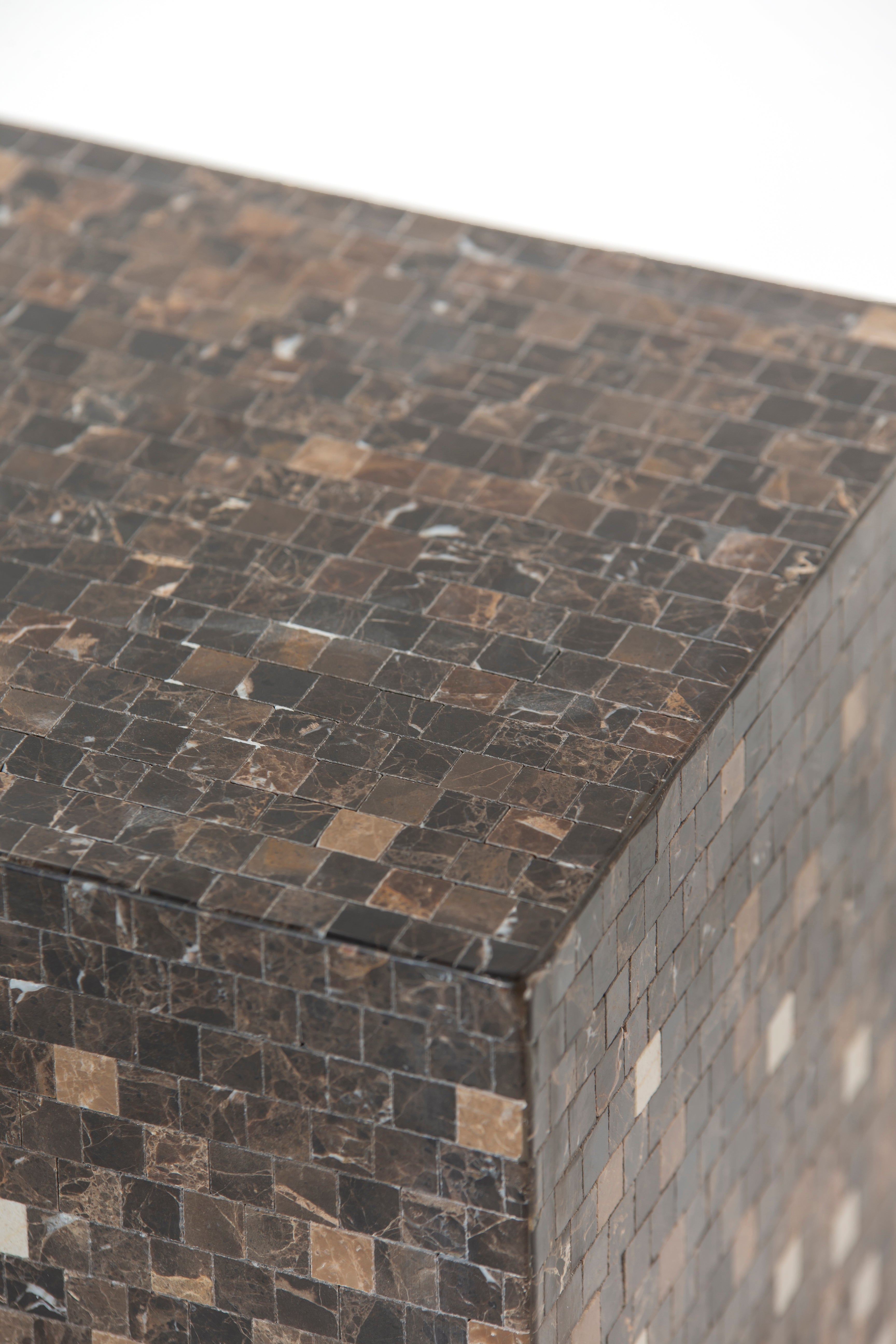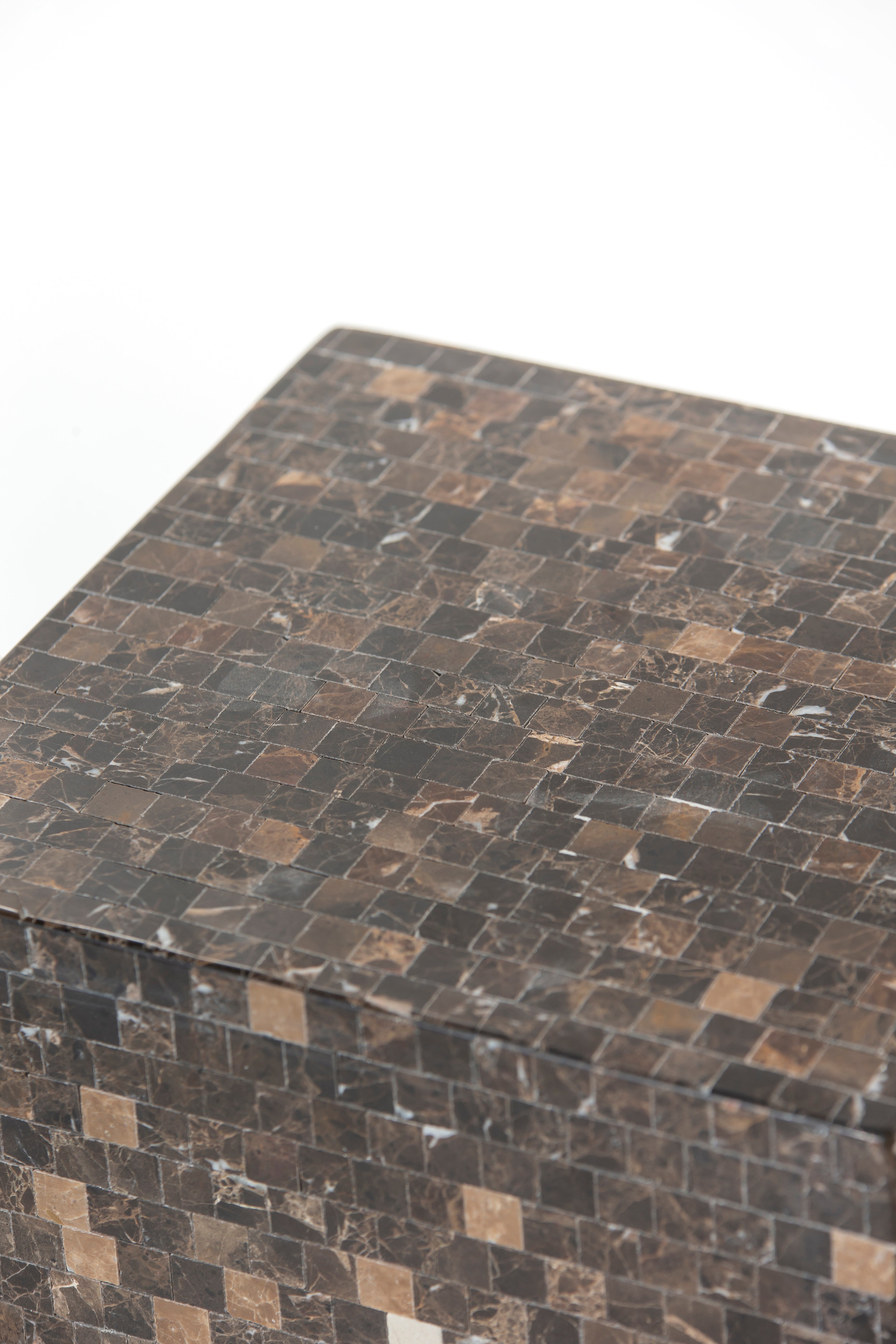 A handcrafted essential designed for your refined home. Expertly crafted from natural marble mosaic, this versatile display pedestal features a striking neutral gradient, seamlessly transitioning from light creams and soft greys at the top to rich browns and deep charcoals at the base, creating an intricate, textured surface. Its clean, rectangular shape functions beautifully as a modern side table or sculpture stand, harmonizing effortlessly with minimalist, contemporary, or industrial home decor. Enhance your space with the timeless elegance and quiet luxury of this unique, durable marble plinth, perfectly complementing your curated pieces.