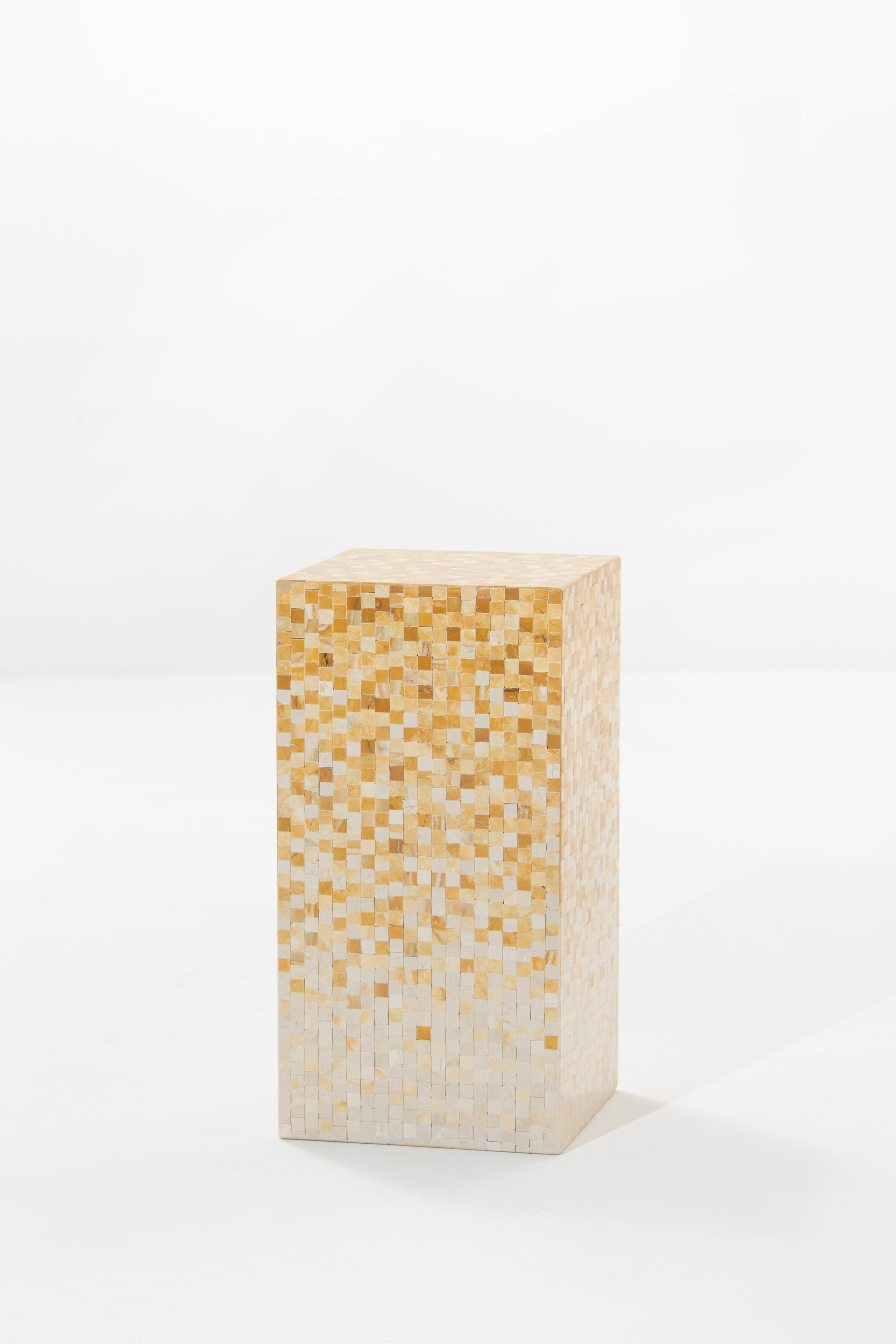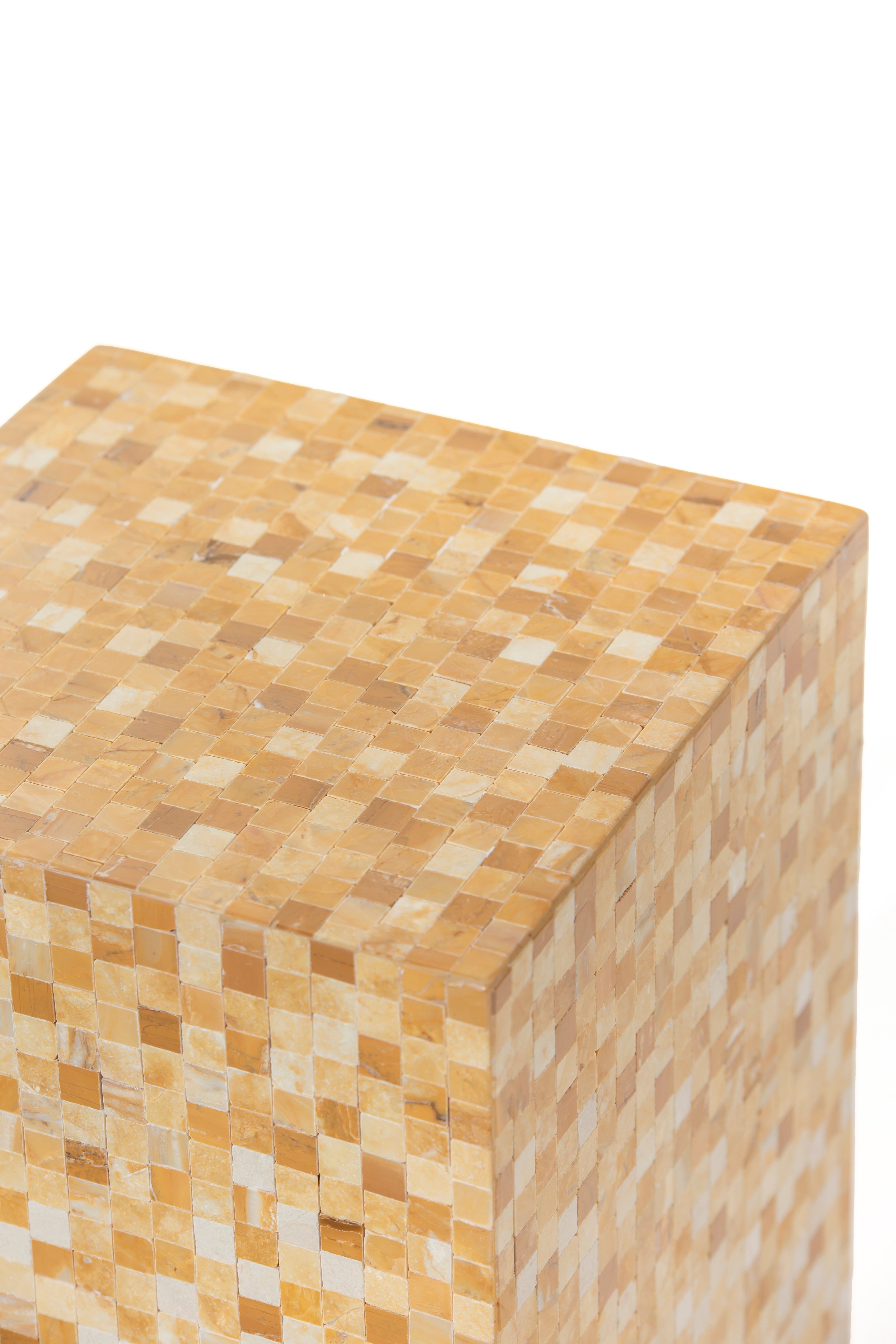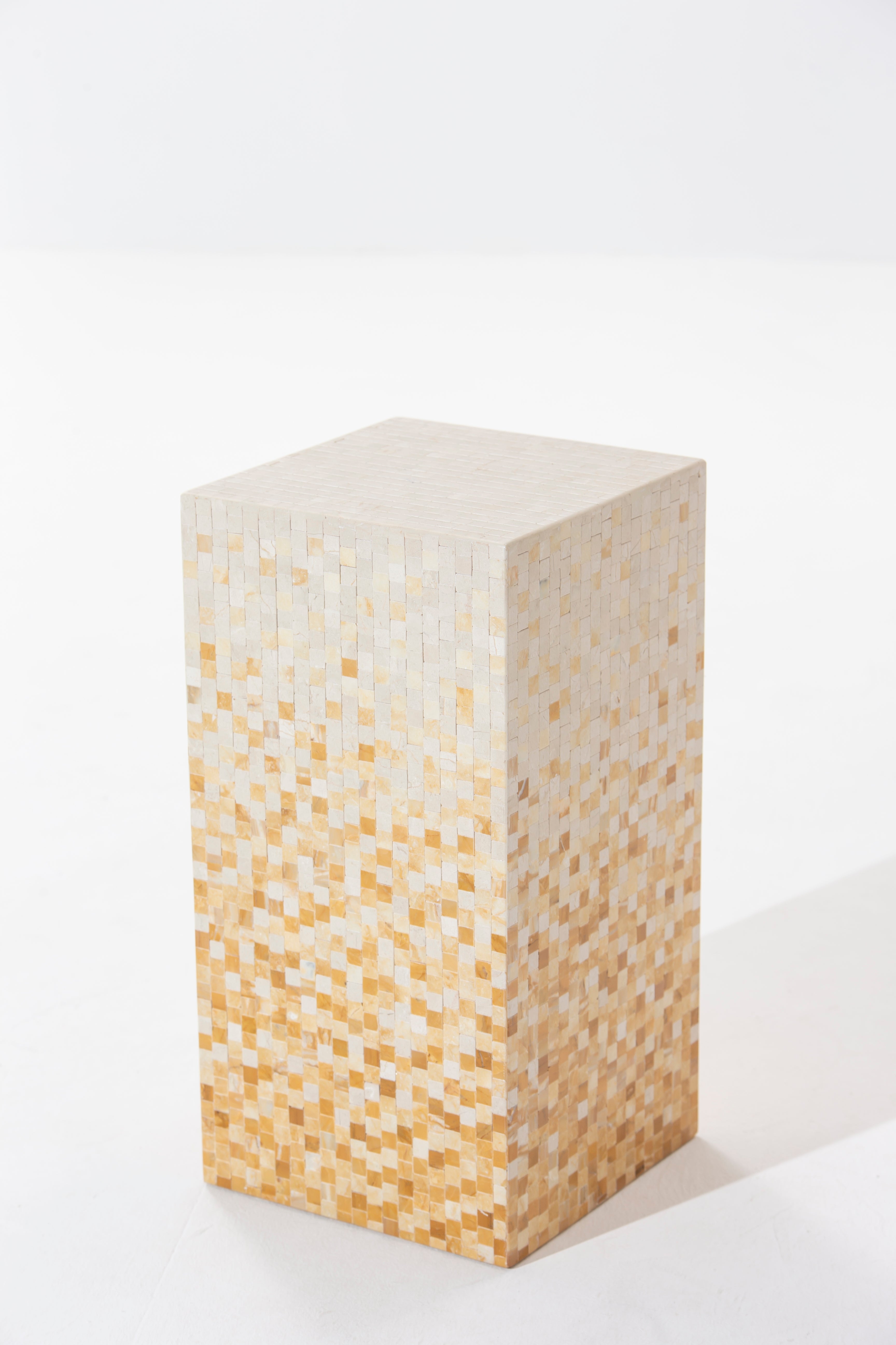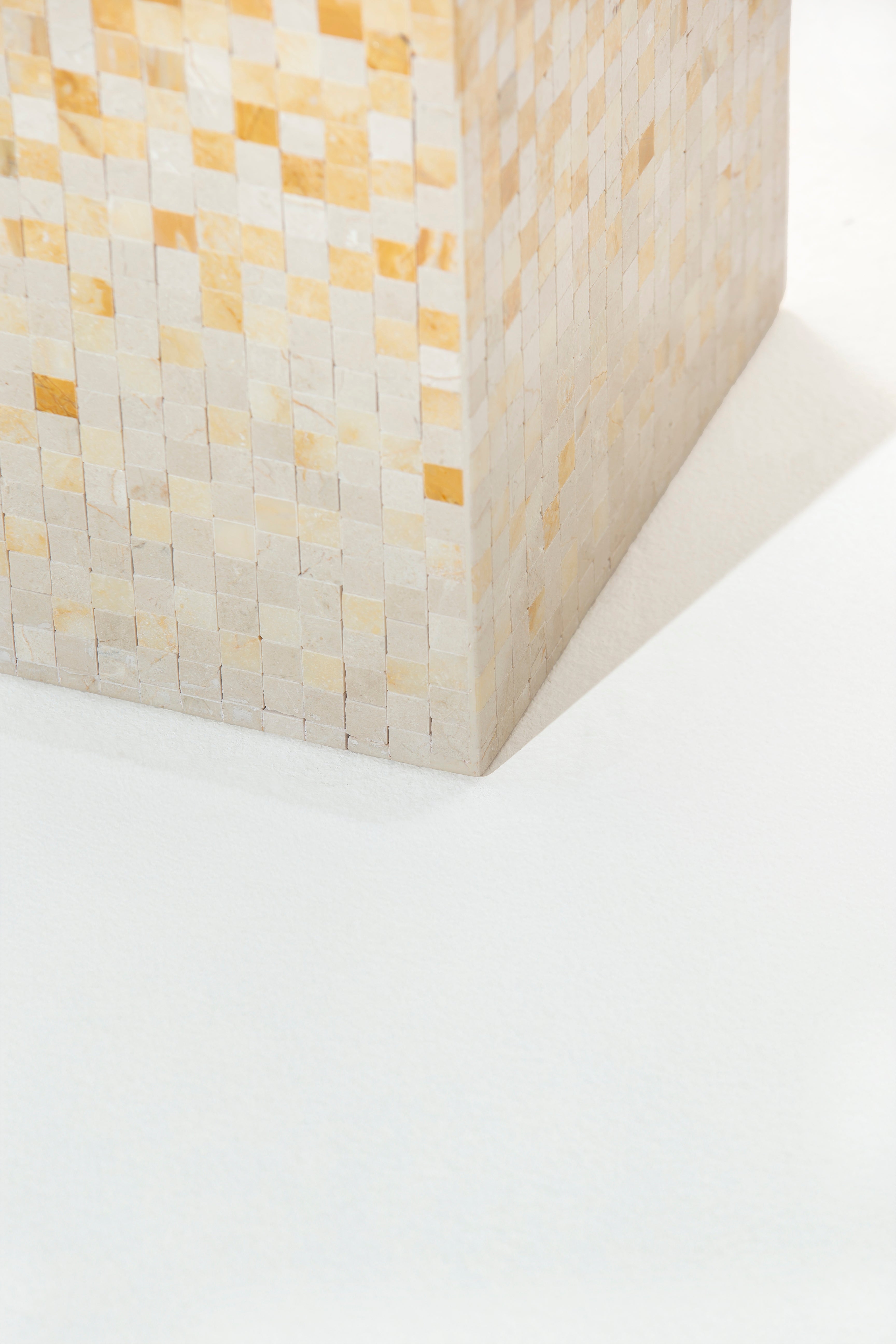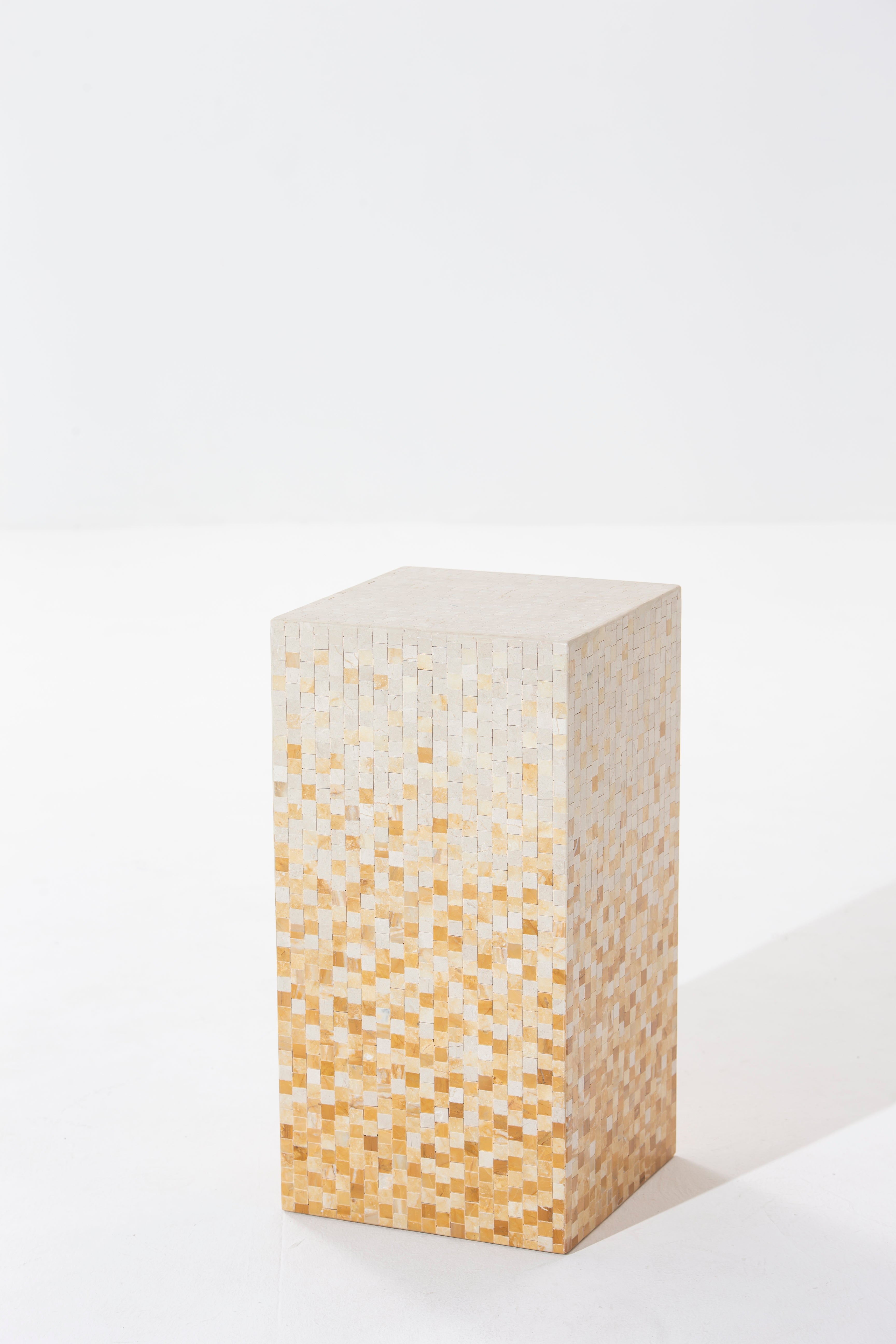 A handcrafted focal point designed to complement your distinctive style. This luxurious display pedestal, meticulously crafted from natural marble mosaic, features a beautiful warm gradient from soft creams to golden tans and rich browns, creating an alluring, textured surface that glows with warmth. Its elegant, rectangular shape serves as an ideal modern side table or decorative stand, perfect for showcasing your art or plants in contemporary or transitional home decor. Embrace timeless charm and sophisticated warmth with this unique, durable marble plinth, elevating your most treasured possessions.