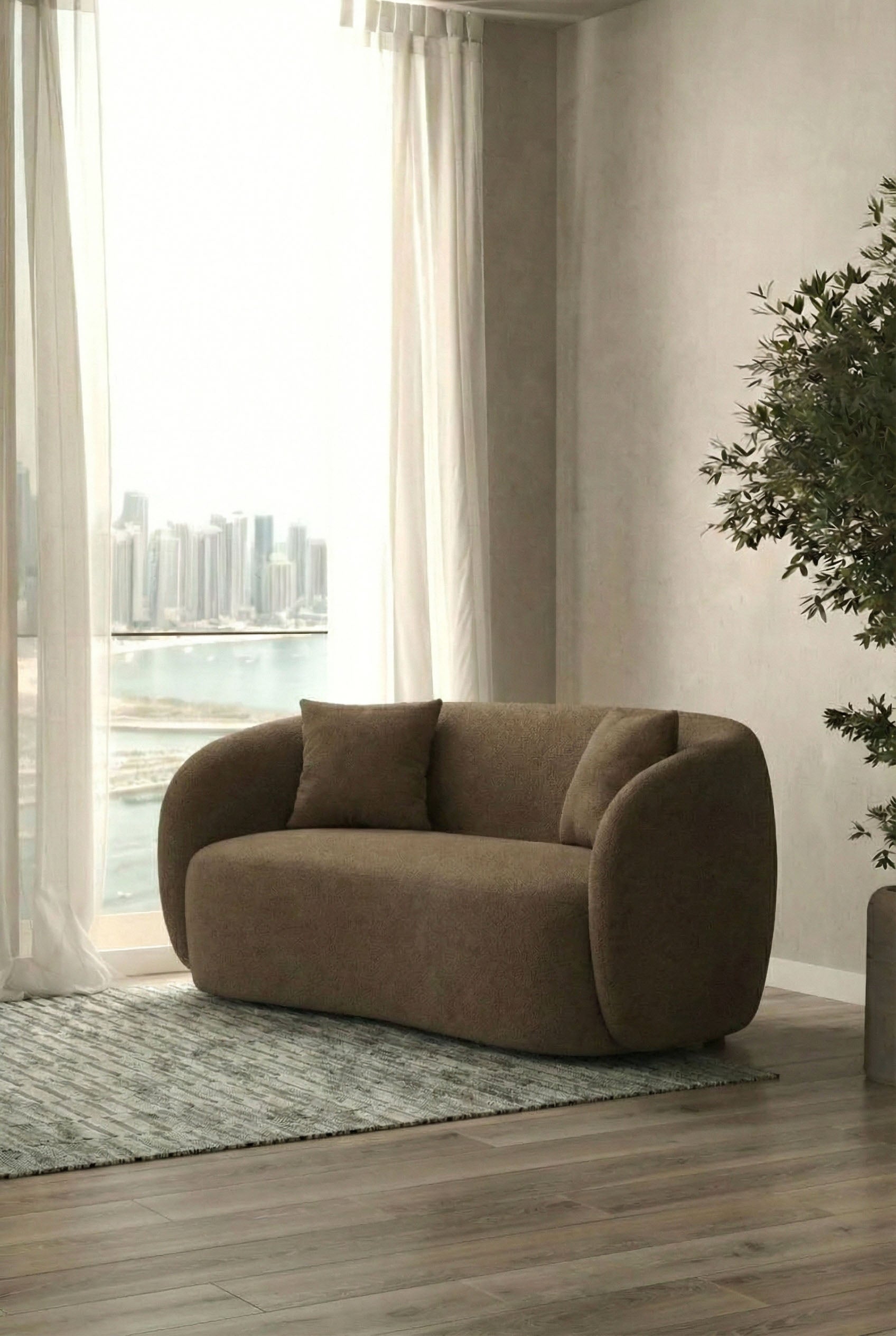 Bring a soft, sculptural statement into your home with this curved sofa, wrapped in cozy brown bouclé that adds depth and warmth to any room. The rounded silhouette and plush cushioning create an inviting place to unwind, while the rich neutral tone blends beautifully with minimalist, modern, and organic interiors. Styled for effortless elegance, it works as a refined centerpiece in a living room or a calming anchor in a bedroom lounge corner. Choose the size that fits your space and enjoy a look that feels both elevated and irresistibly comfortable.