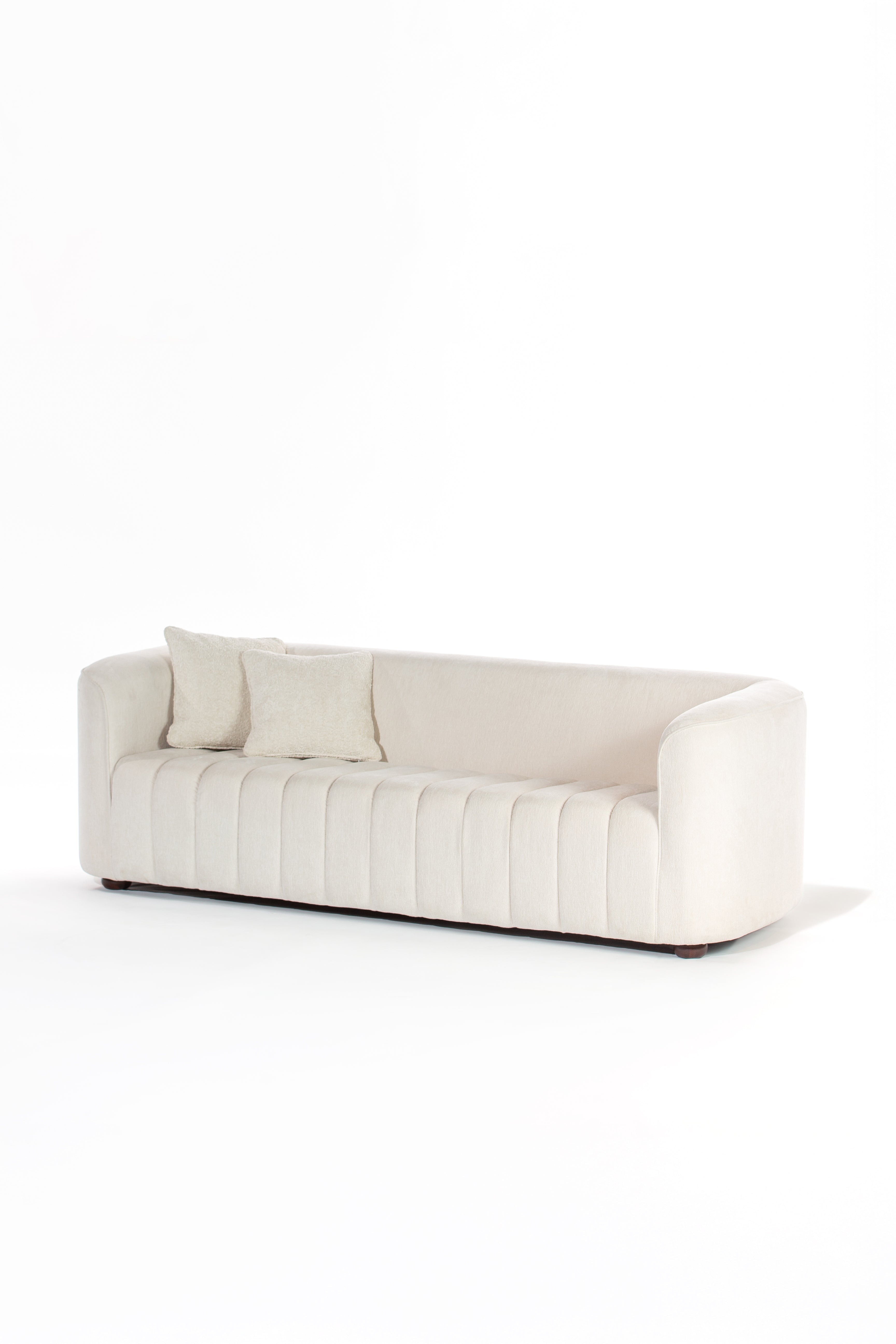 Transform your living space with this sculptural sofa, available in 2 and 3-seater options, upholstered in Stone Ivory for a warm and refined aesthetic. The elegant vertical channel tufting along the seat enhances its sophisticated appeal, while the rounded arms and structured backrest bring balance and modern form. Designed for minimalist yet luxurious interiors, this statement piece serves as a focal point of style and comfort, seamlessly elevating both contemporary and transitional spaces.