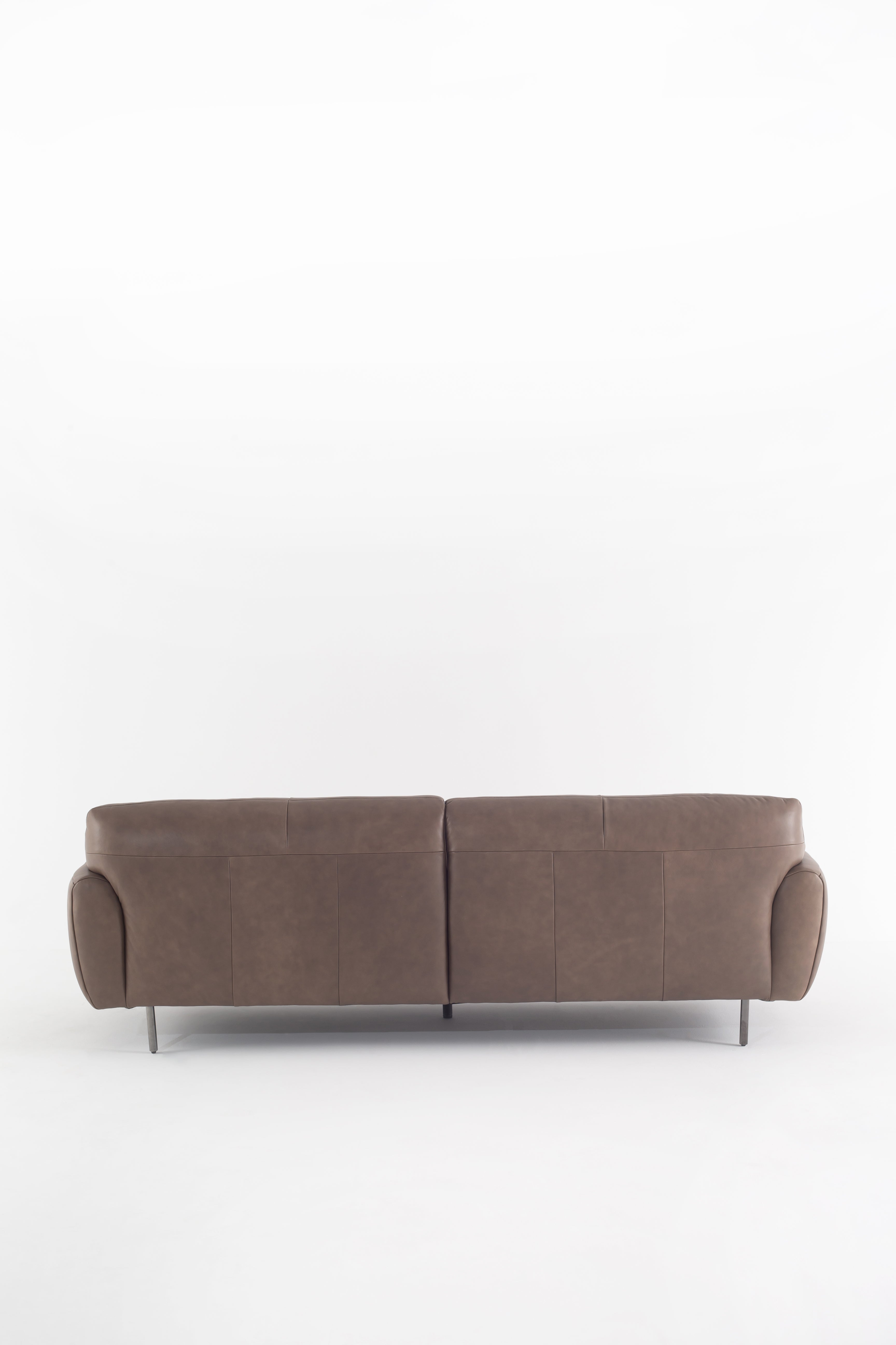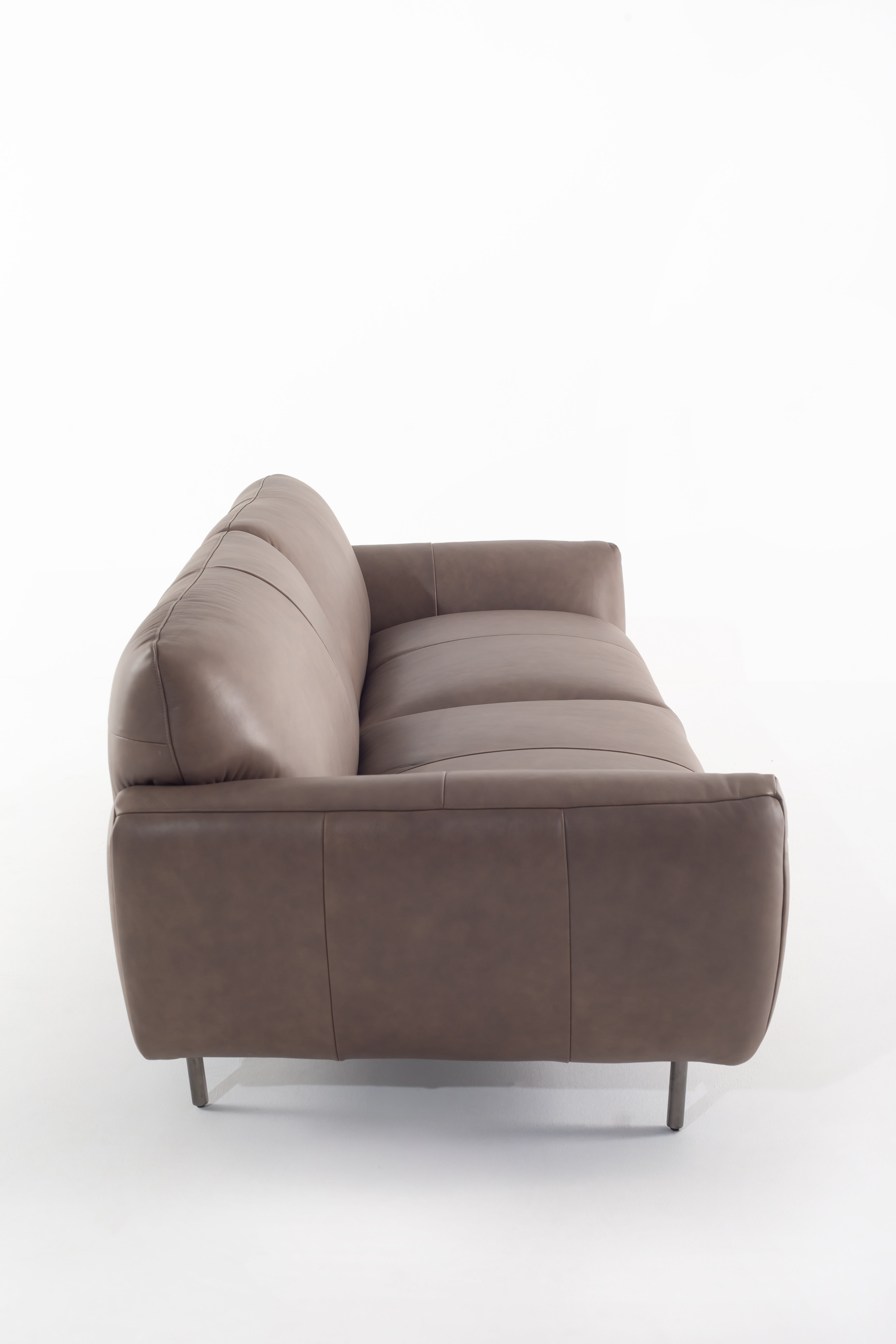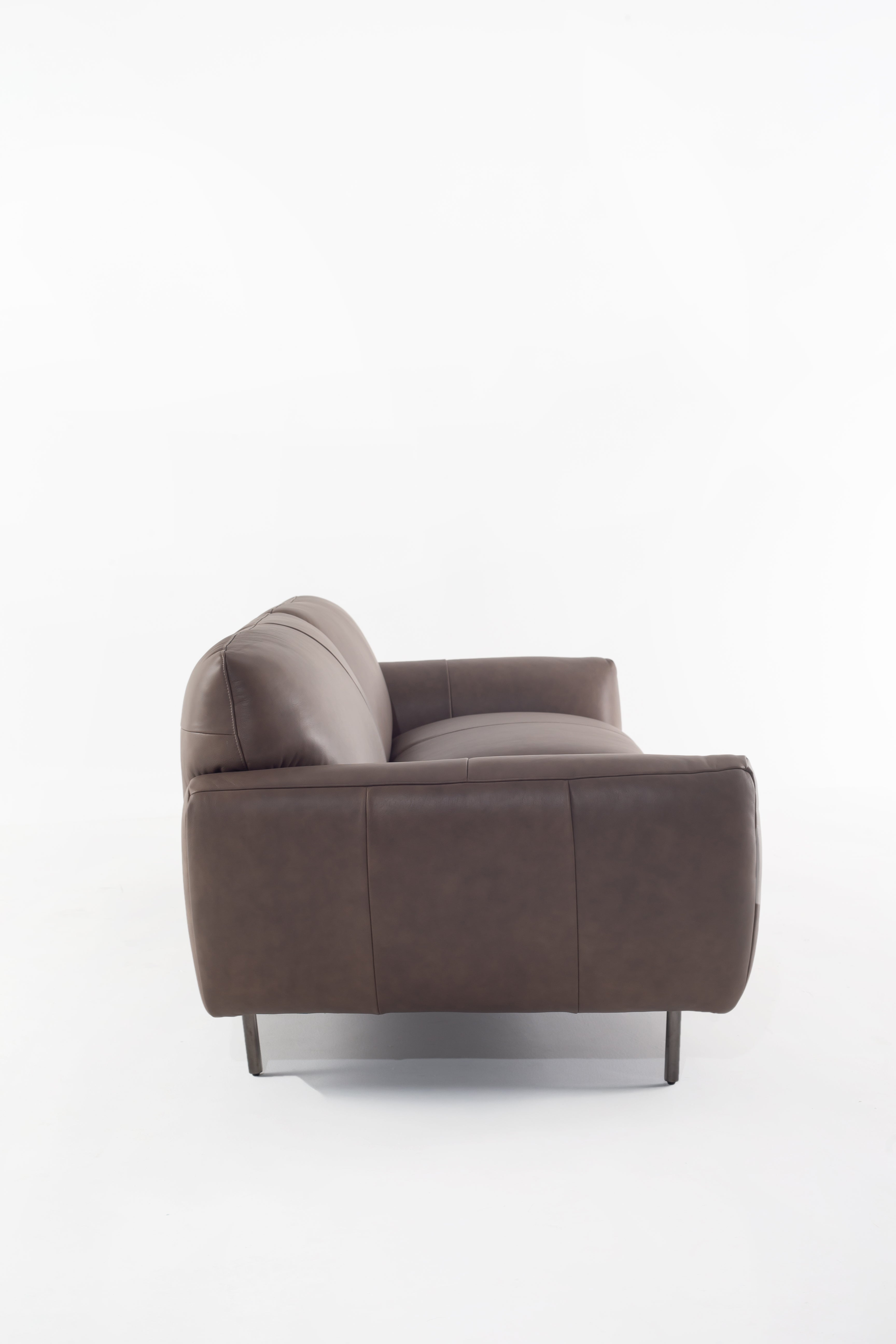 Wrapped in smooth cowhide leather, this sofa becomes the heart of your living space with its curved silhouette and plush seating. The earthy taupe hue complements any décor, while its wide, cushioned arms invite you to unwind in style. Resting on sleek metal legs, it brings a touch of modern elegance without sacrificing comfort. The supple texture and refined stitching showcase expert craftsmanship, making it a timeless addition to your home. Whether hosting guests or lounging solo, this sofa is a statement of luxury and sophistication.