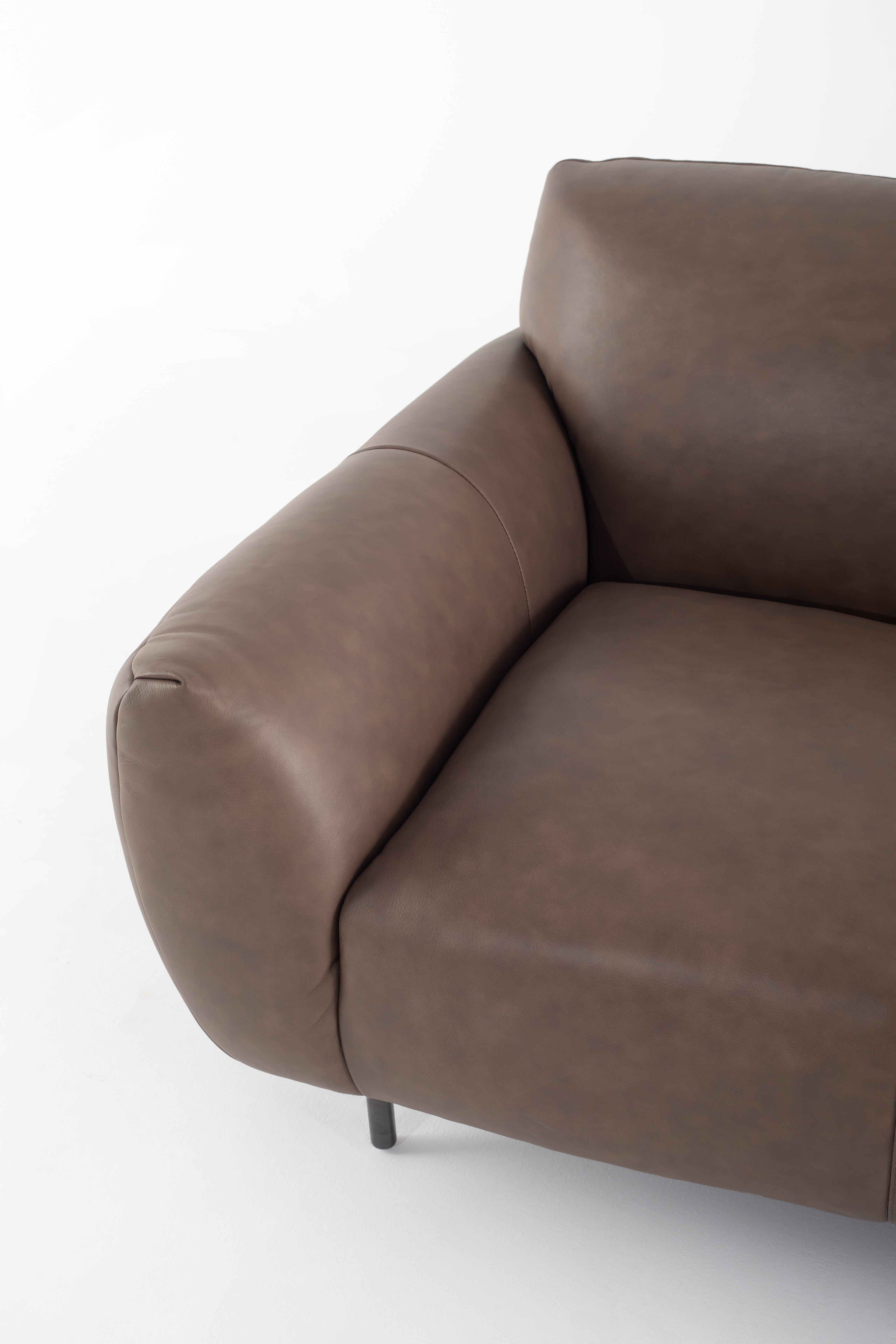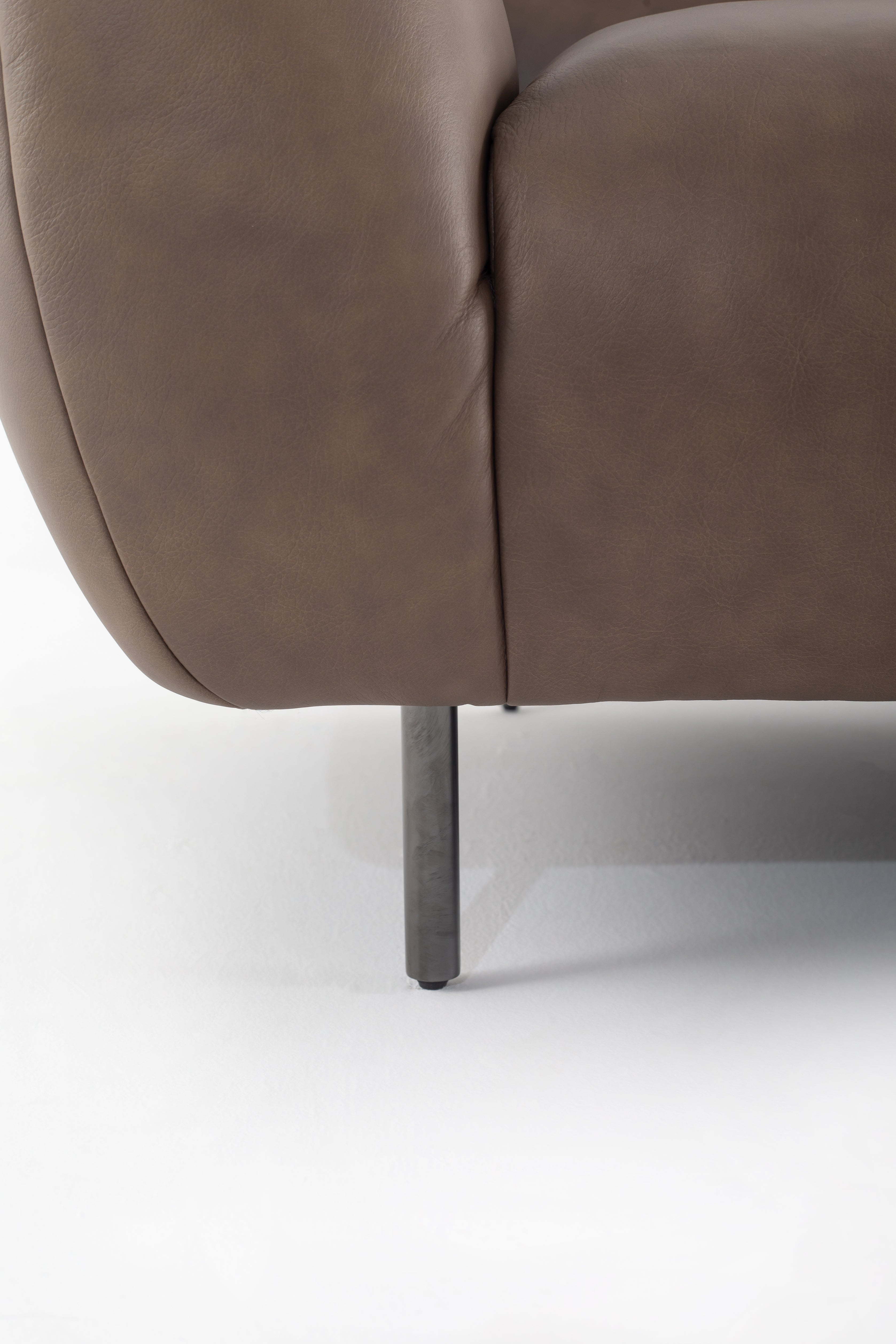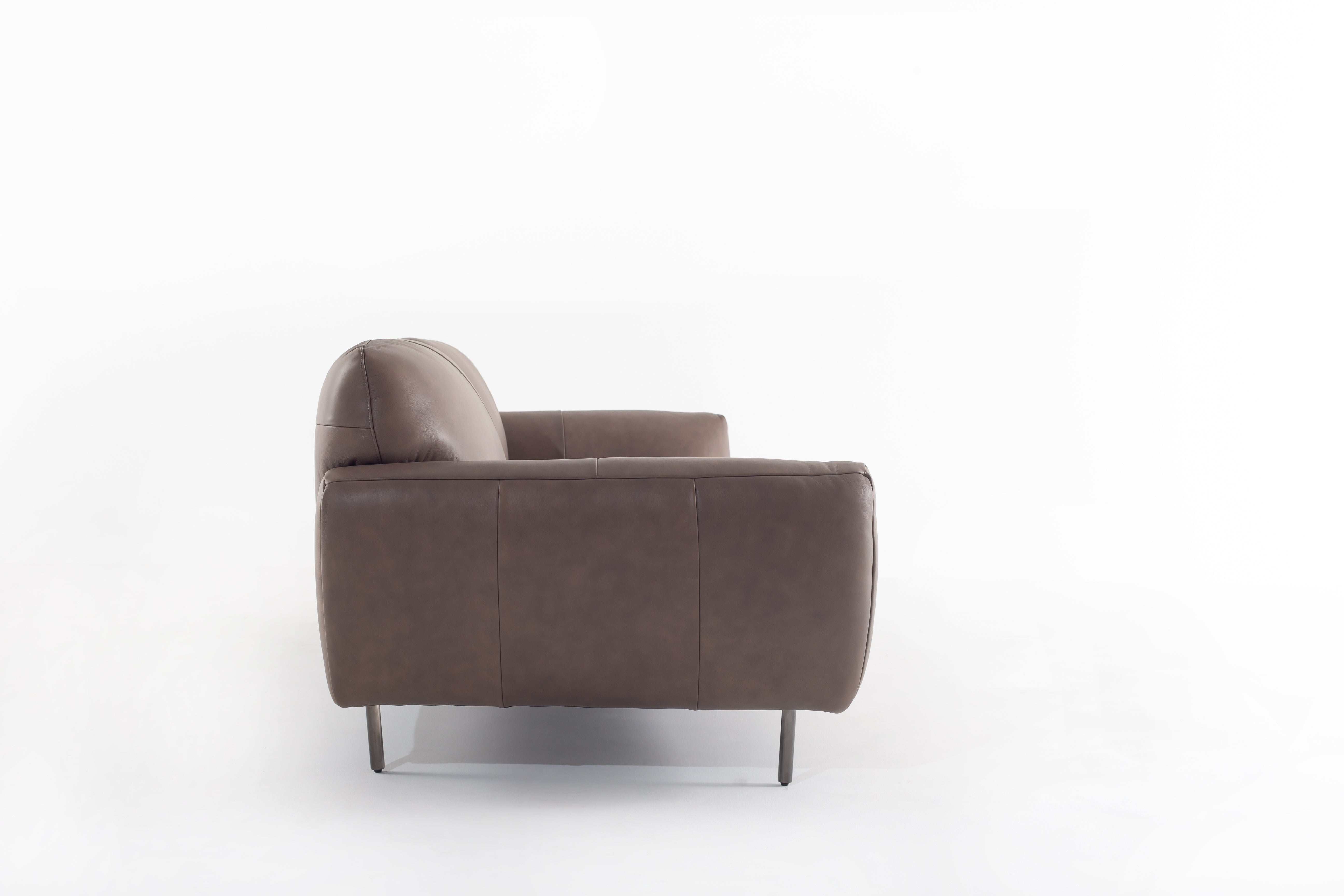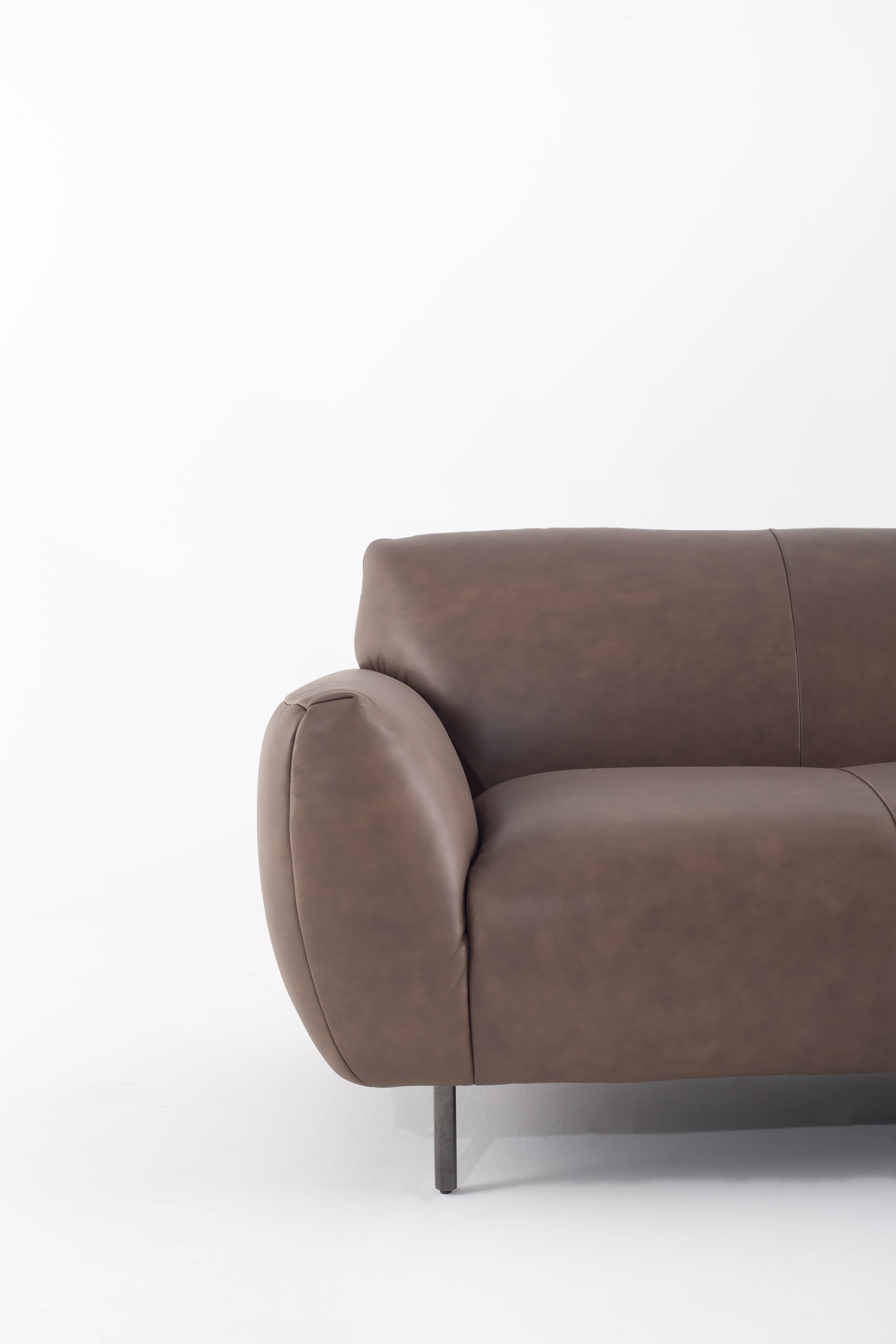 Wrapped in smooth cowhide leather, this sofa becomes the heart of your living space with its curved silhouette and plush seating. The earthy taupe hue complements any décor, while its wide, cushioned arms invite you to unwind in style. Resting on sleek metal legs, it brings a touch of modern elegance without sacrificing comfort. The supple texture and refined stitching showcase expert craftsmanship, making it a timeless addition to your home. Whether hosting guests or lounging solo, this sofa is a statement of luxury and sophistication.