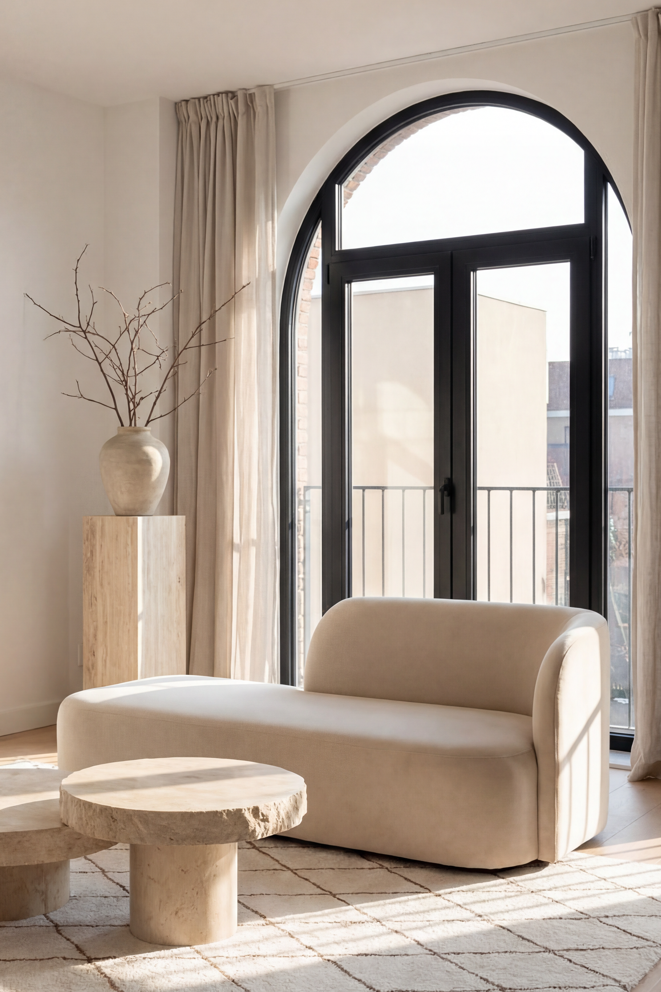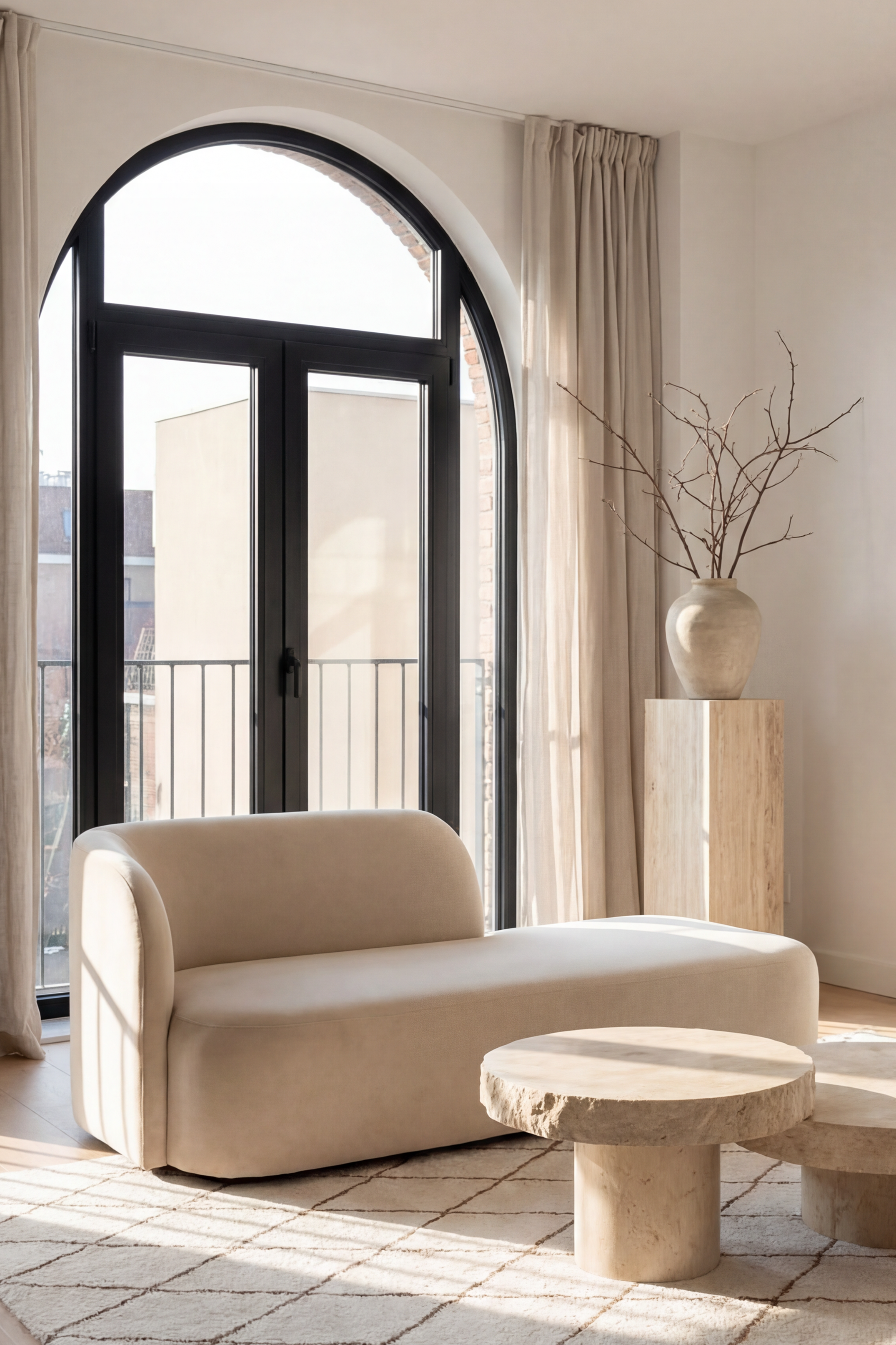Crafted for modern sophistication, this chaise sofa showcases a streamlined silhouette with a gently curved backrest, adding elegance to any living space. Its soft, beige upholstery exudes warmth and coziness, while the minimalist design complements both contemporary and classic interiors. Ideal for lounging or as a statement piece, the chaise offers premium comfort and style in a compact form.