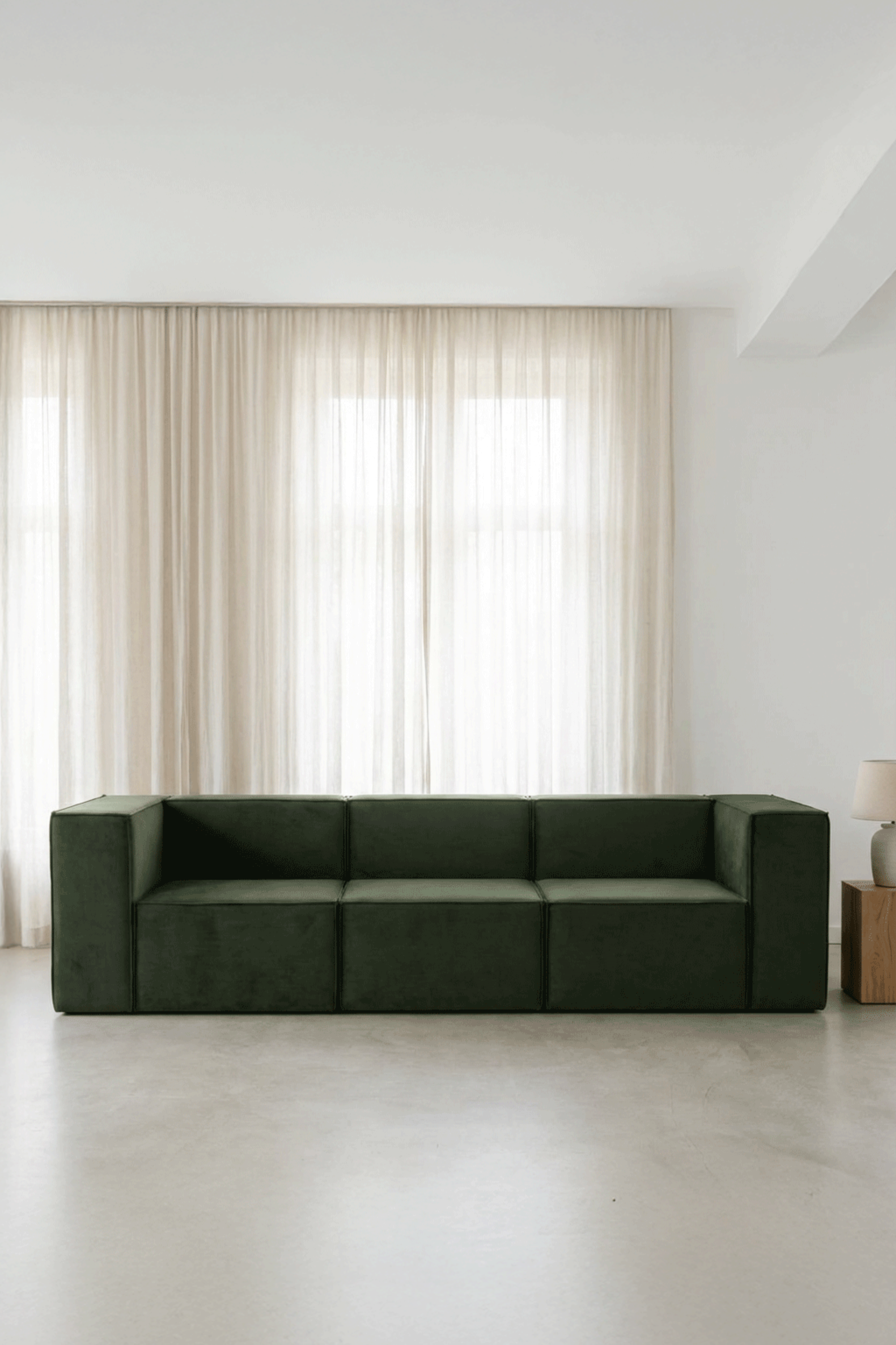 This modern three seat retreat surrounds you with its rich deep green fabric and sculptural clean lines, creating a refined statement that feels both grounding and effortlessly luxe. Its modular build offers versatility for evolving spaces while the generous, supportive cushions invite everyday comfort, making it a sophisticated centerpiece that elevates the atmosphere of any room.