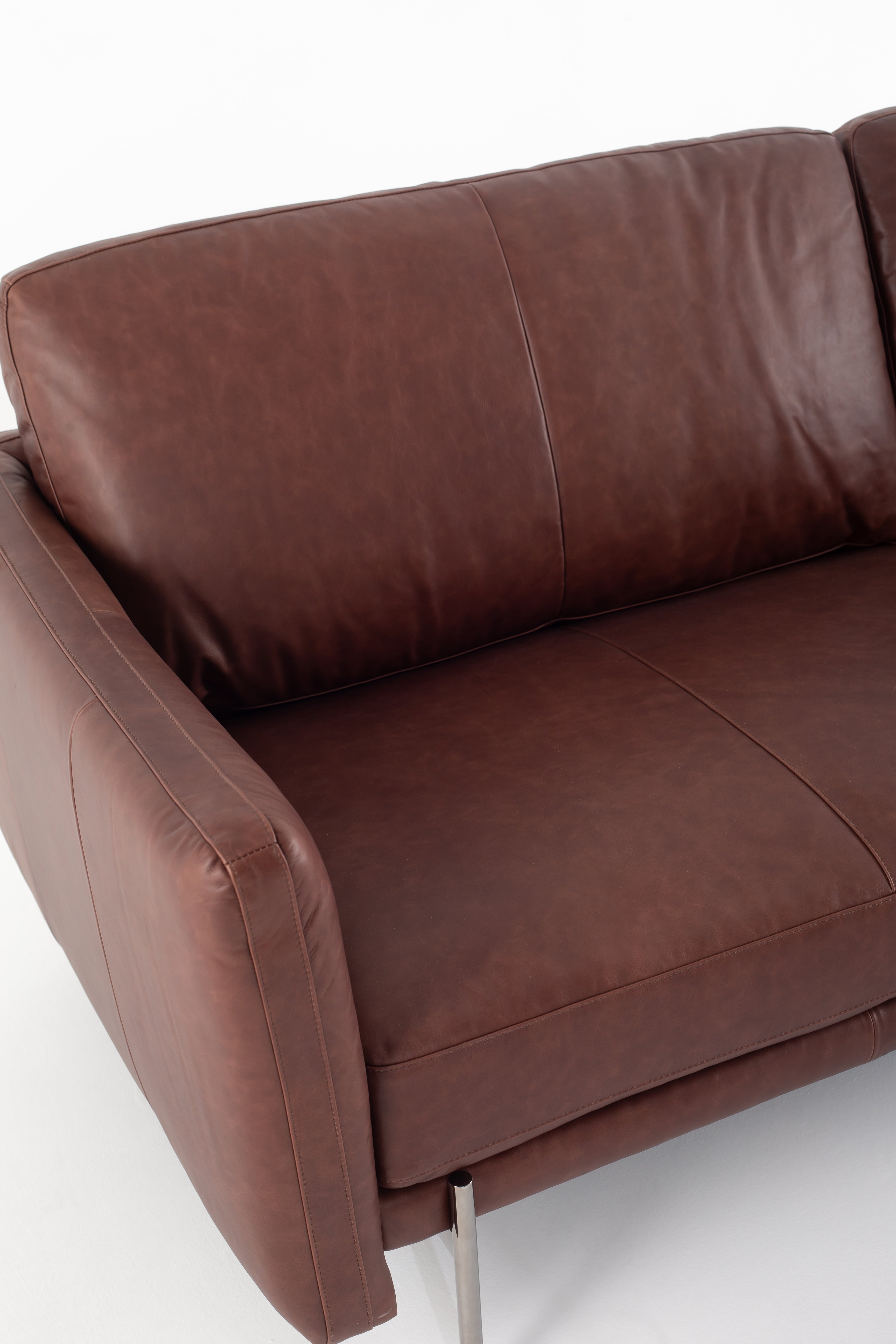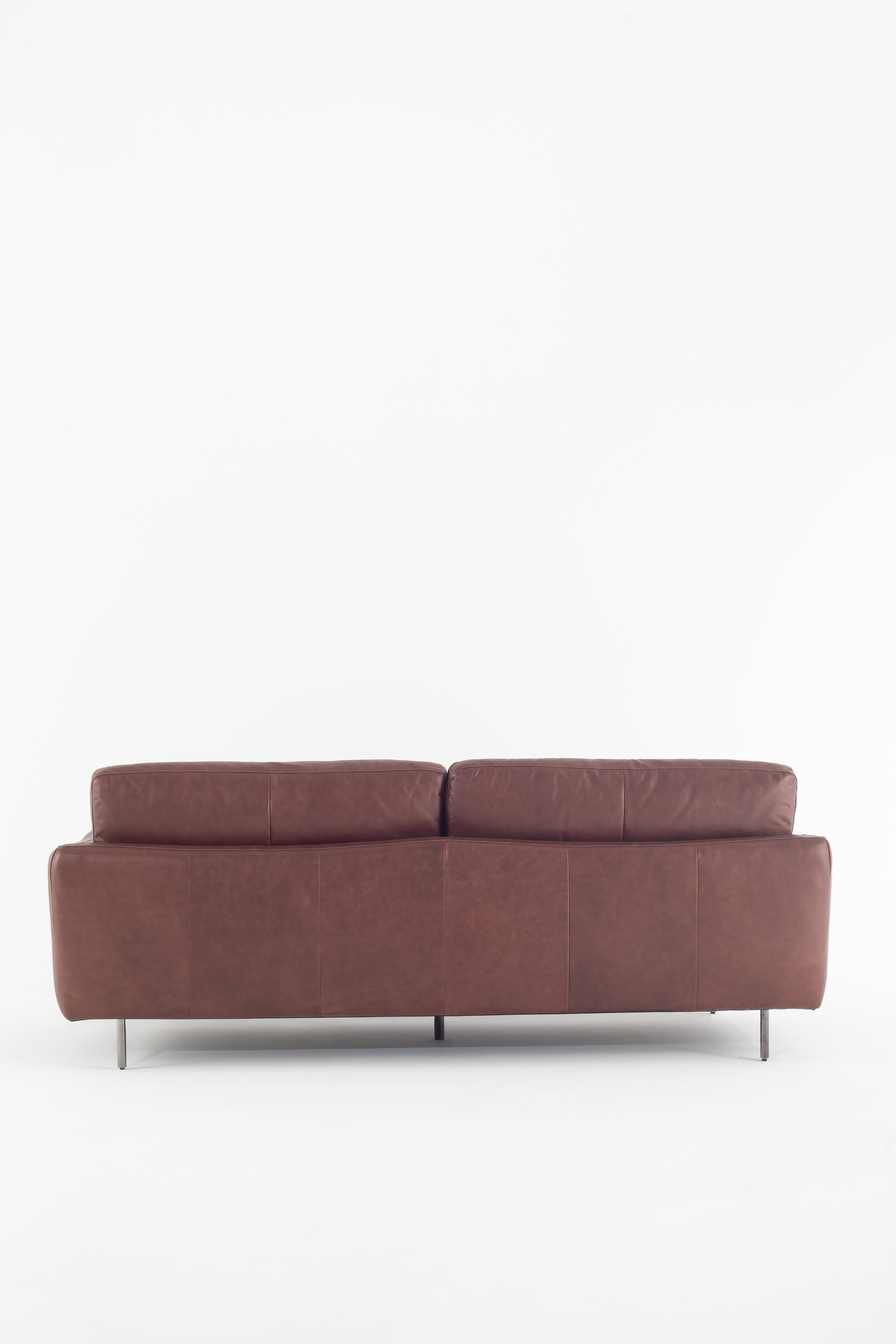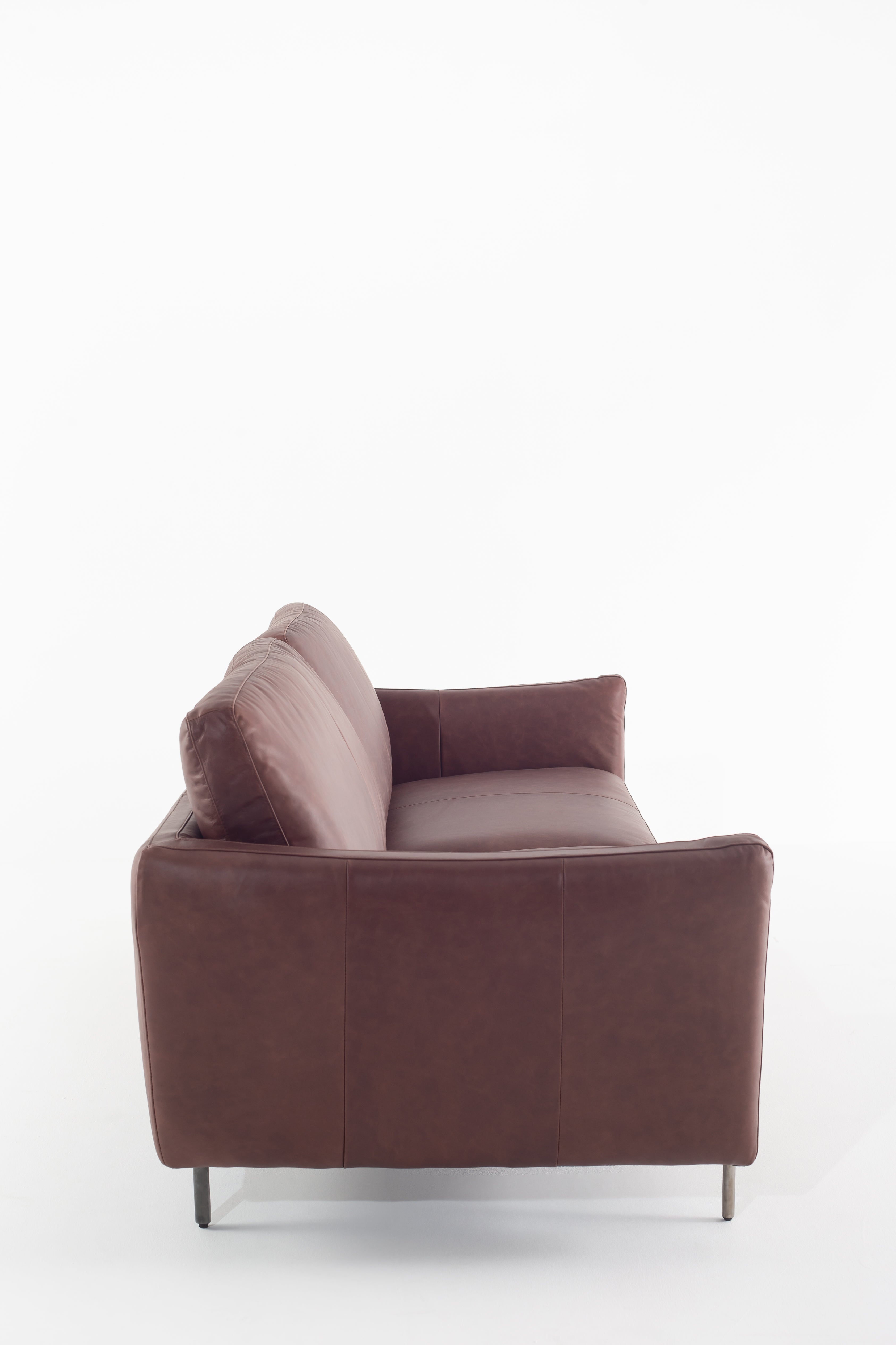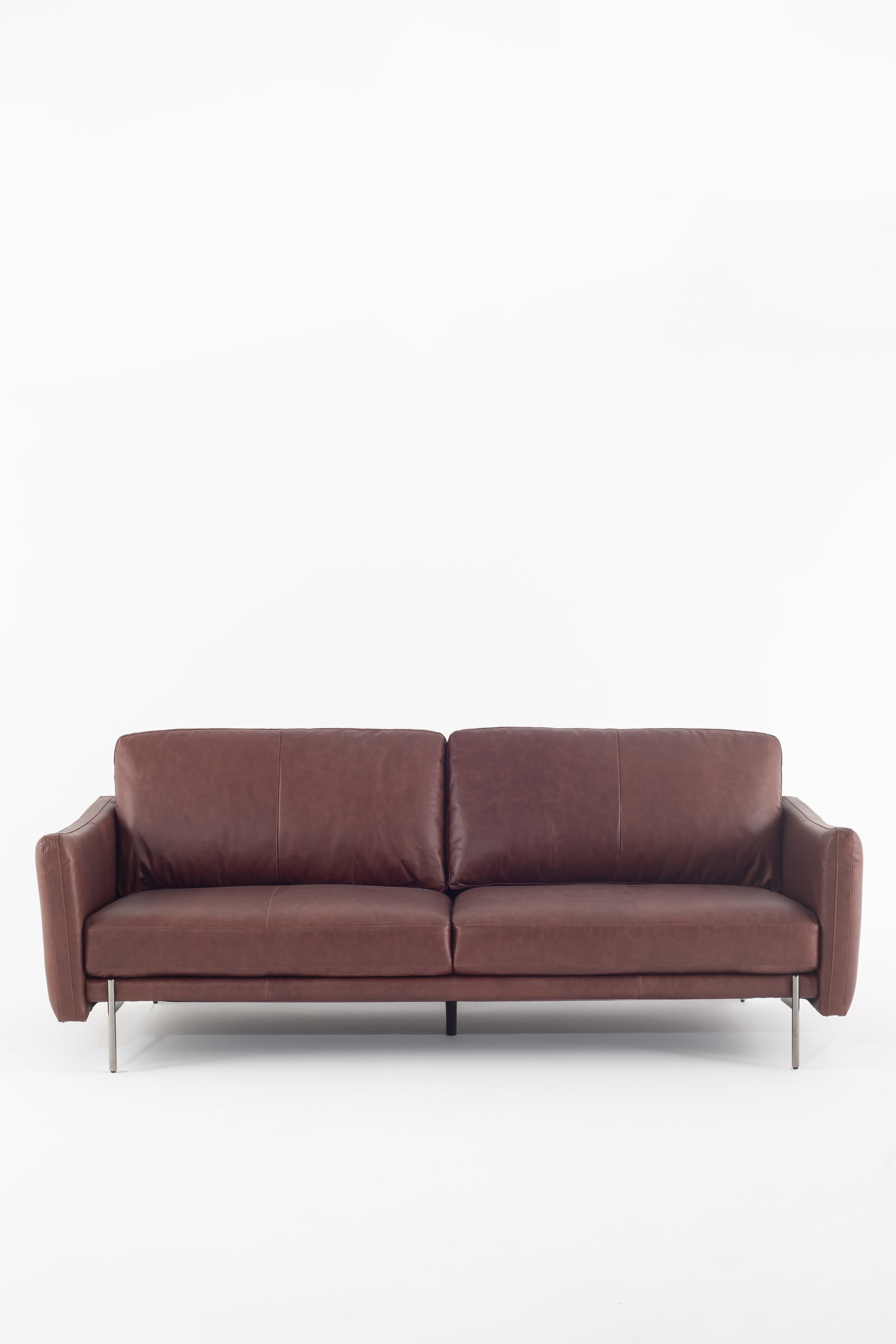 Immerse yourself in the luxury of full-grain cowhide leather with this modern sofa, designed for both elegance and comfort. The rich brown leather upholstery exudes warmth, while the smooth texture enhances its refined appeal. Deep, plush cushions provide superior support, making every seat an inviting retreat. Slim metal legs contrast beautifully with the soft leather, creating a sleek and contemporary silhouette. Whether in a minimalist loft or a classic living space, this premium leather sofa brings timeless sophistication and lasting durability.
