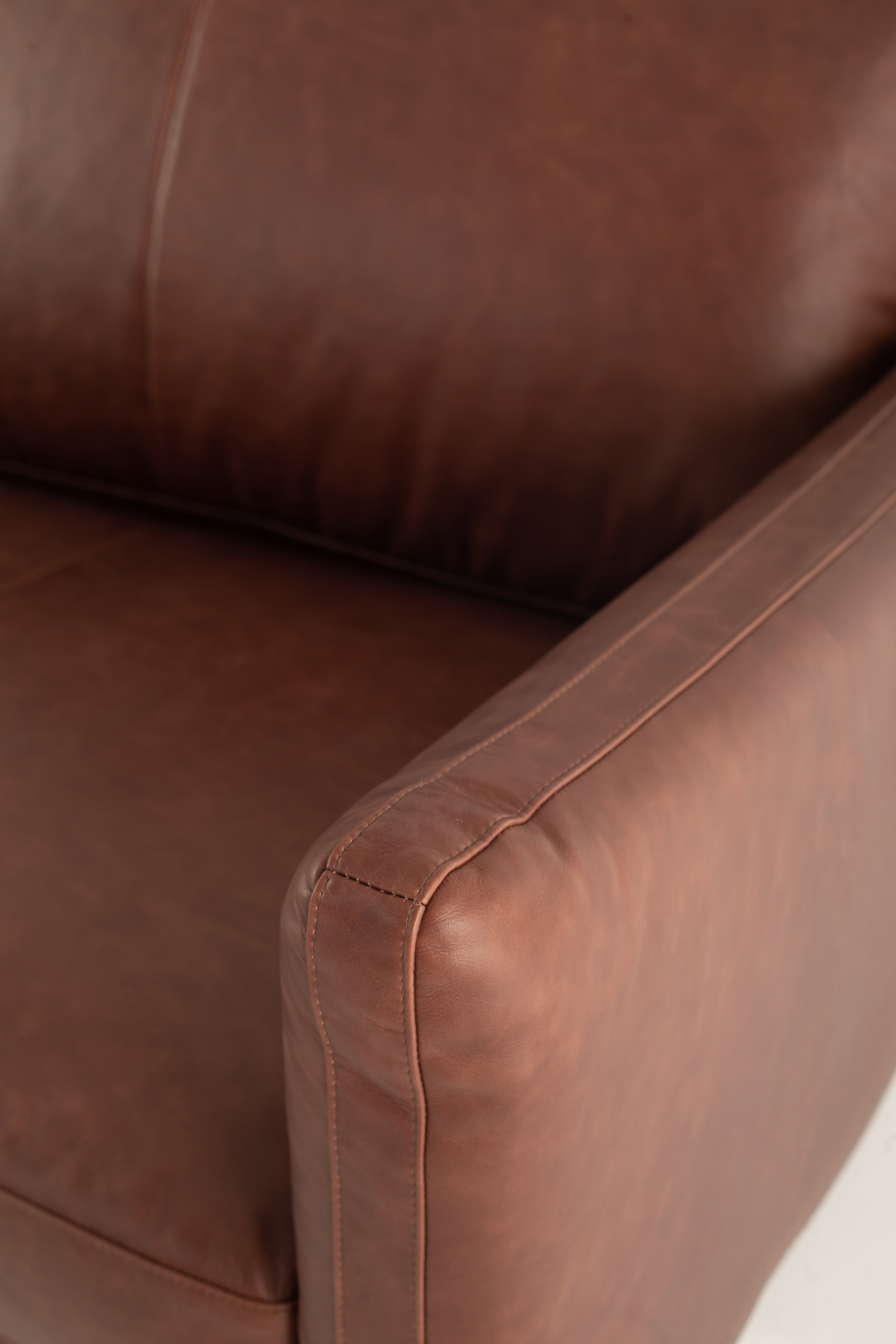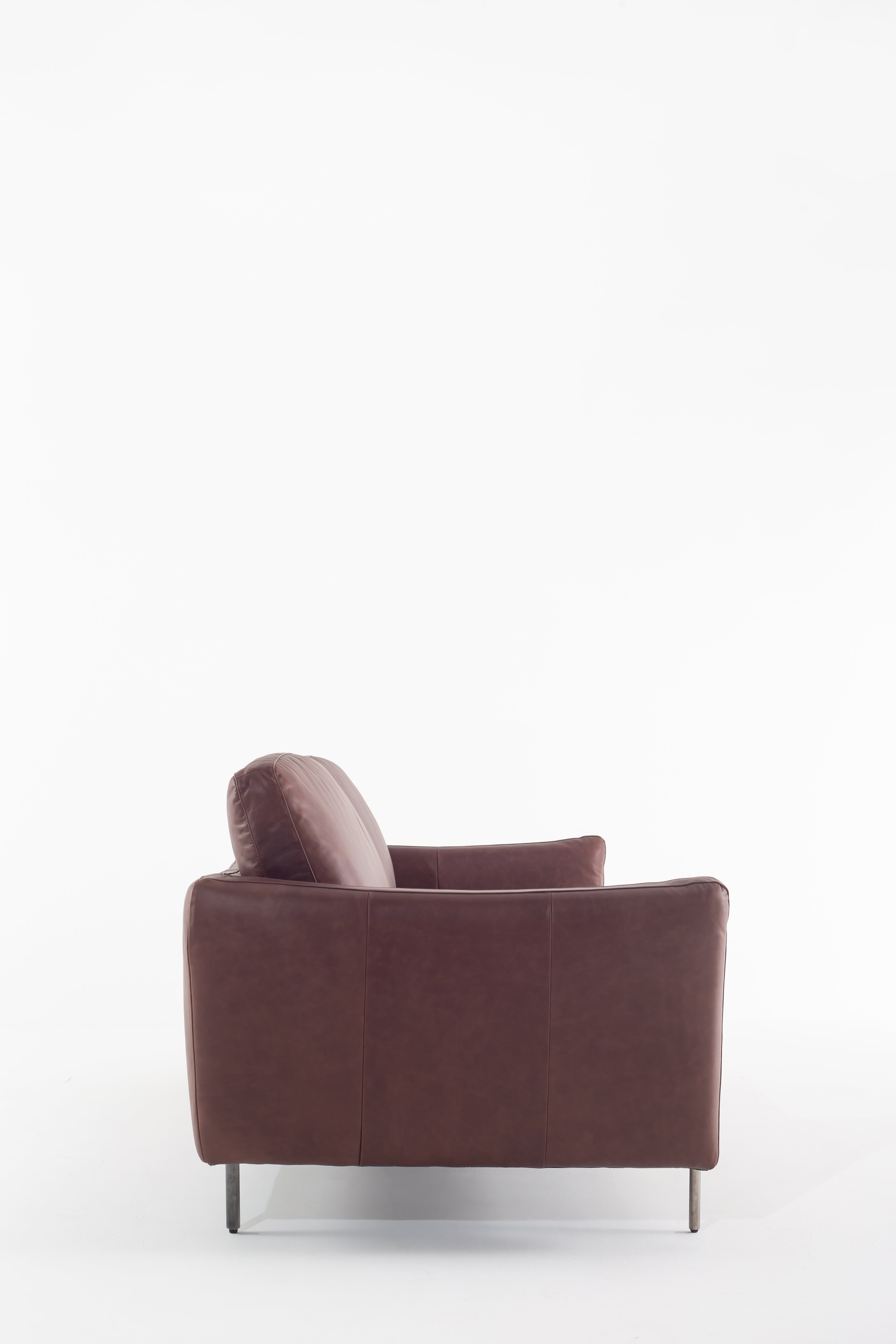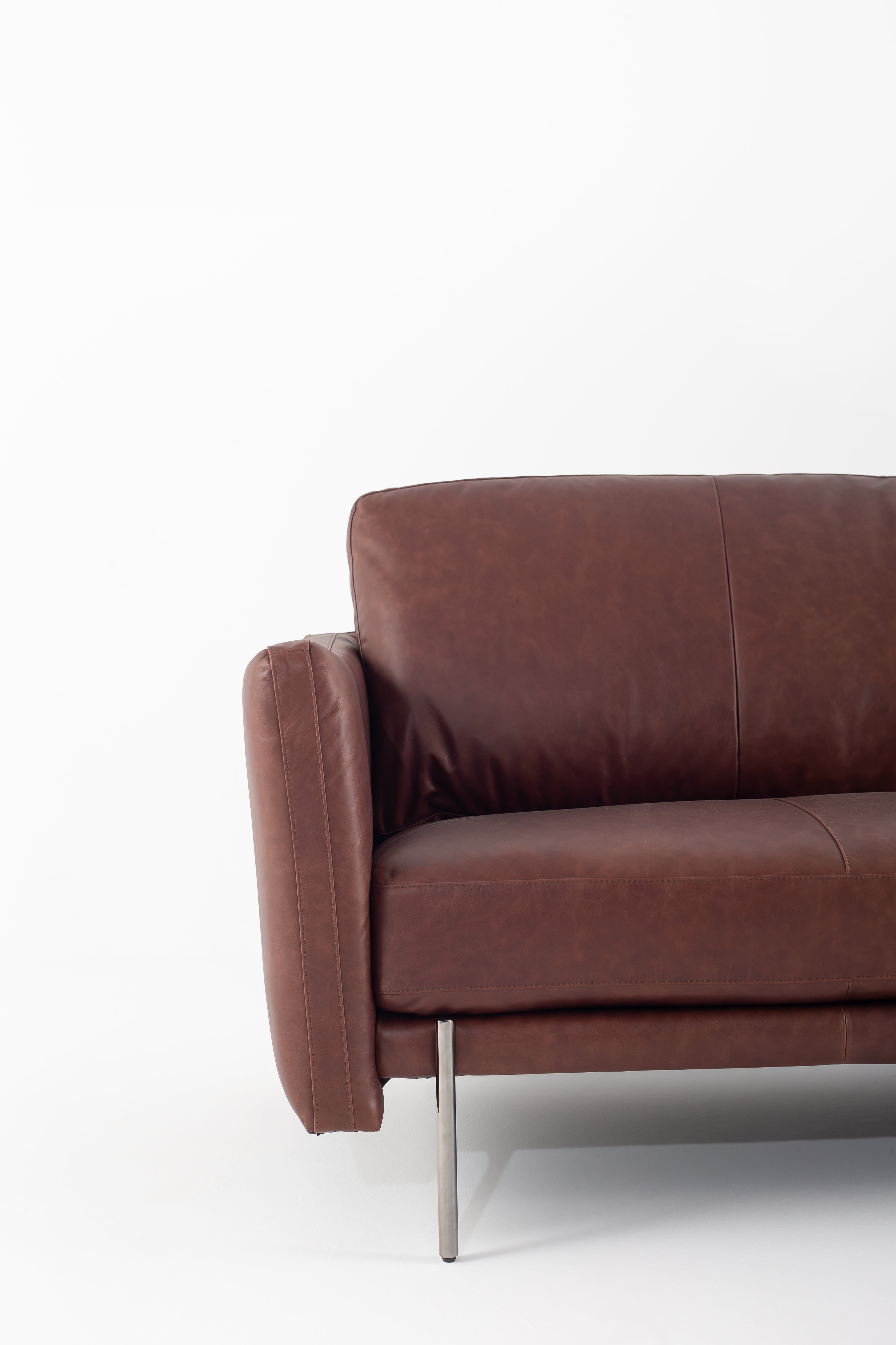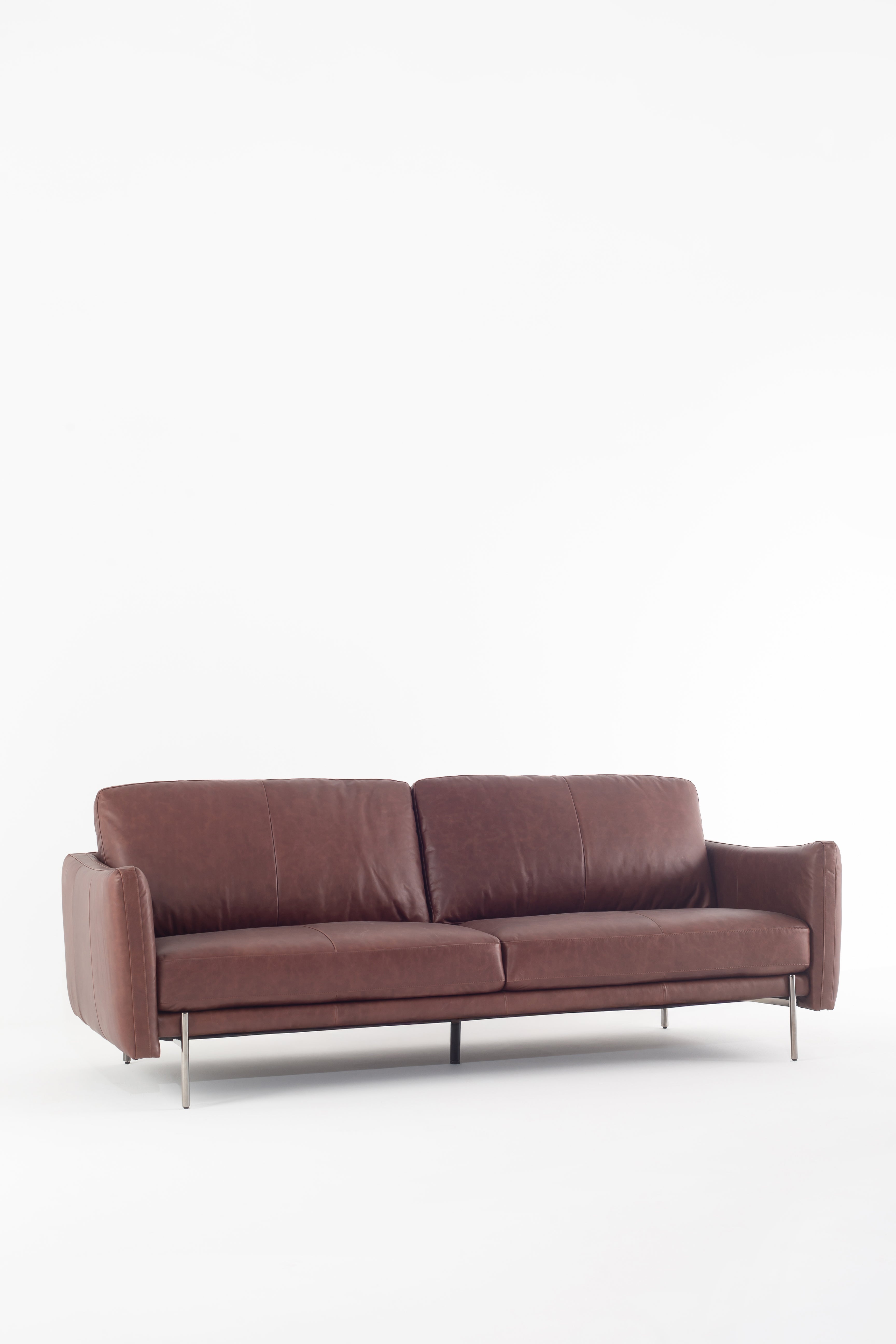 Immerse yourself in the luxury of full-grain cowhide leather with this modern sofa, designed for both elegance and comfort. The rich brown leather upholstery exudes warmth, while the smooth texture enhances its refined appeal. Deep, plush cushions provide superior support, making every seat an inviting retreat. Slim metal legs contrast beautifully with the soft leather, creating a sleek and contemporary silhouette. Whether in a minimalist loft or a classic living space, this premium leather sofa brings timeless sophistication and lasting durability.
