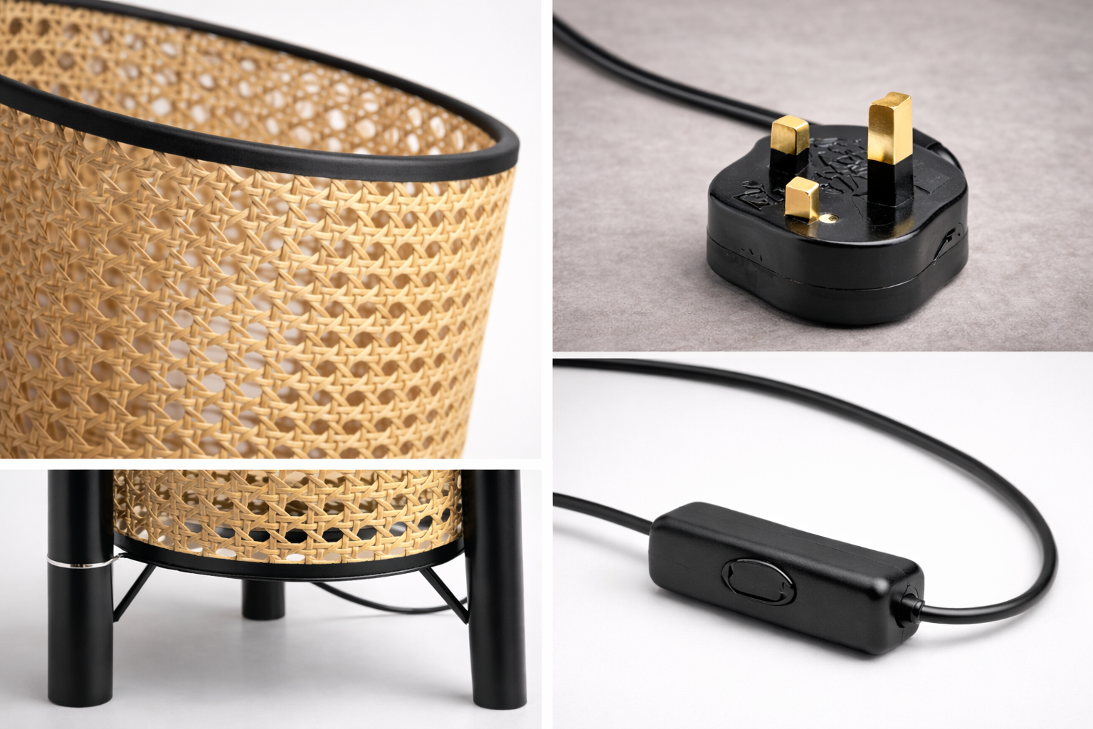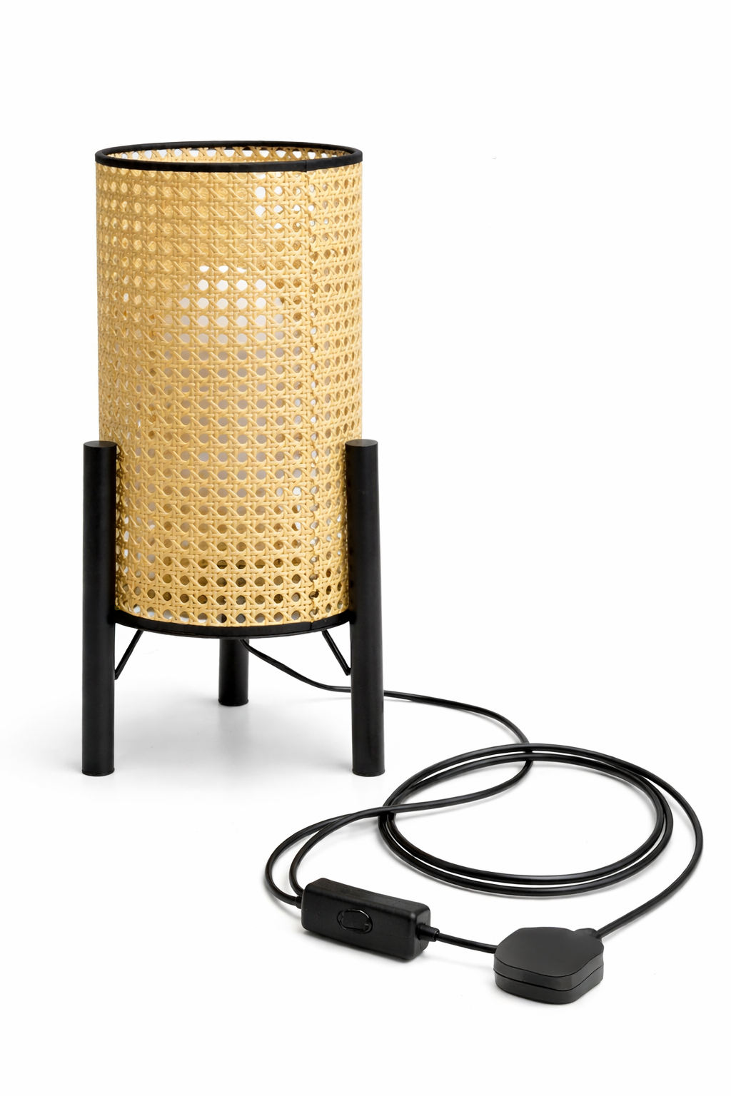 A warm and refined accent for modern interiors, this table lamp blends natural woven texture with a sleek black frame for a look that feels effortlessly curated. The airy shade softens the light into a gentle glow, creating a cozy ambience for bedside tables, console styling, and living room corners.