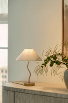 A refined fusion of sculptural form and functional elegance. Designed with a gracefully curved metal stem and anchored by a lustrous gold base, this artistic table lamp becomes an eye-catching centerpiece on any nightstand, console, or side table. Topped with a wide, conical fabric shade, it casts a warm, diffused glow that enhances cozy reading corners or sophisticated workspaces. The smooth gold finish adds a layer of opulence, while the organic silhouette lends a modern artistic touch. As the curator of your home’s aesthetic, this table lamp lets you illuminate with both purpose and style.