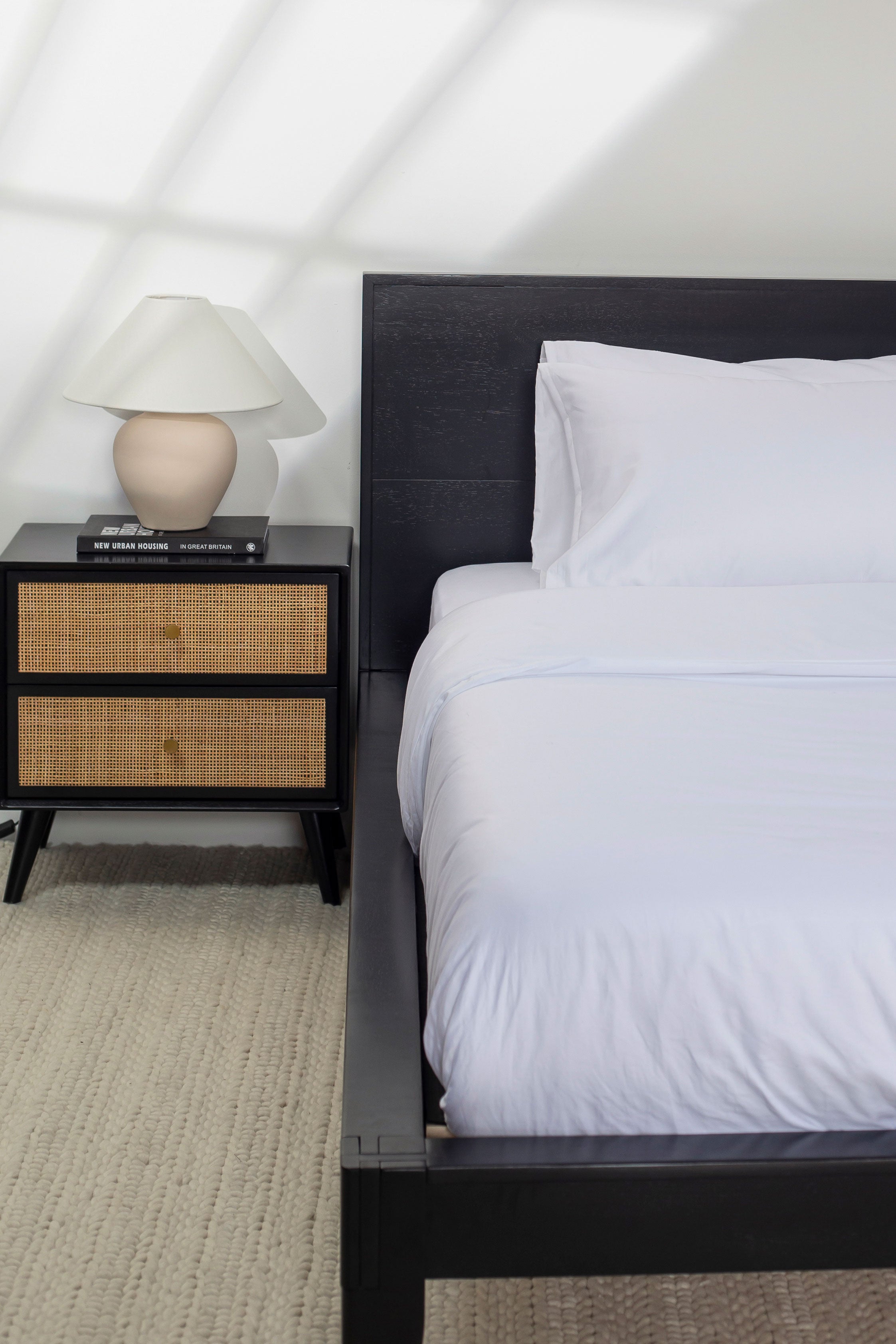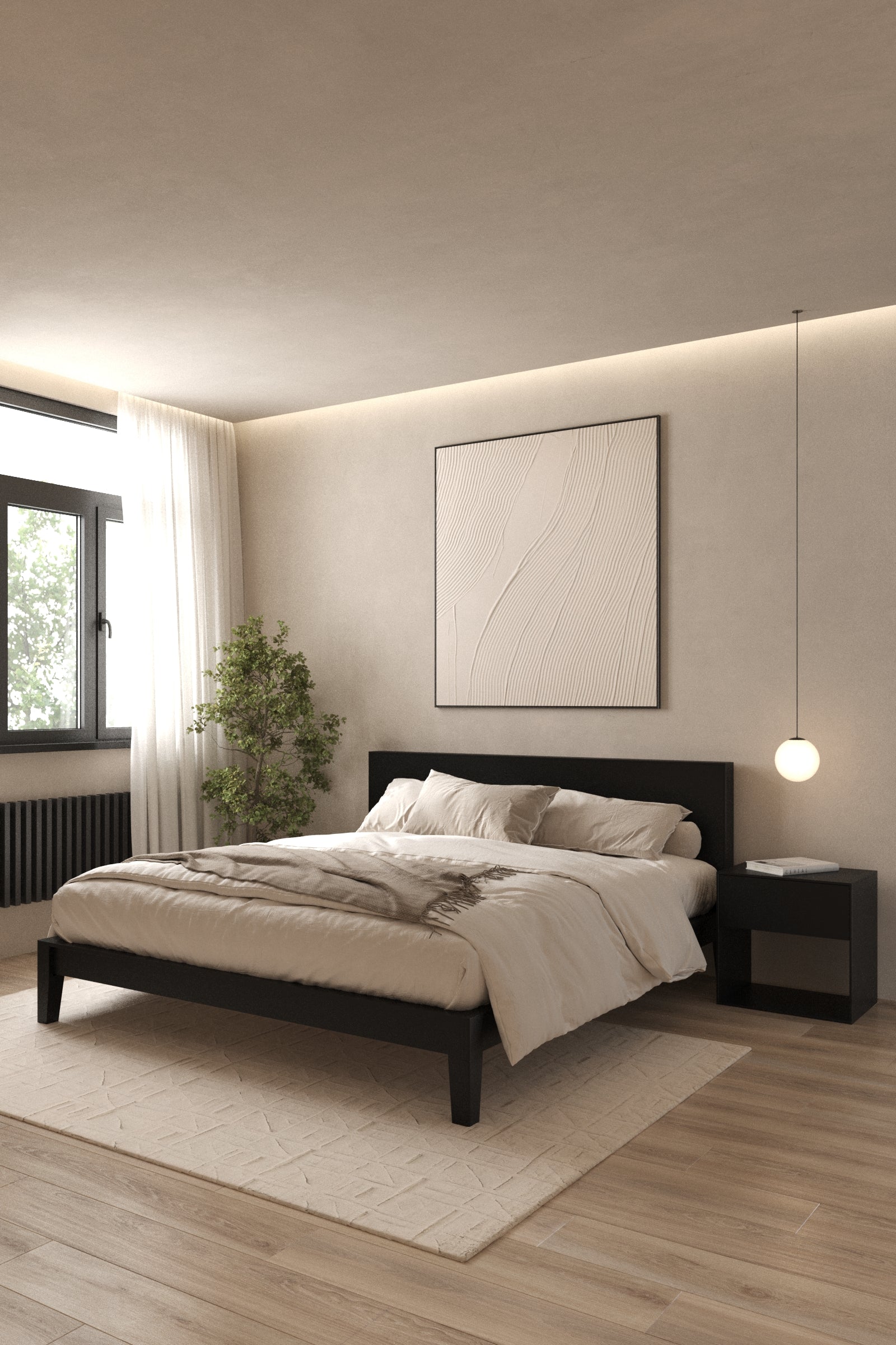 This Bed showcases minimalist elegance and superior craftsmanship. Crafted from finger joint rubber wood and E2 plywood, its bold black finish highlights its smooth texture and clean lines, creating a striking yet versatile centerpiece for modern interiors. The sleek headboard and sturdy low-profile frame are inspired by traditional Japanese joinery techniques, combining strength with understated beauty. Perfect for contemporary, industrial, or zen-inspired spaces, this bed is designed to make a timeless statement while offering durability and sophistication.