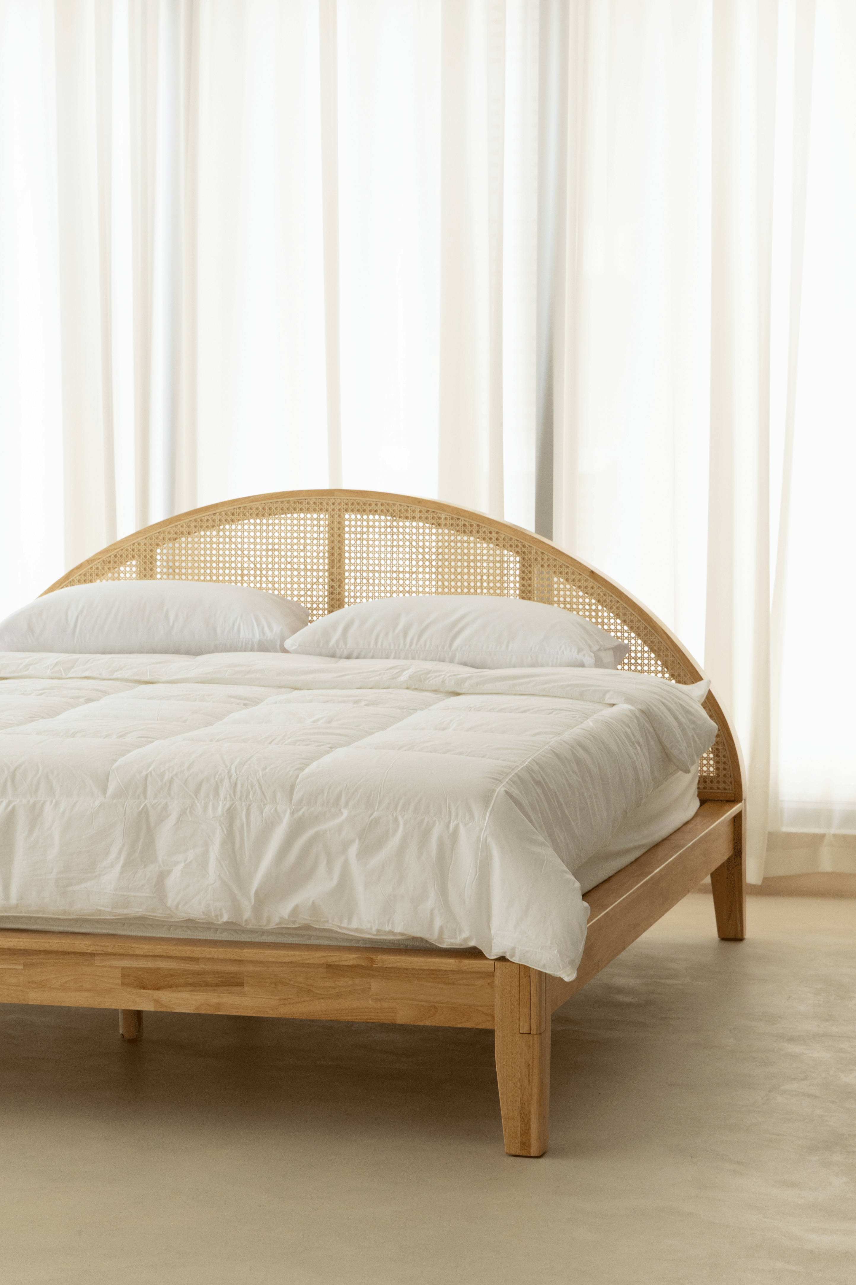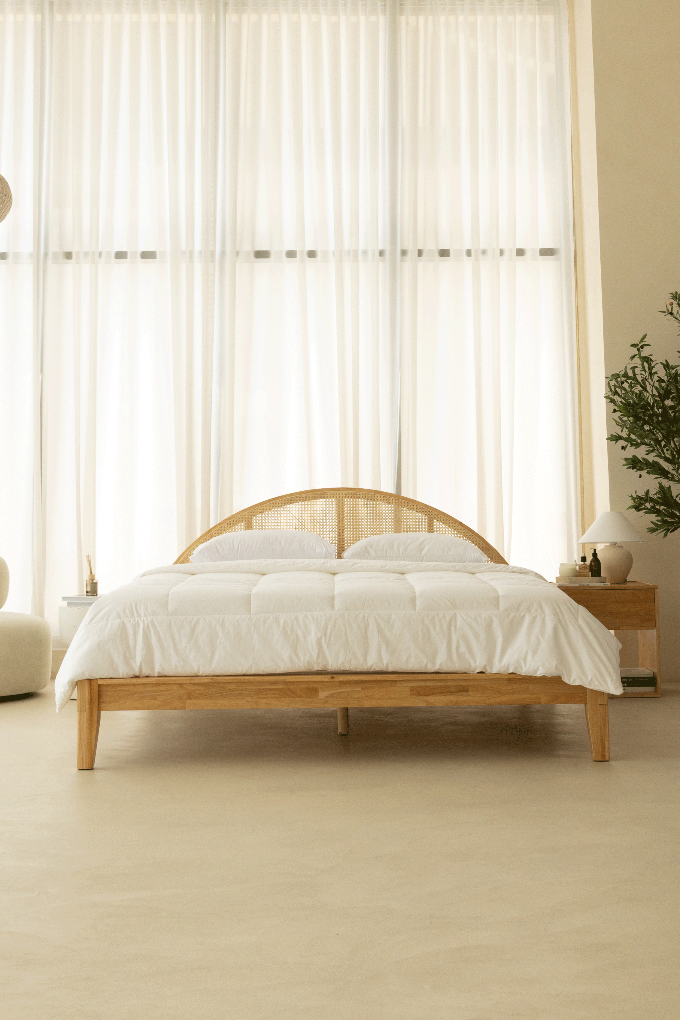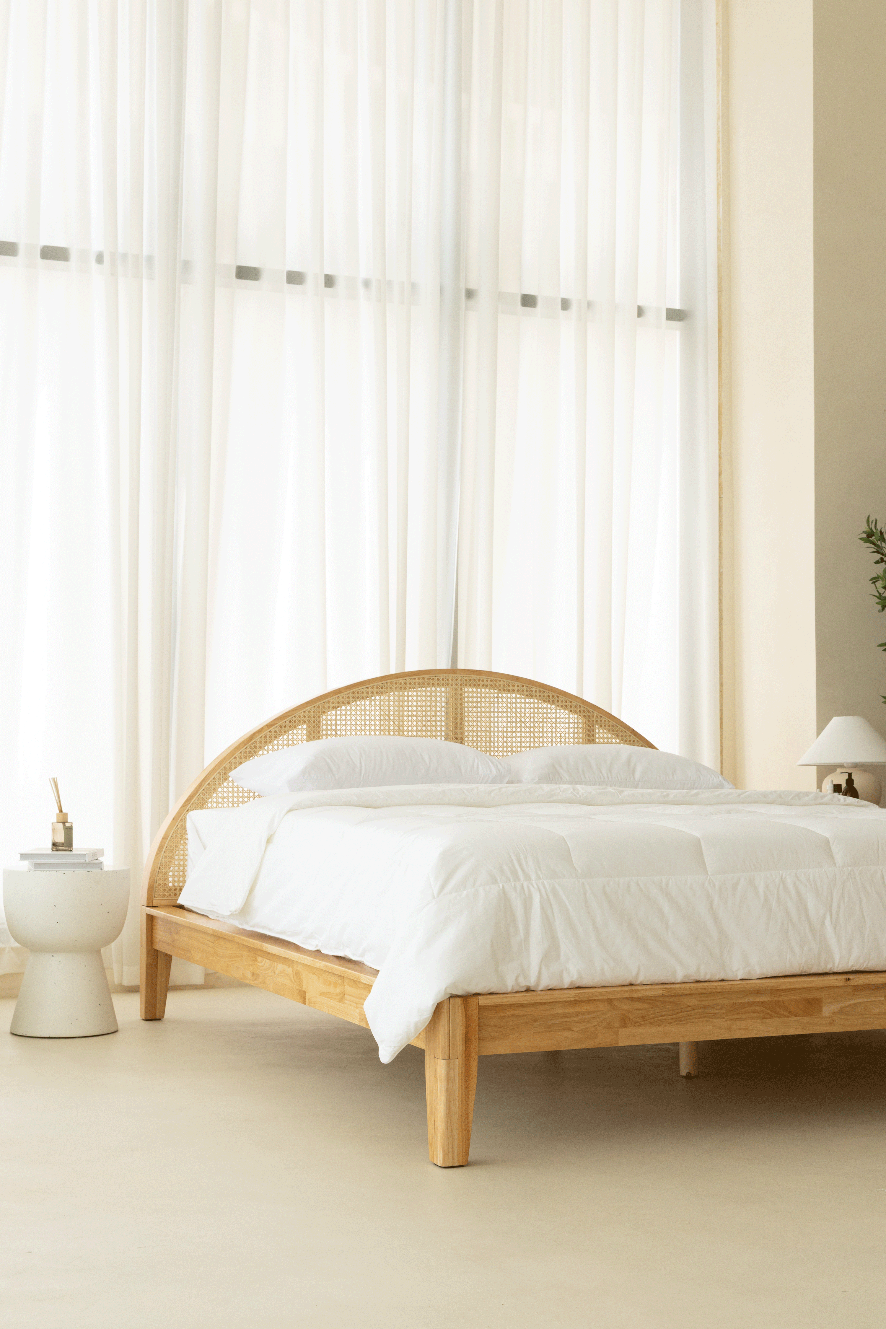 Breathe light and serenity into your bedroom with a softly arch rattan headboard framed in warm light wood that radiates natural calm. The smooth grain and airy tone create a soothing balance, while the rattan weave adds gentle texture and organic warmth. Crafted with meticulous Japanese joinery, the frame feels seamless and enduring, merging strength with refined elegance. Every detail reflects thoughtful craftsmanship and minimalist design, perfect for Japandi, bohemian, or Scandinavian-inspired spaces. This bed invites you to unwind in a setting of grace, texture, and tranquil sophistication.