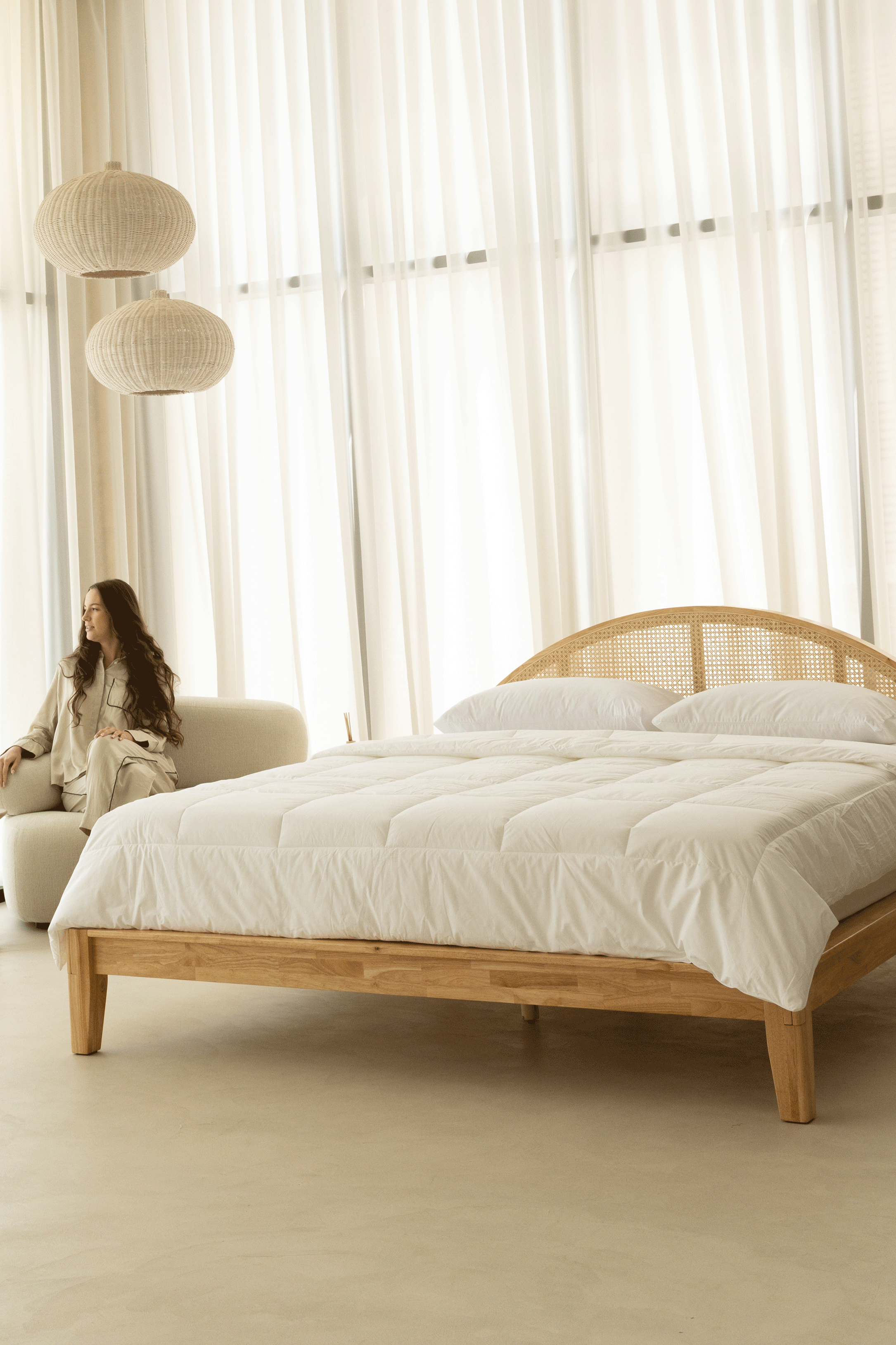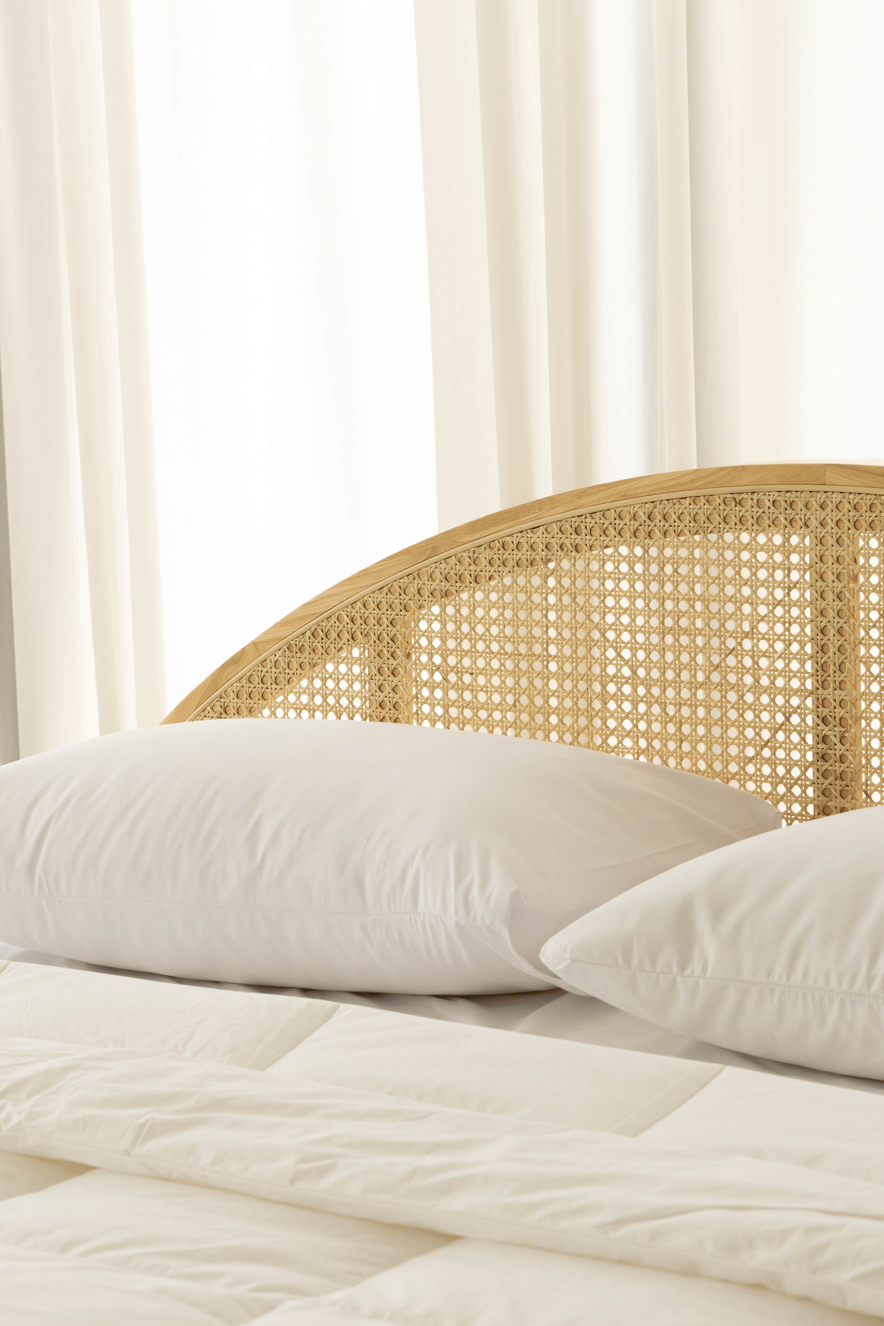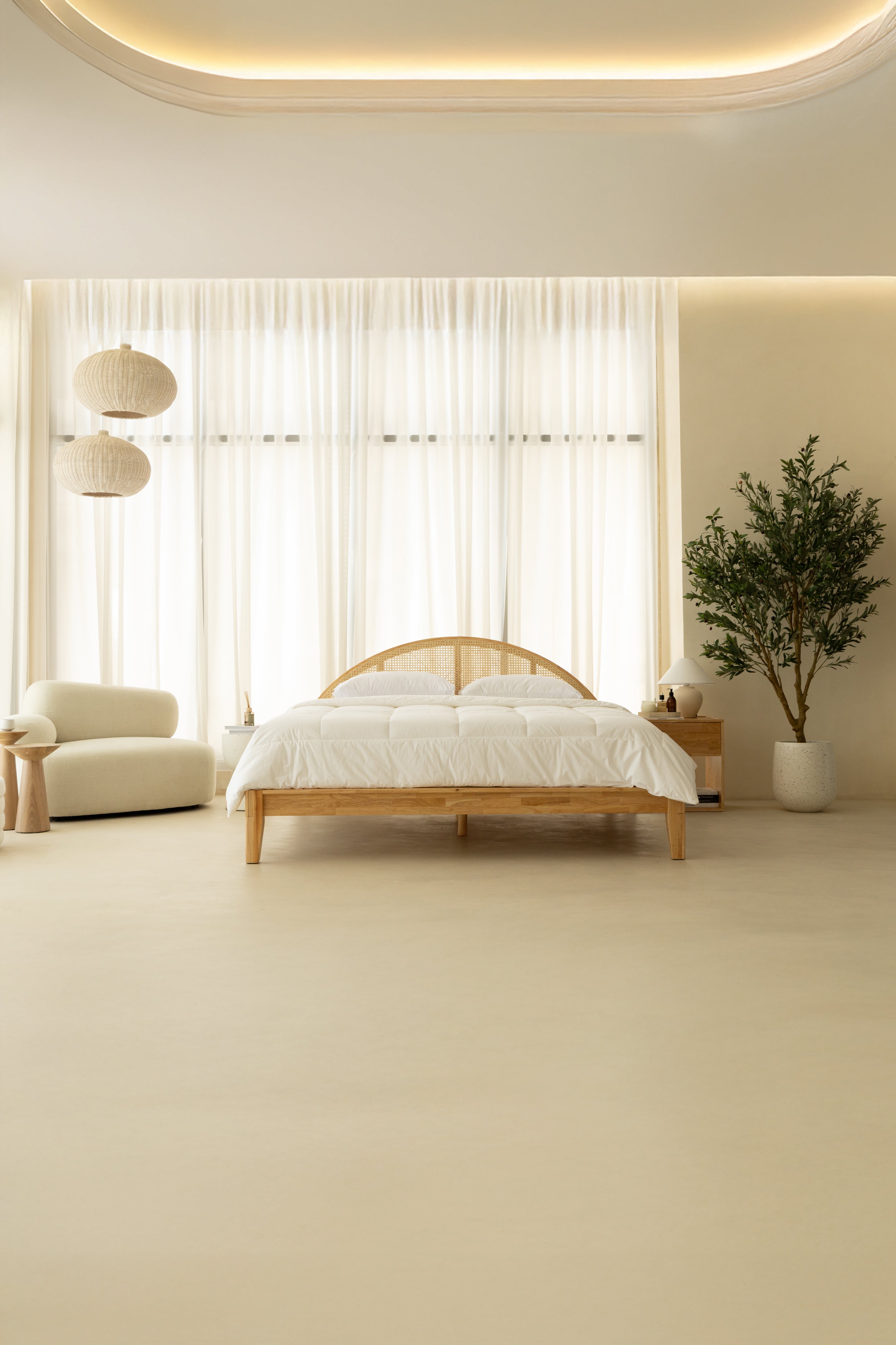 Breathe light and serenity into your bedroom with a softly arch rattan headboard framed in warm light wood that radiates natural calm. The smooth grain and airy tone create a soothing balance, while the rattan weave adds gentle texture and organic warmth. Crafted with meticulous Japanese joinery, the frame feels seamless and enduring, merging strength with refined elegance. Every detail reflects thoughtful craftsmanship and minimalist design, perfect for Japandi, bohemian, or Scandinavian-inspired spaces. This bed invites you to unwind in a setting of grace, texture, and tranquil sophistication.