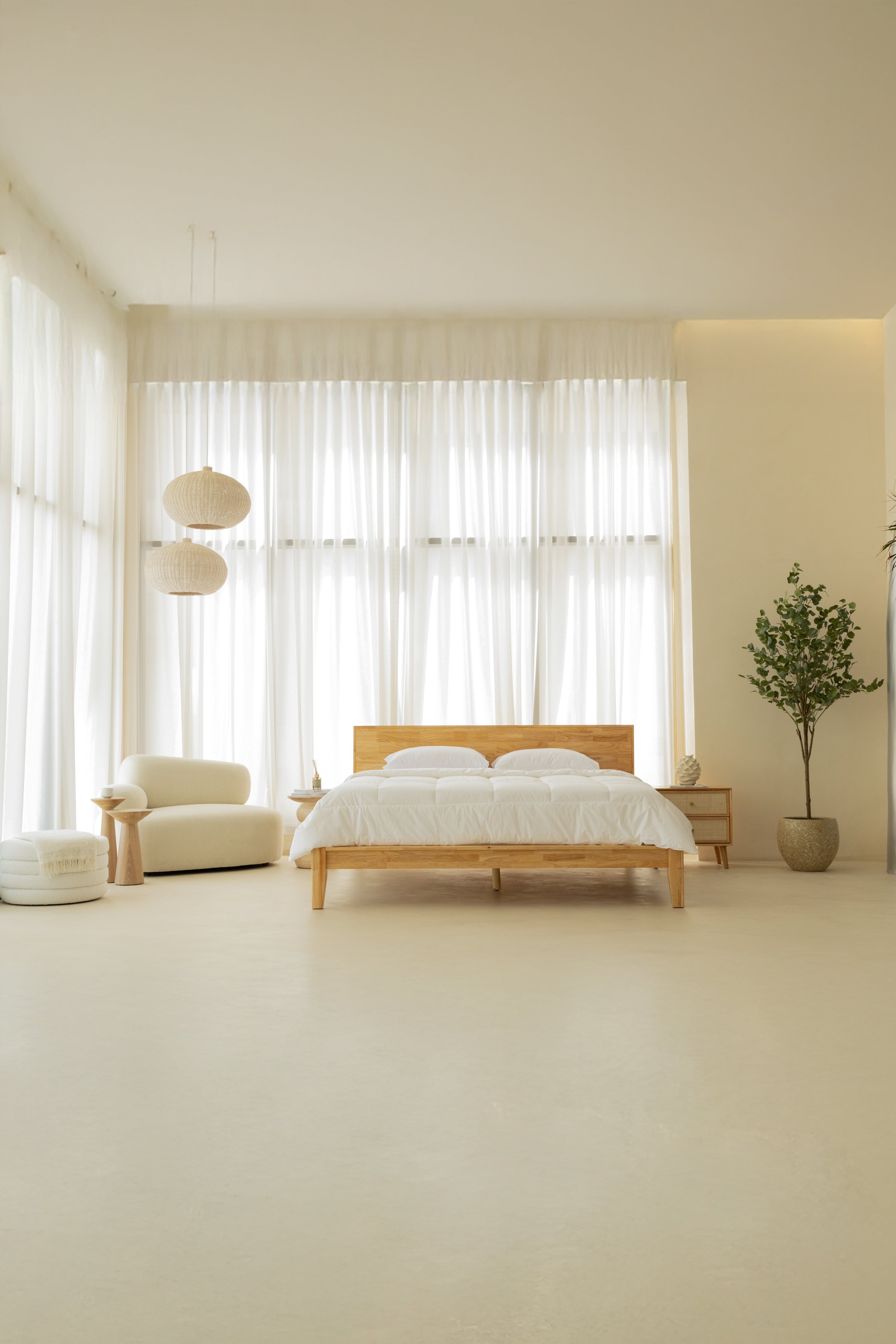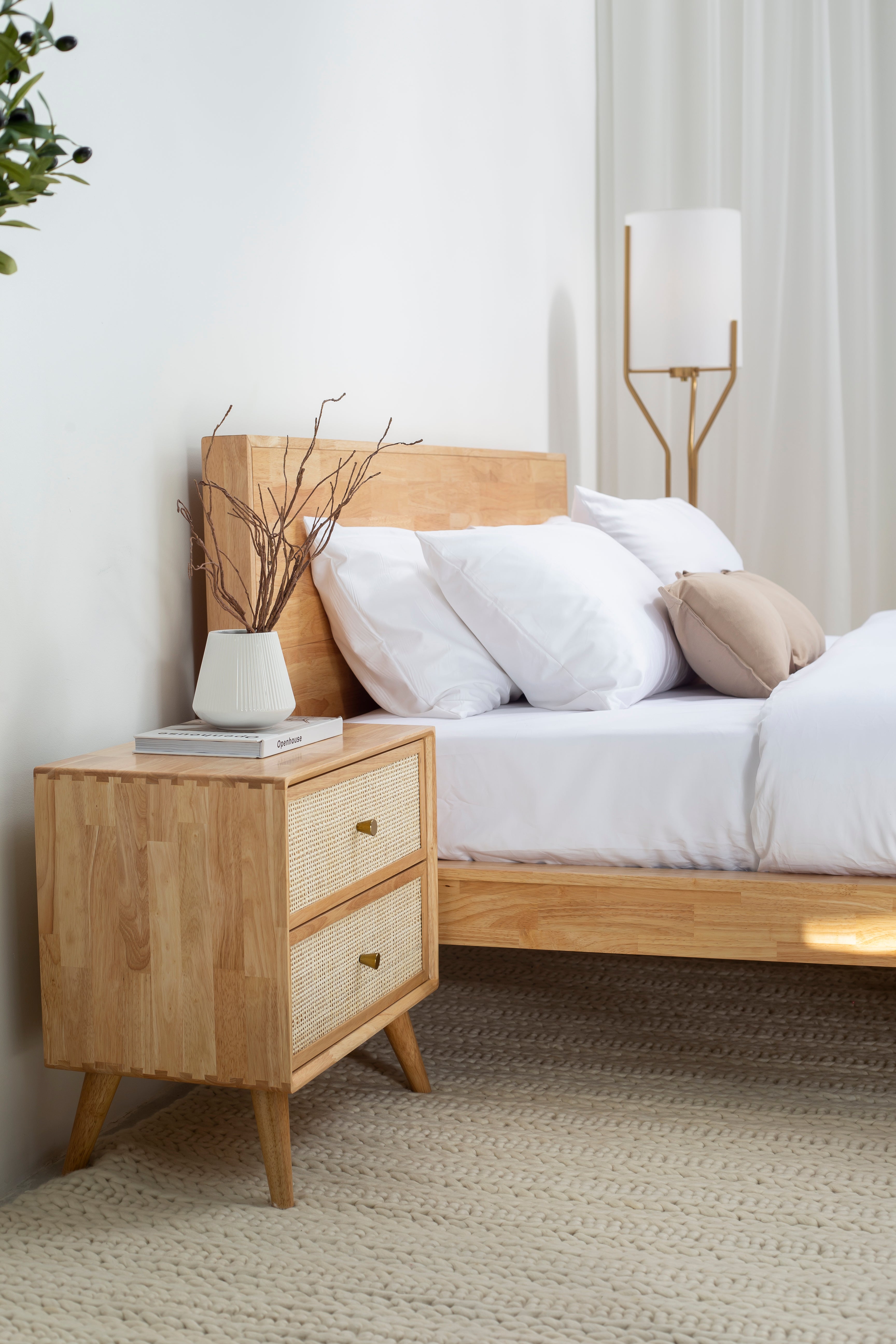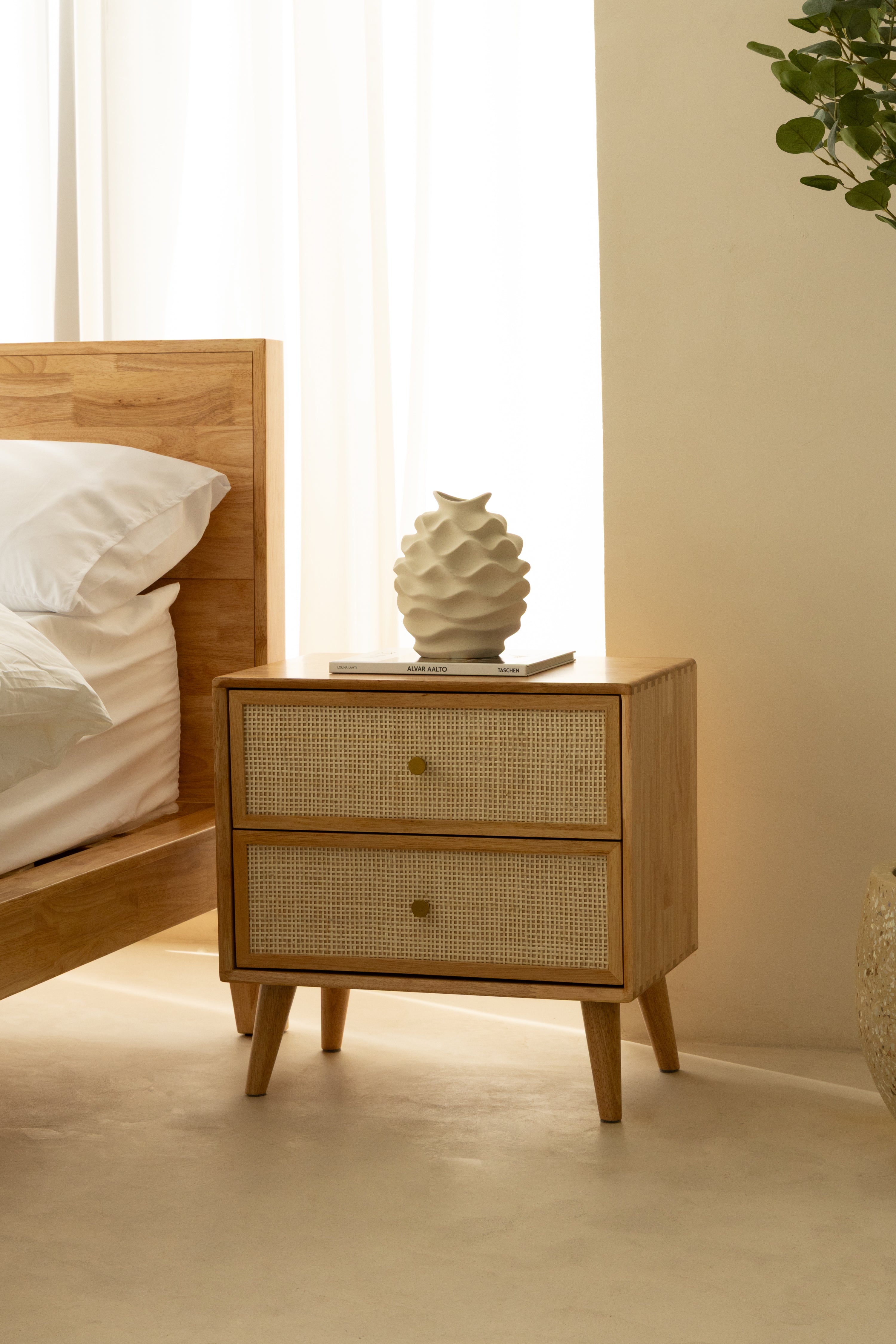 The Rin Rattan Light Wood Bedside Table exudes natural elegance with its refined craftsmanship and timeless design. Constructed from premium rubberwood, its light wood finish boasts smooth textures and warm tones that blend seamlessly into any modern or bohemian decor. The two spacious drawers are adorned with intricate natural rattan inlays, framed by sleek MDF veneer, offering a balance of durability and aesthetic appeal. Its clean, rectangular shape sits gracefully on slightly tapered legs, adding a touch of mid-century sophistication. Perfect for storing essentials while enhancing your bedroom’s ambiance, this bedside table combines function and style effortlessly.