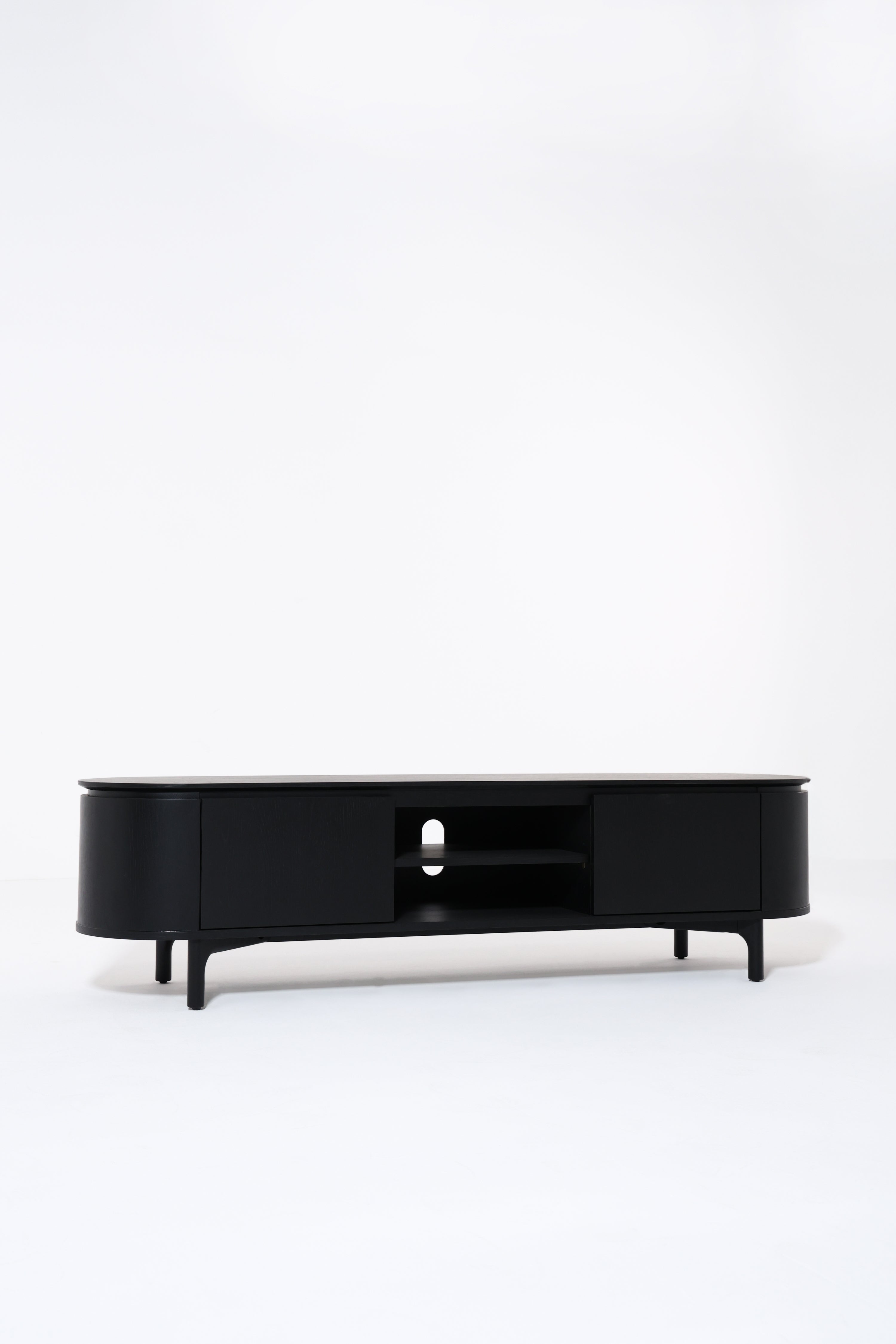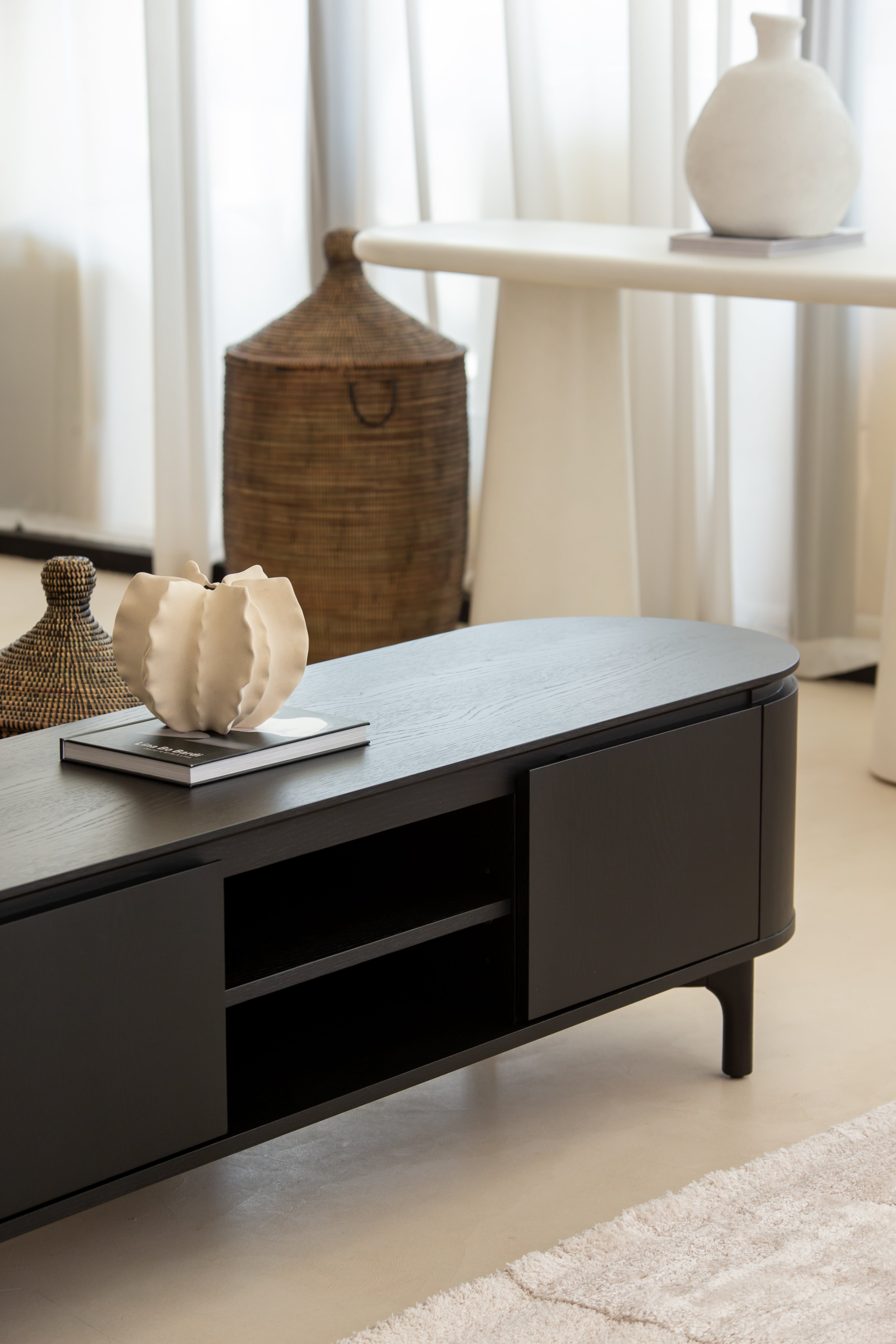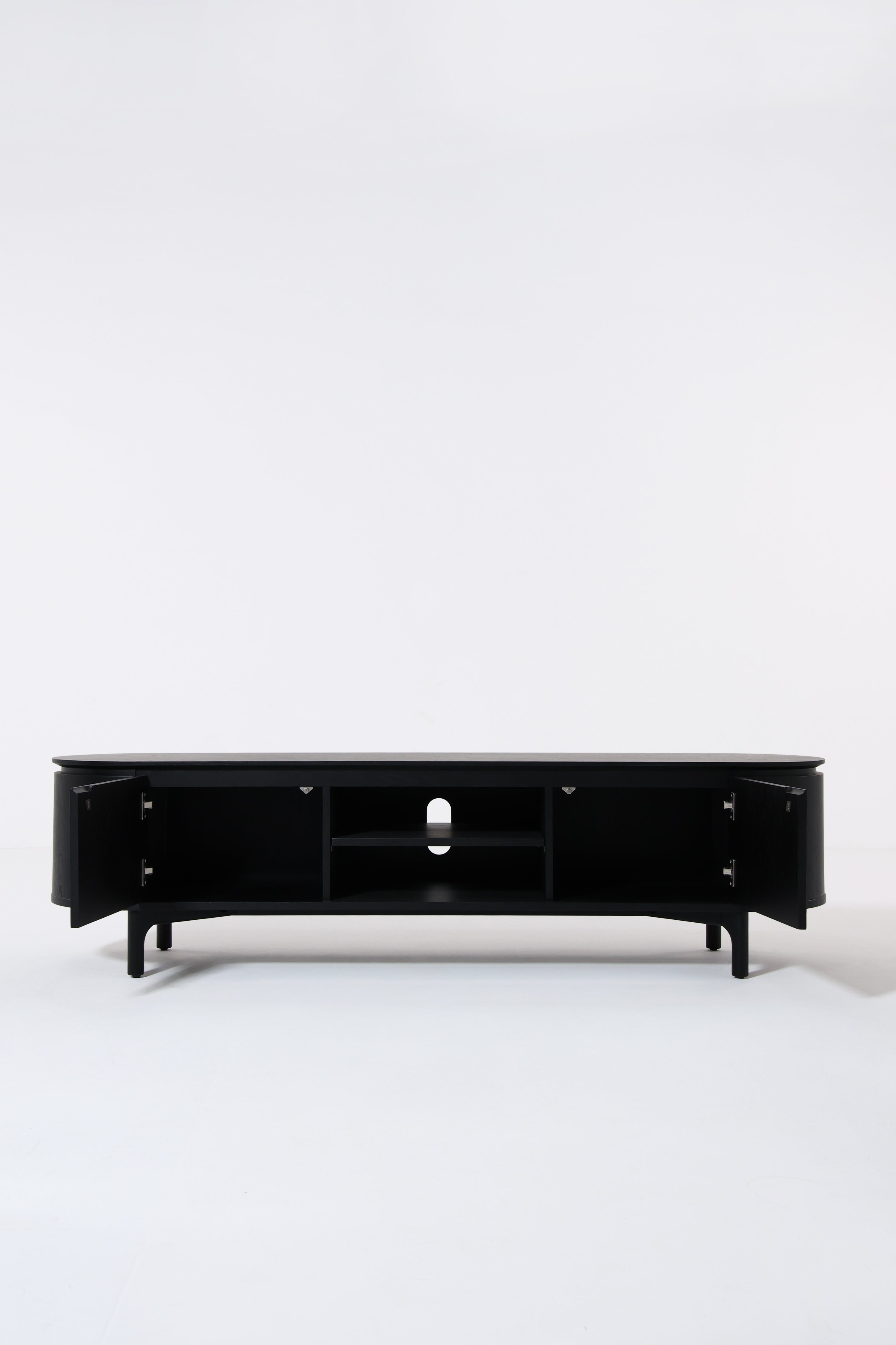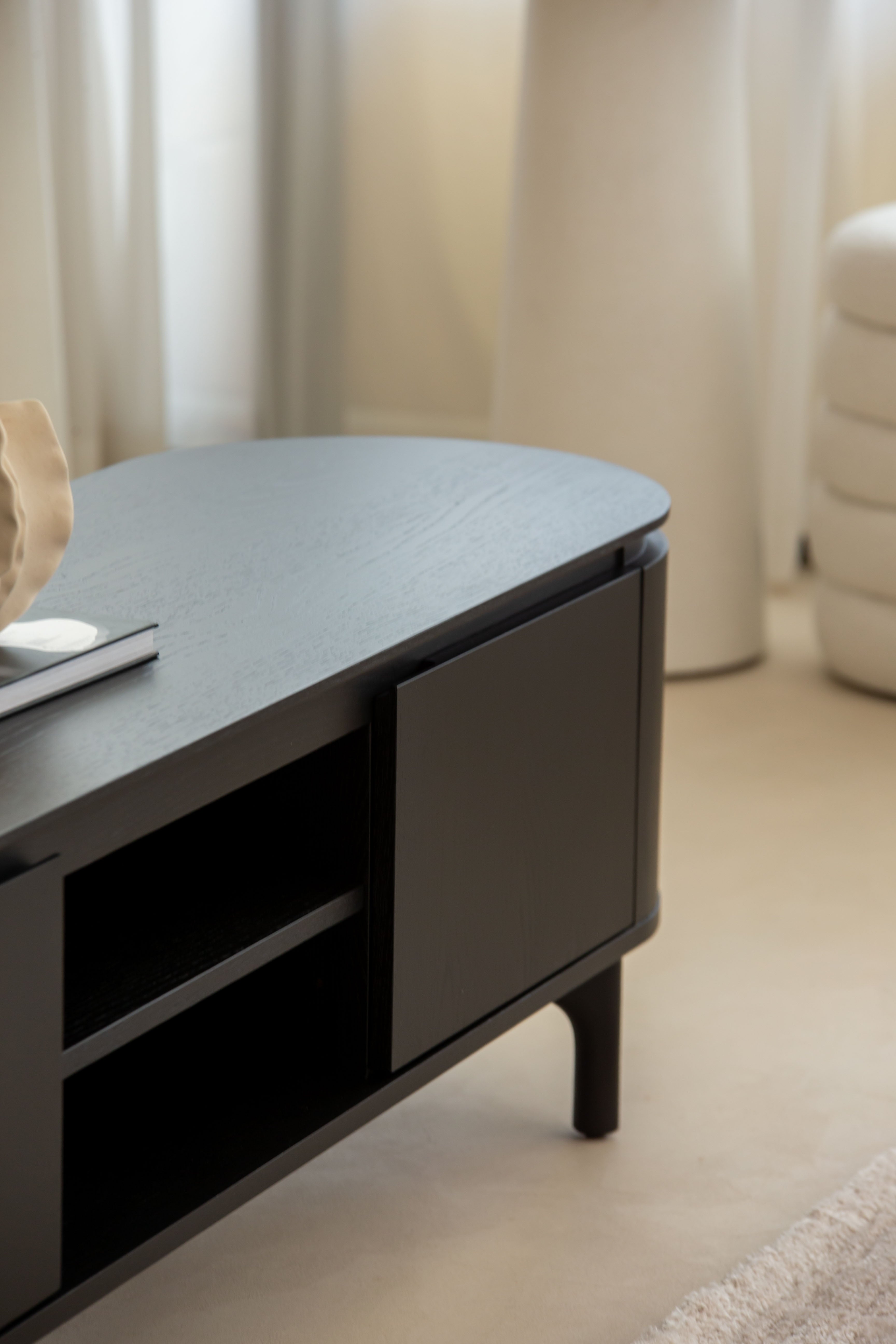 A sleek fusion of modern design and timeless elegance. Crafted in a deep black finish, its smooth rounded edges and curved profile soften the bold structure, creating a striking centerpiece for contemporary and mid-century interiors. Two seamless side cabinets and dual open shelves with cable cutout offer smart storage for media devices, consoles, and décor. The subtle woodgrain texture adds warmth, while the low elongated silhouette grounds the room with refined presence.