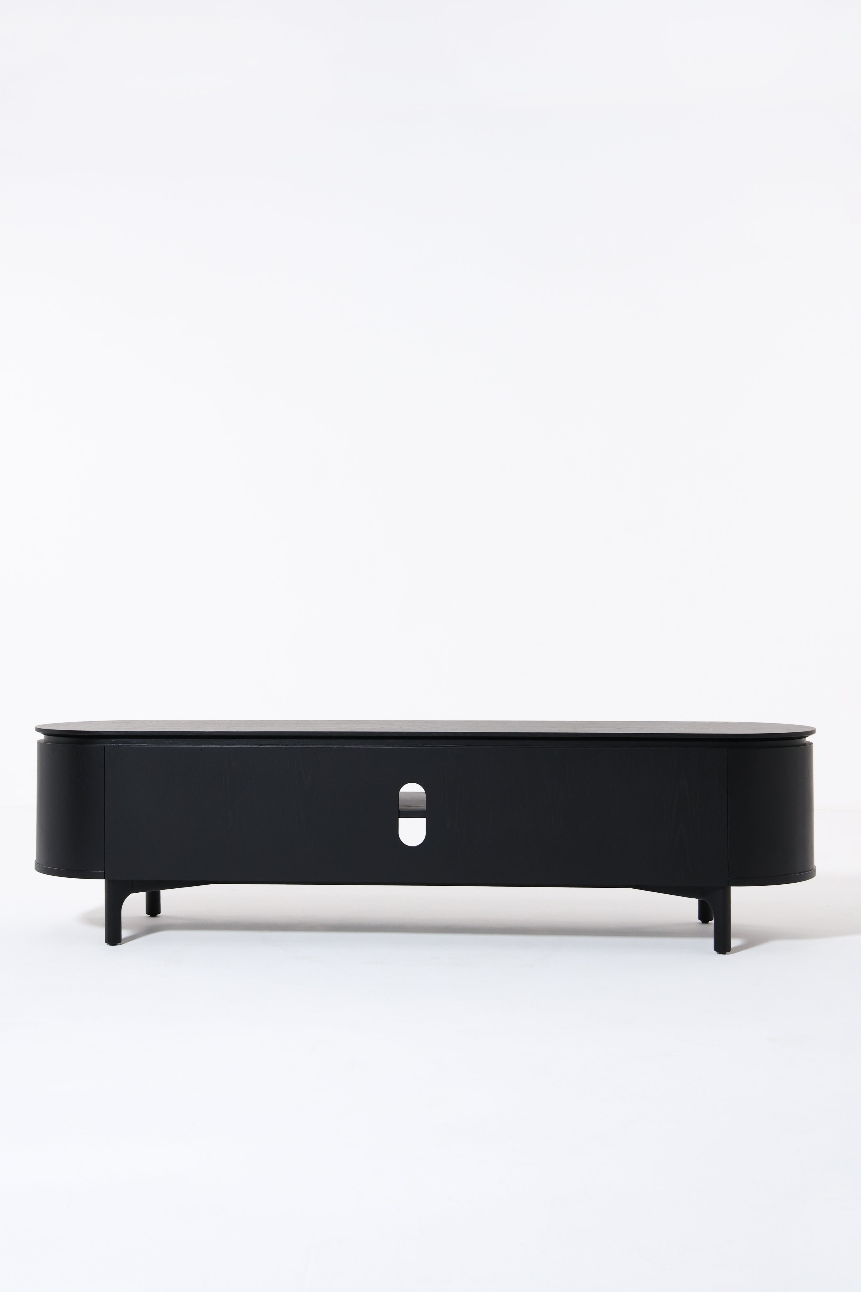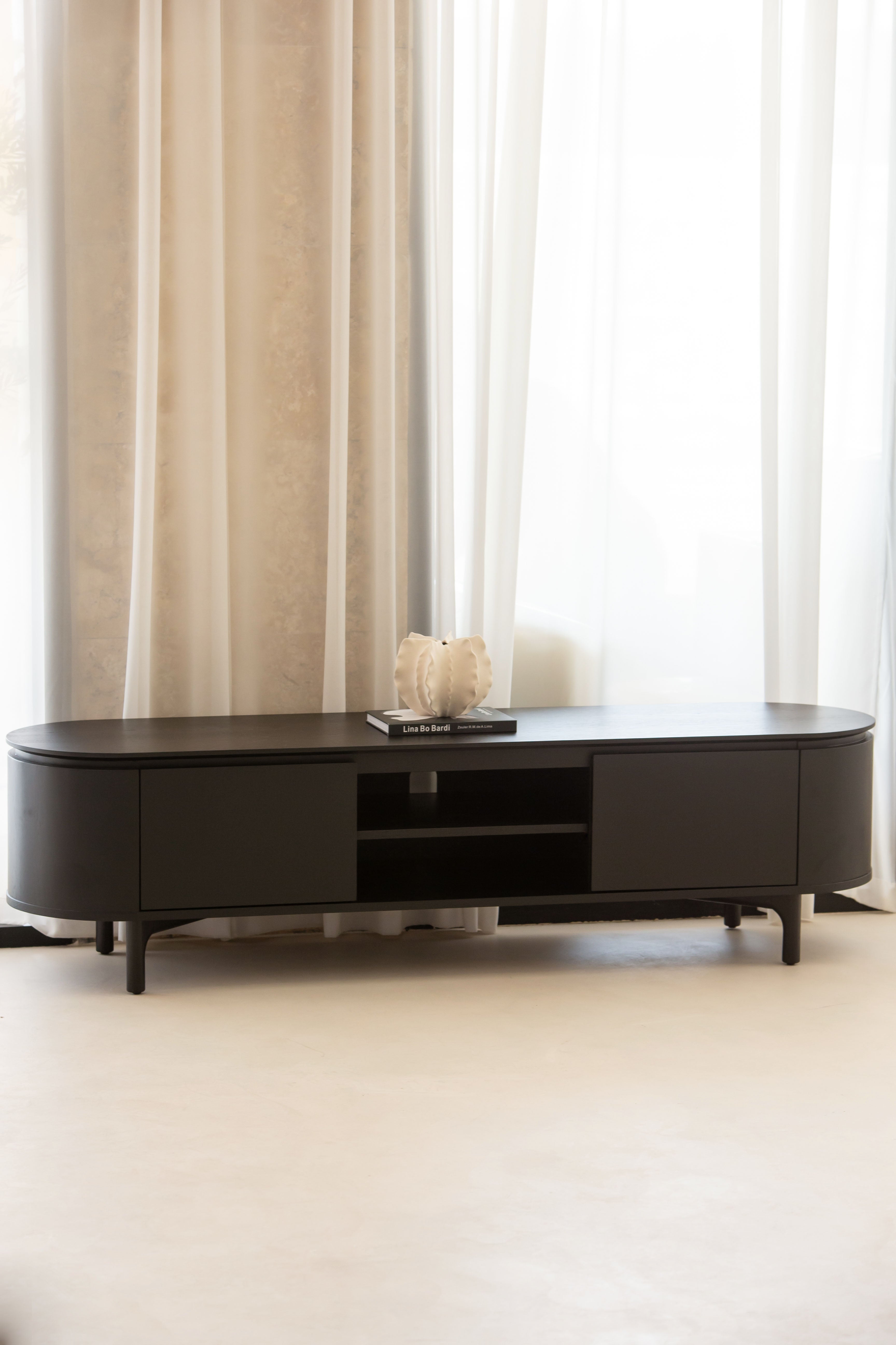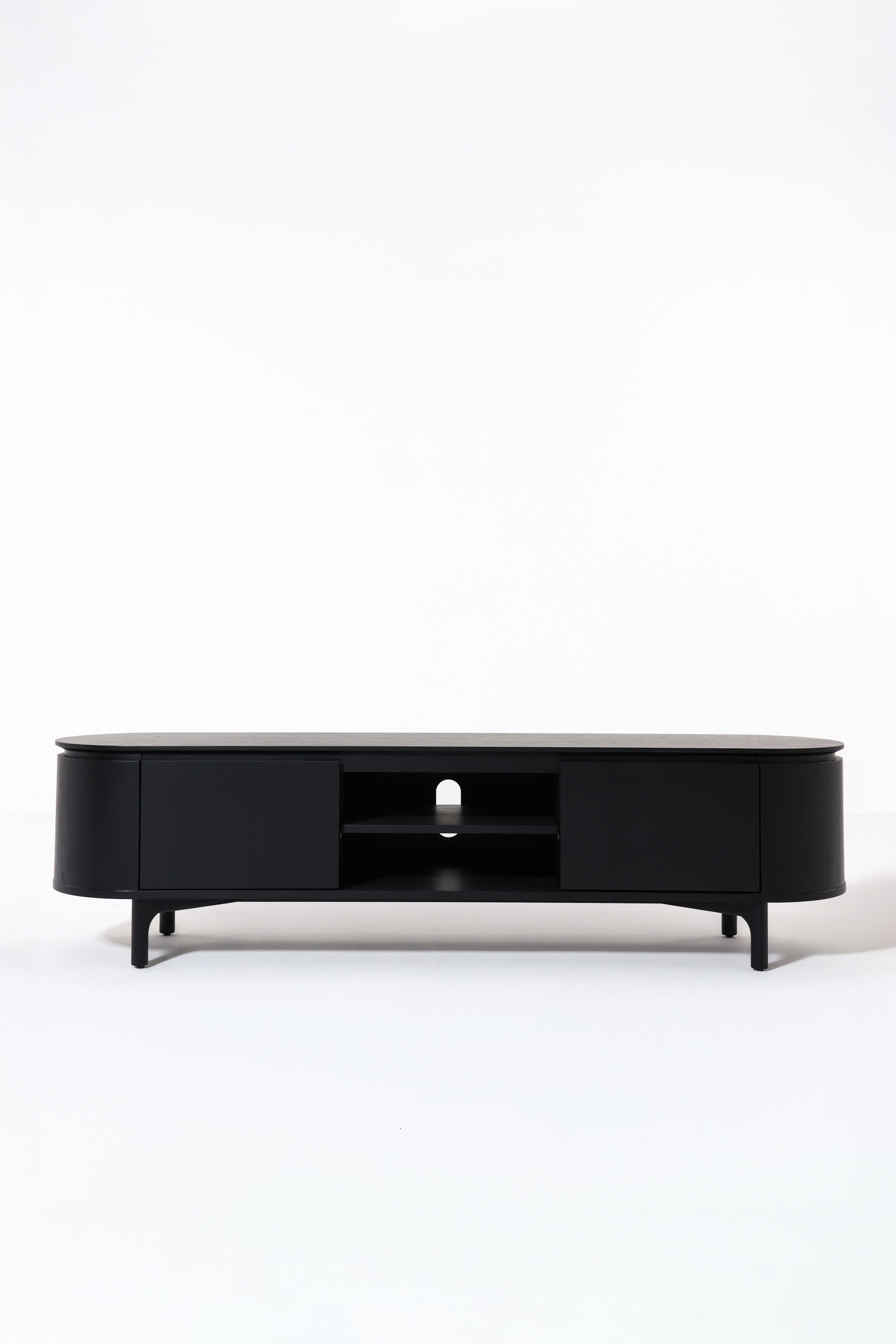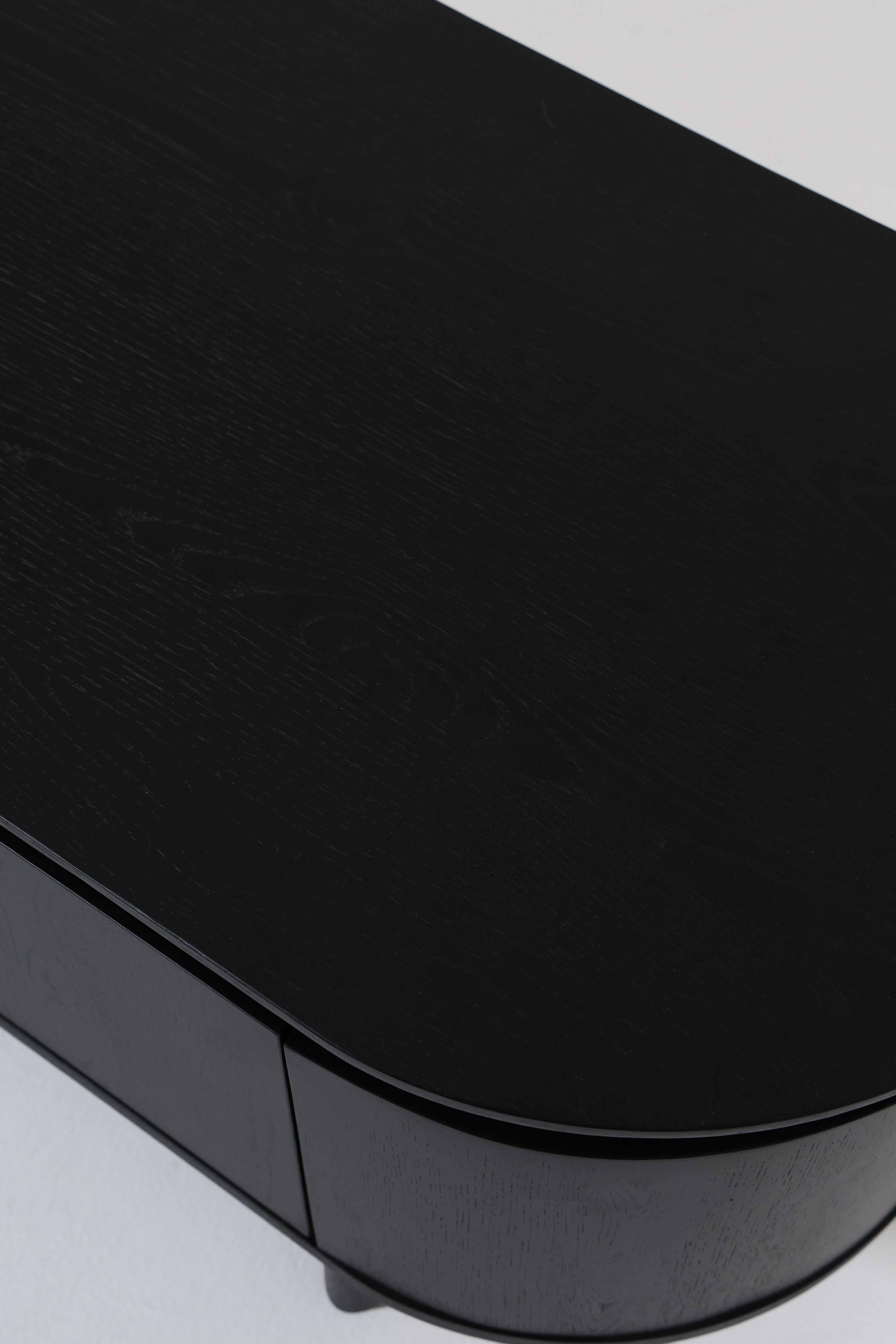 A sleek fusion of modern design and timeless elegance. Crafted in a deep black finish, its smooth rounded edges and curved profile soften the bold structure, creating a striking centerpiece for contemporary and mid-century interiors. Two seamless side cabinets and dual open shelves with cable cutout offer smart storage for media devices, consoles, and décor. The subtle woodgrain texture adds warmth, while the low elongated silhouette grounds the room with refined presence.