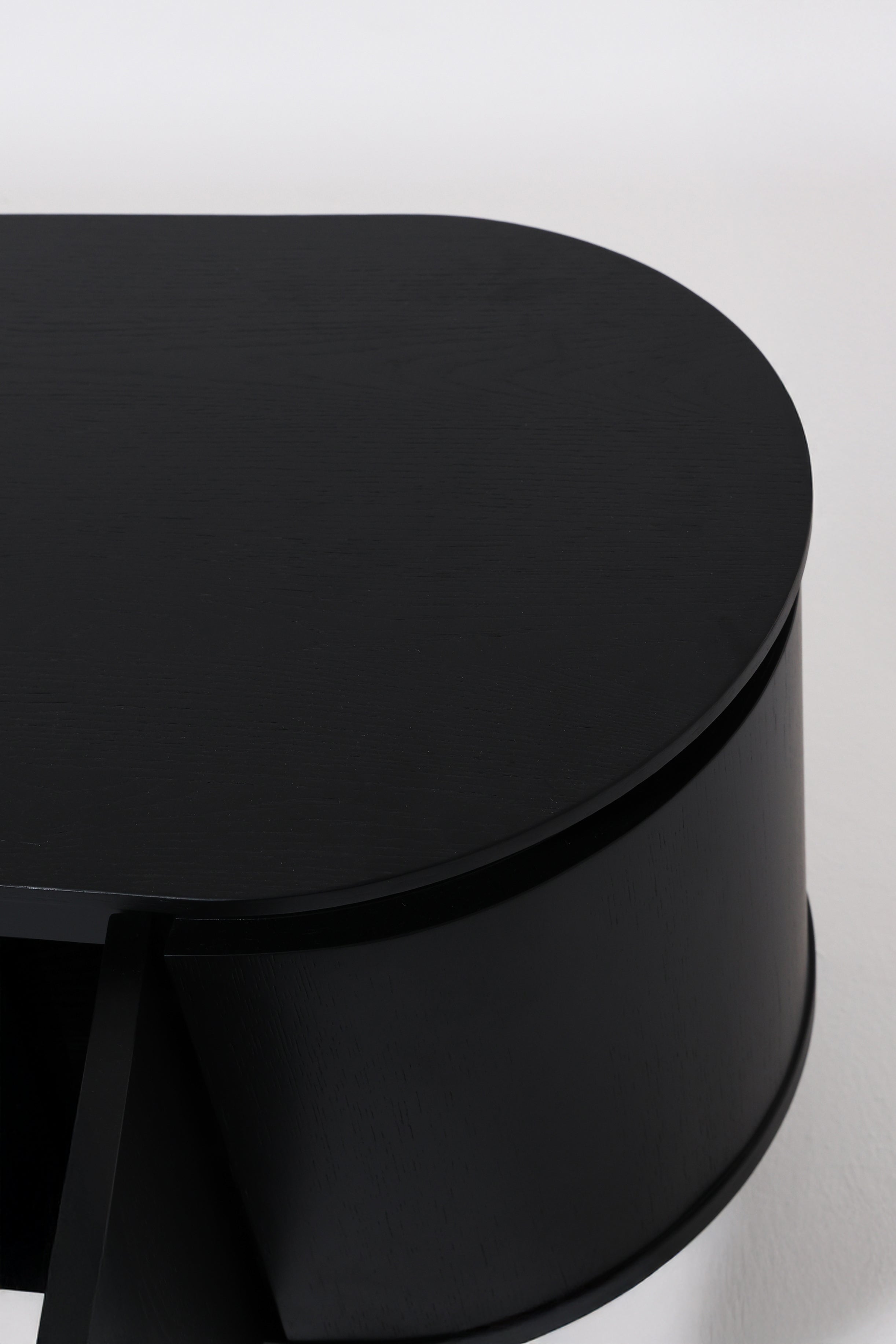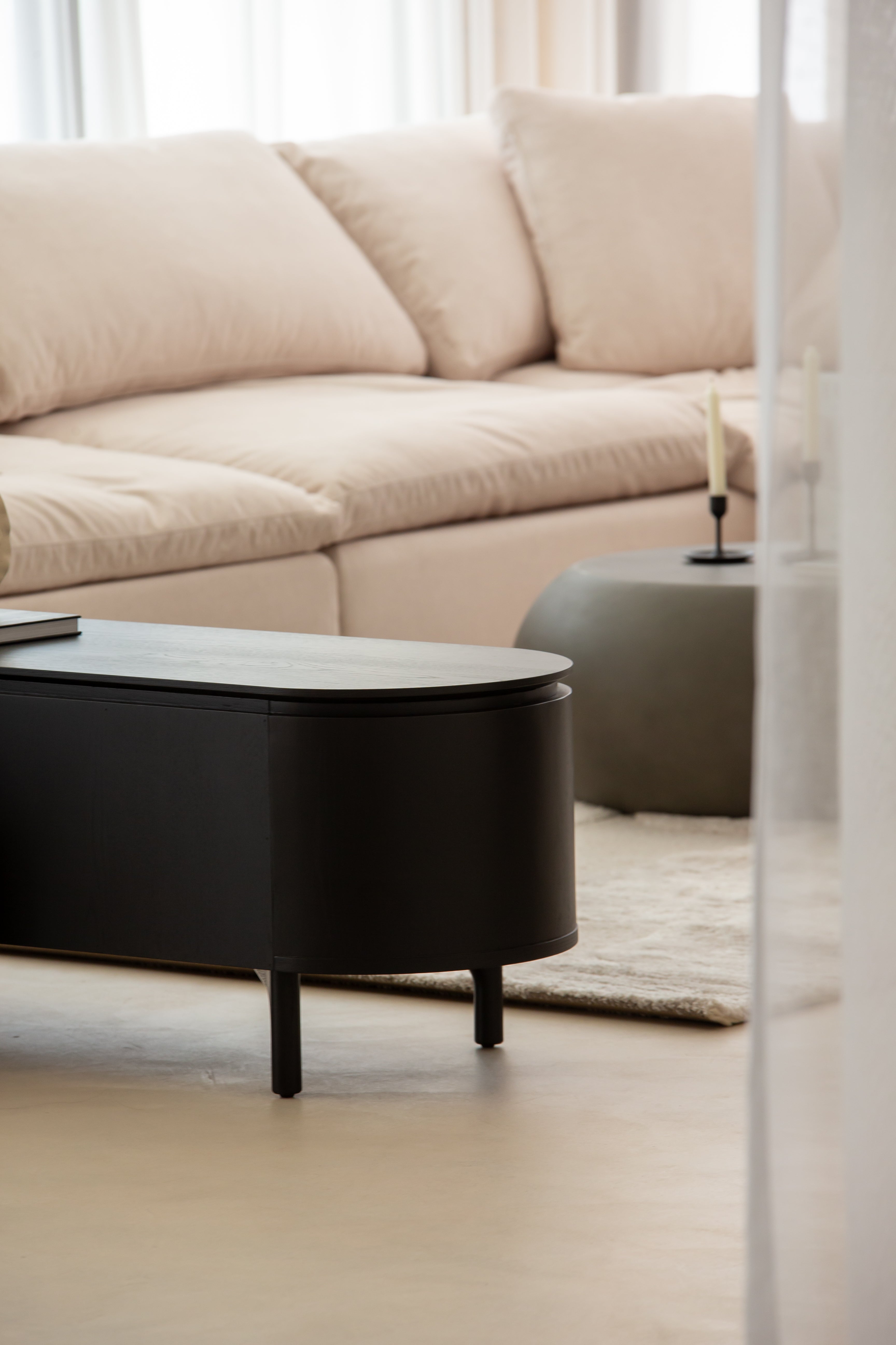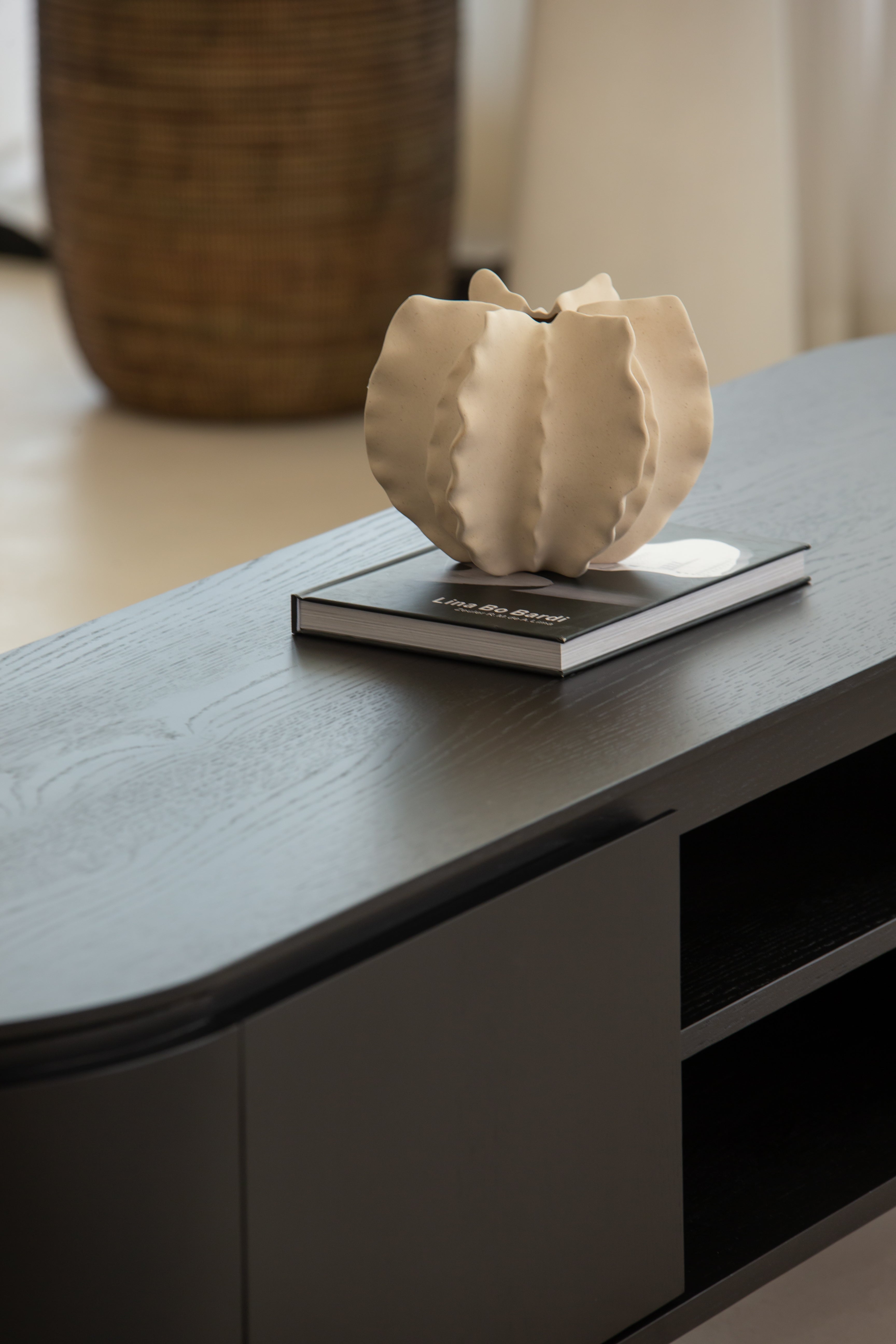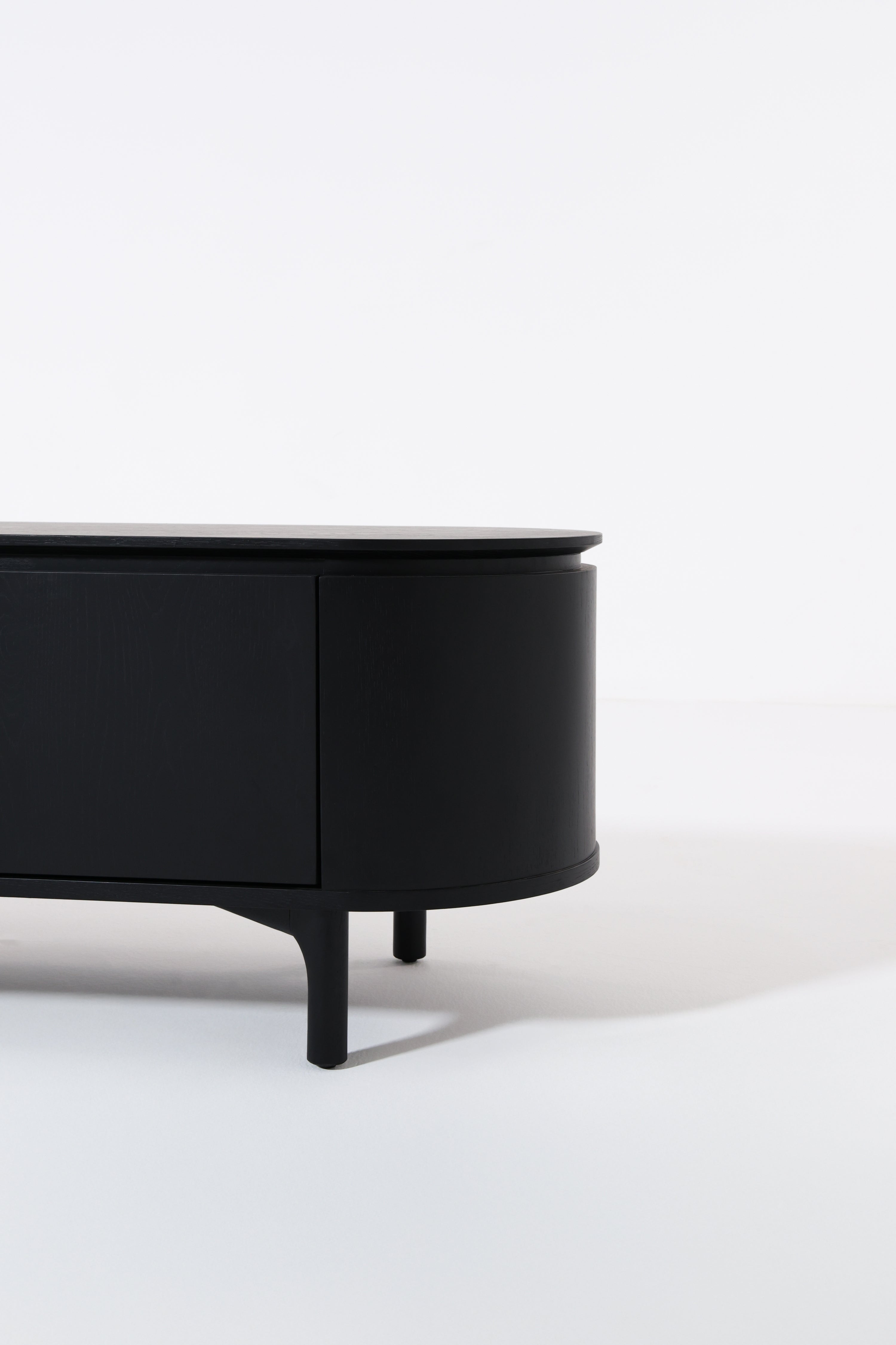 A sleek fusion of modern design and timeless elegance. Crafted in a deep black finish, its smooth rounded edges and curved profile soften the bold structure, creating a striking centerpiece for contemporary and mid-century interiors. Two seamless side cabinets and dual open shelves with cable cutout offer smart storage for media devices, consoles, and décor. The subtle woodgrain texture adds warmth, while the low elongated silhouette grounds the room with refined presence.