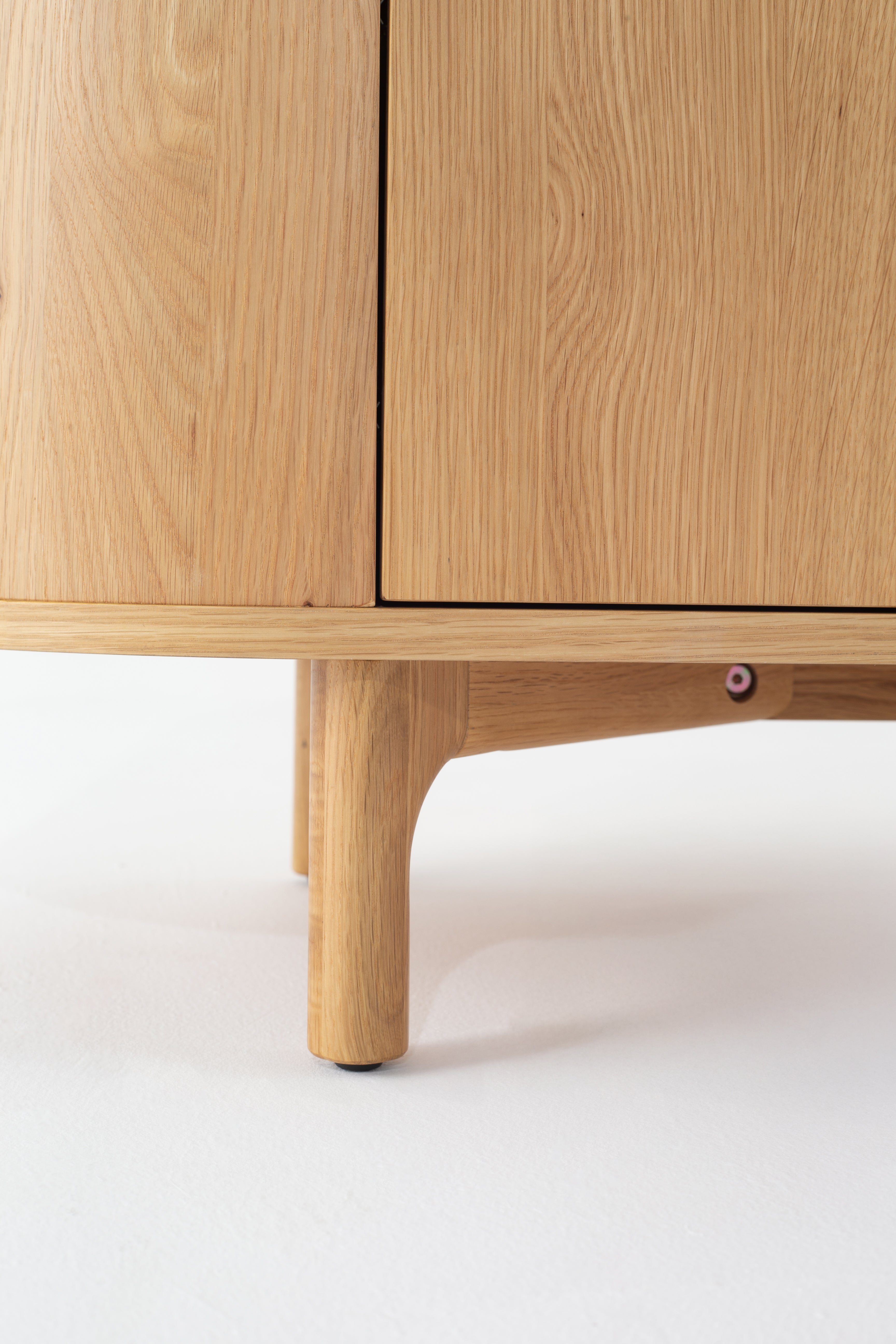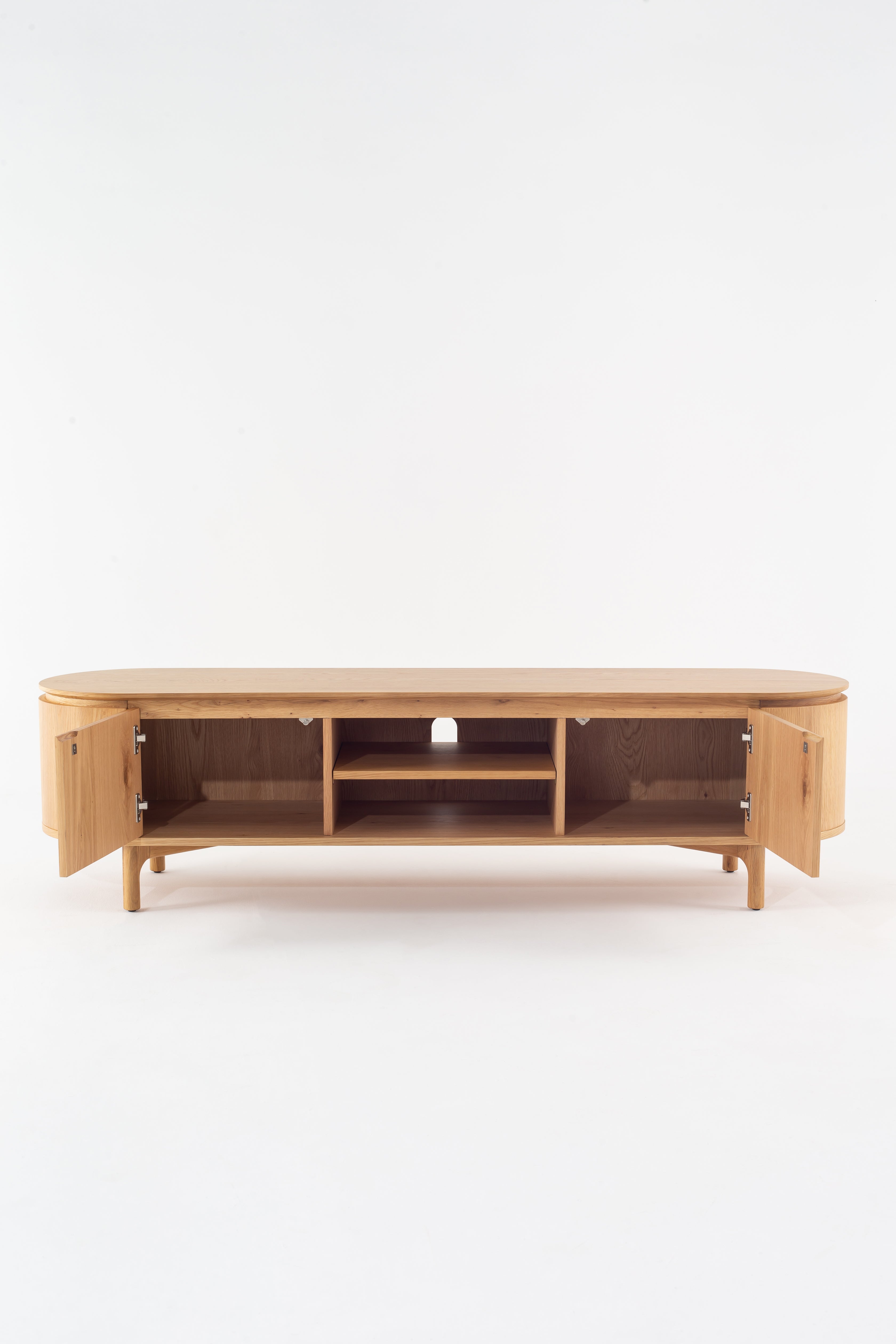 A smooth oak veneer finish, rounded edges, and a seamless silhouette define this tv unit, bringing warmth to your space. The soft curves and natural wood grain create a statement of modern elegance, while the spacious shelving and concealed storage offer a perfect blend of style and function. Whether displaying decor or housing entertainment essentials, it enhances your living area with timeless craftsmanship.