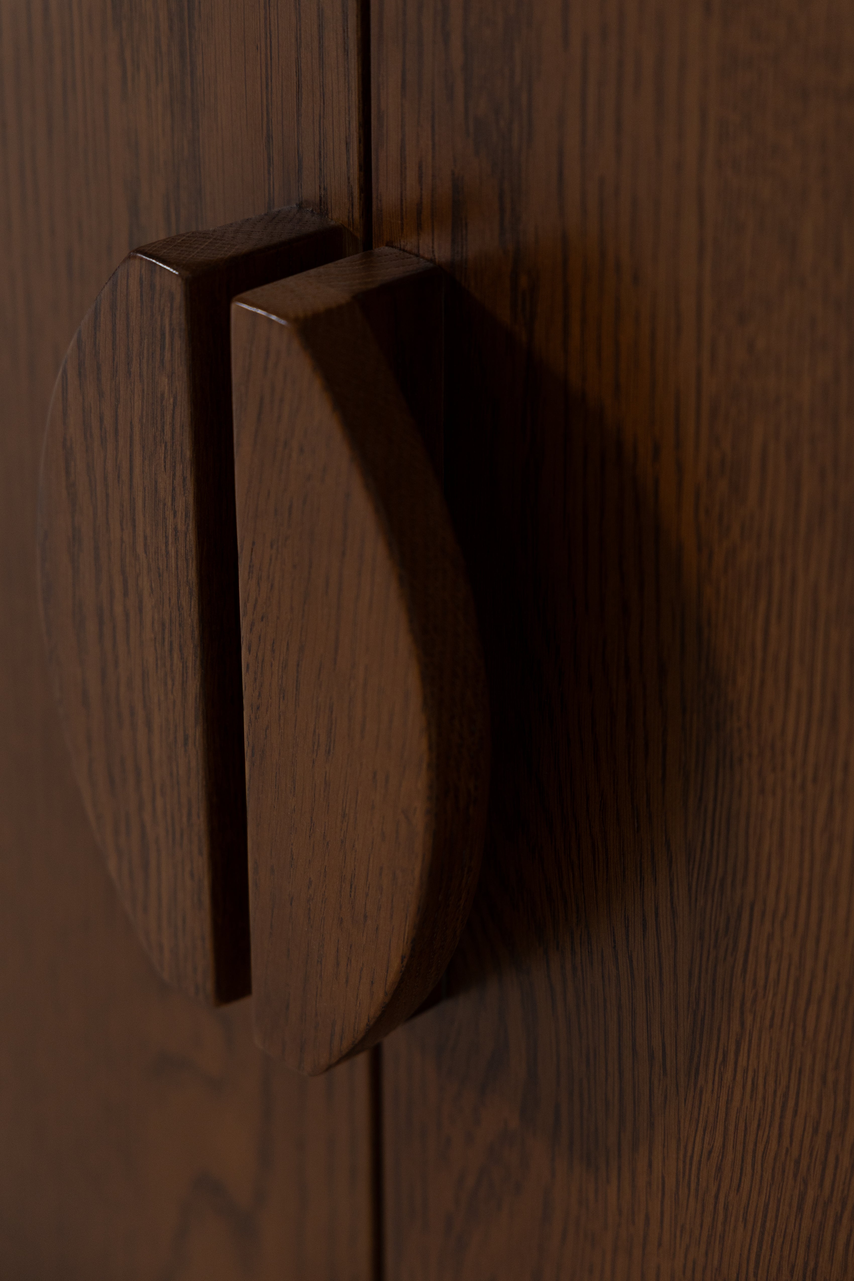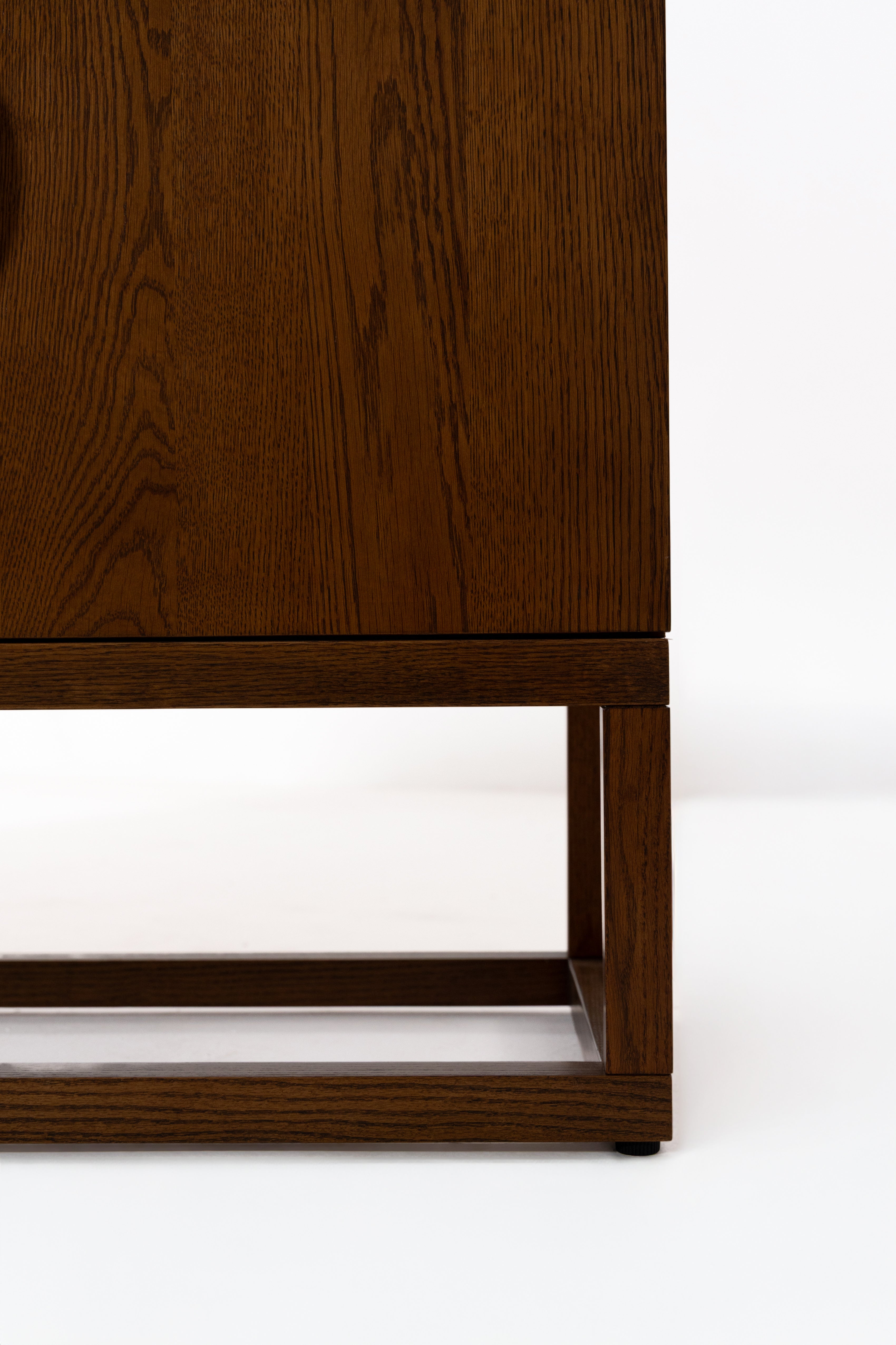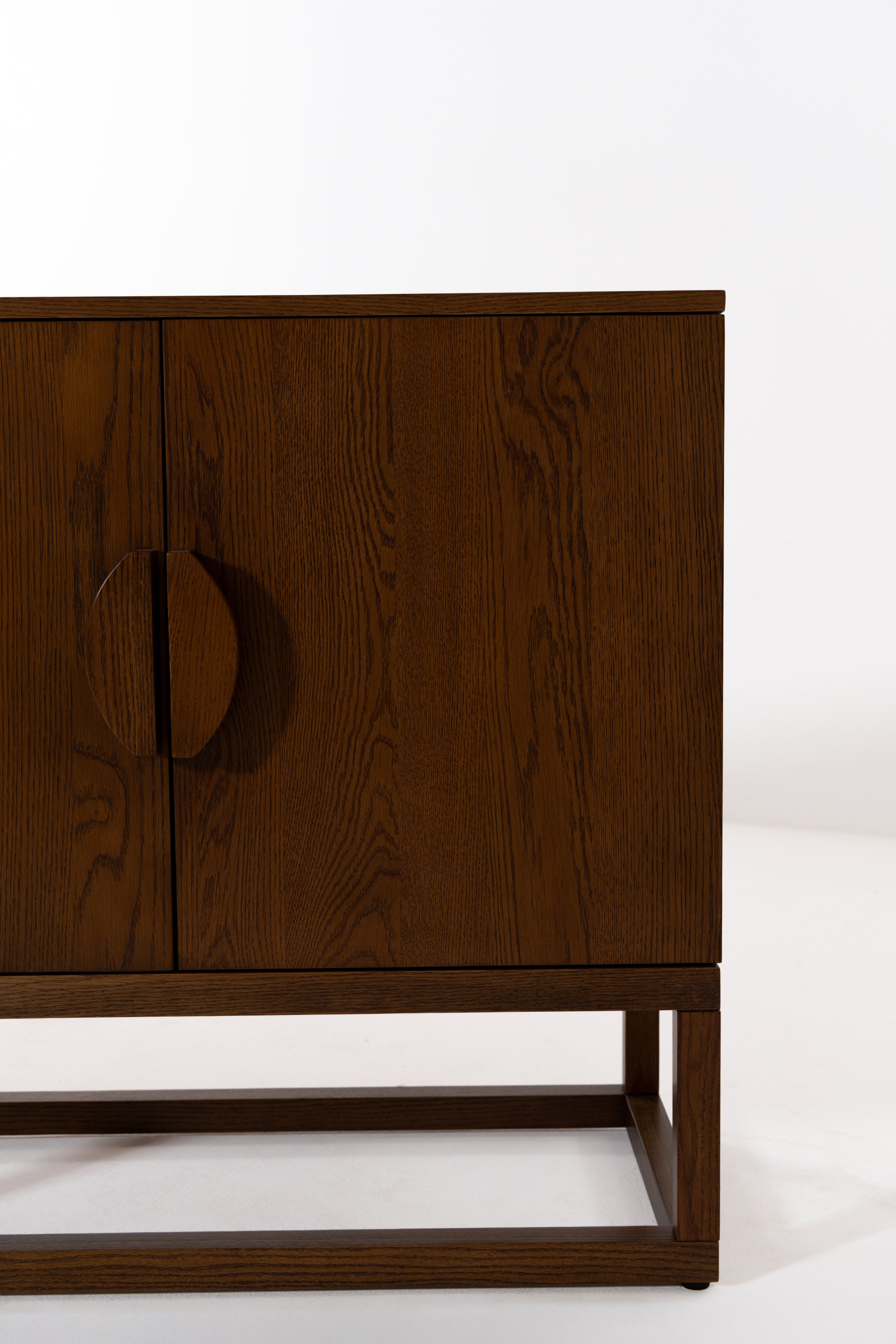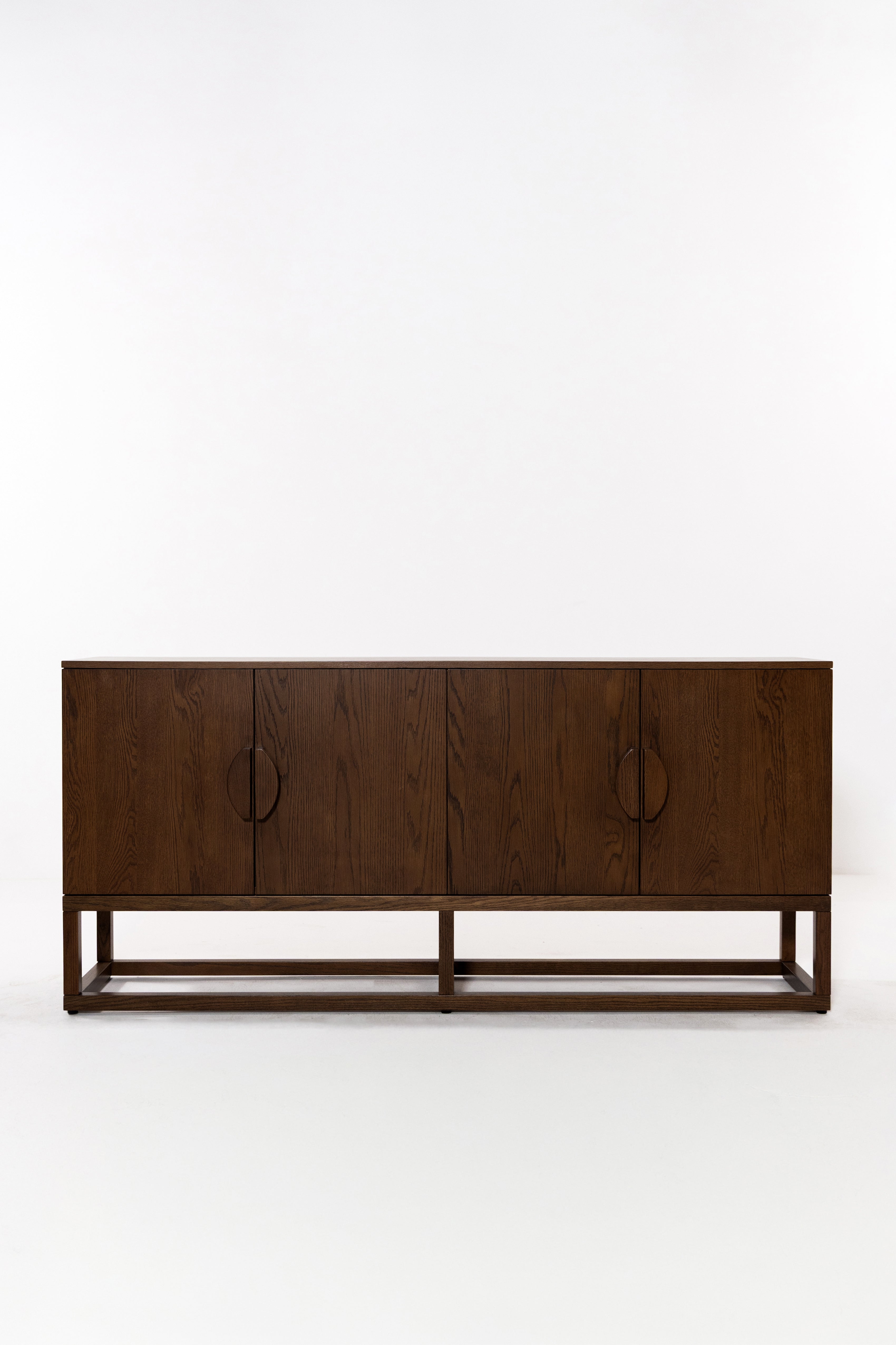 A long oak wood sideboard in a deep walnut-like tone, its crisp, rectangular case raised on a slim open base. Doors with round timber pulls reveal generous storage and a full-width shelf for dinnerware, media or linens. The grain is visible across the top and fronts, finished smooth with a low sheen. Use it as a dining console or living room credenza; the quiet lines and grounded proportions suit modern, mid-century and Japandi spaces. A square-leg base with metal caps adds durable, gentle lift.