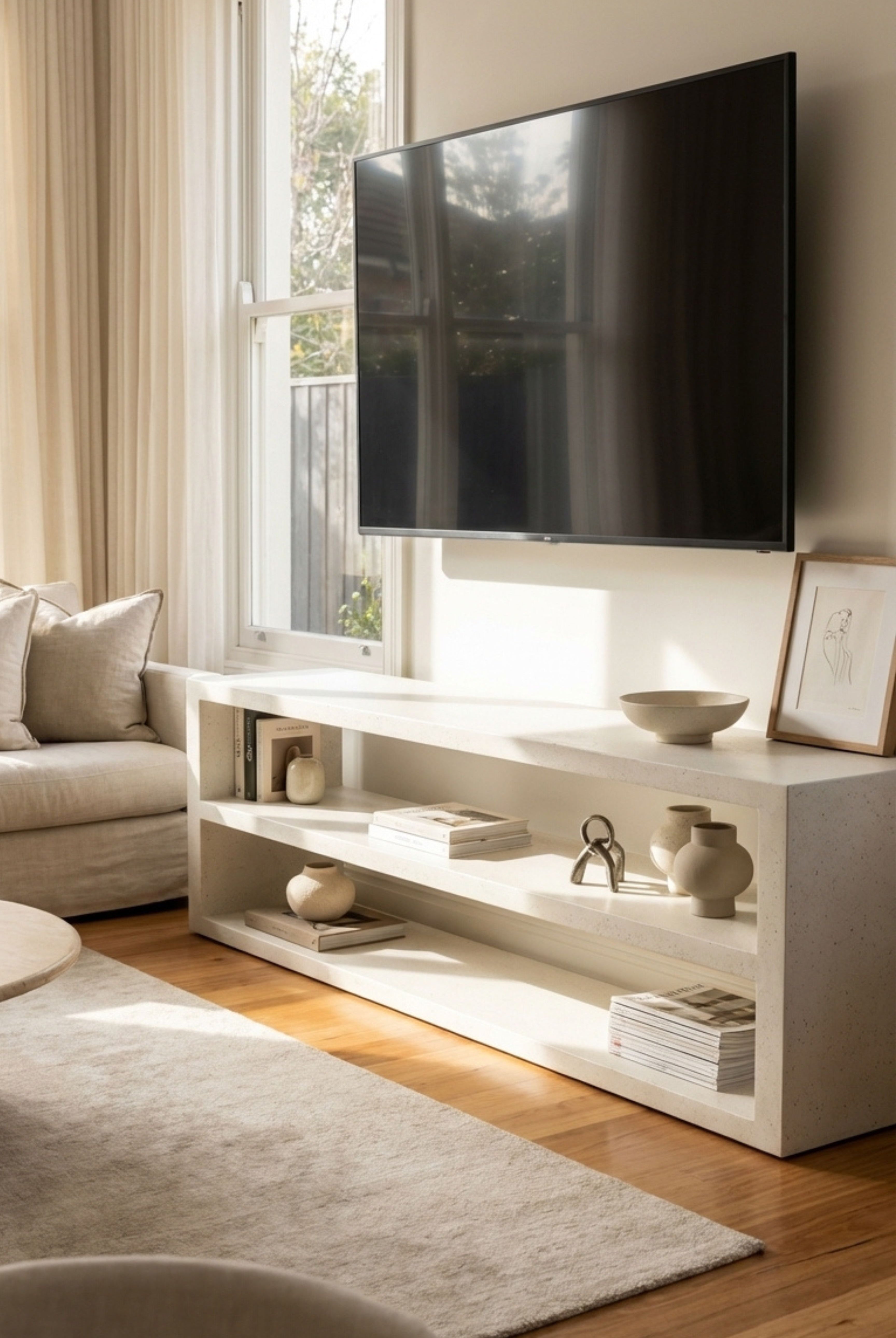 Smart Storage: Integrated cable management, adjustable shelves, and hidden compartments to keep remotes, consoles, and clutter out of sight.