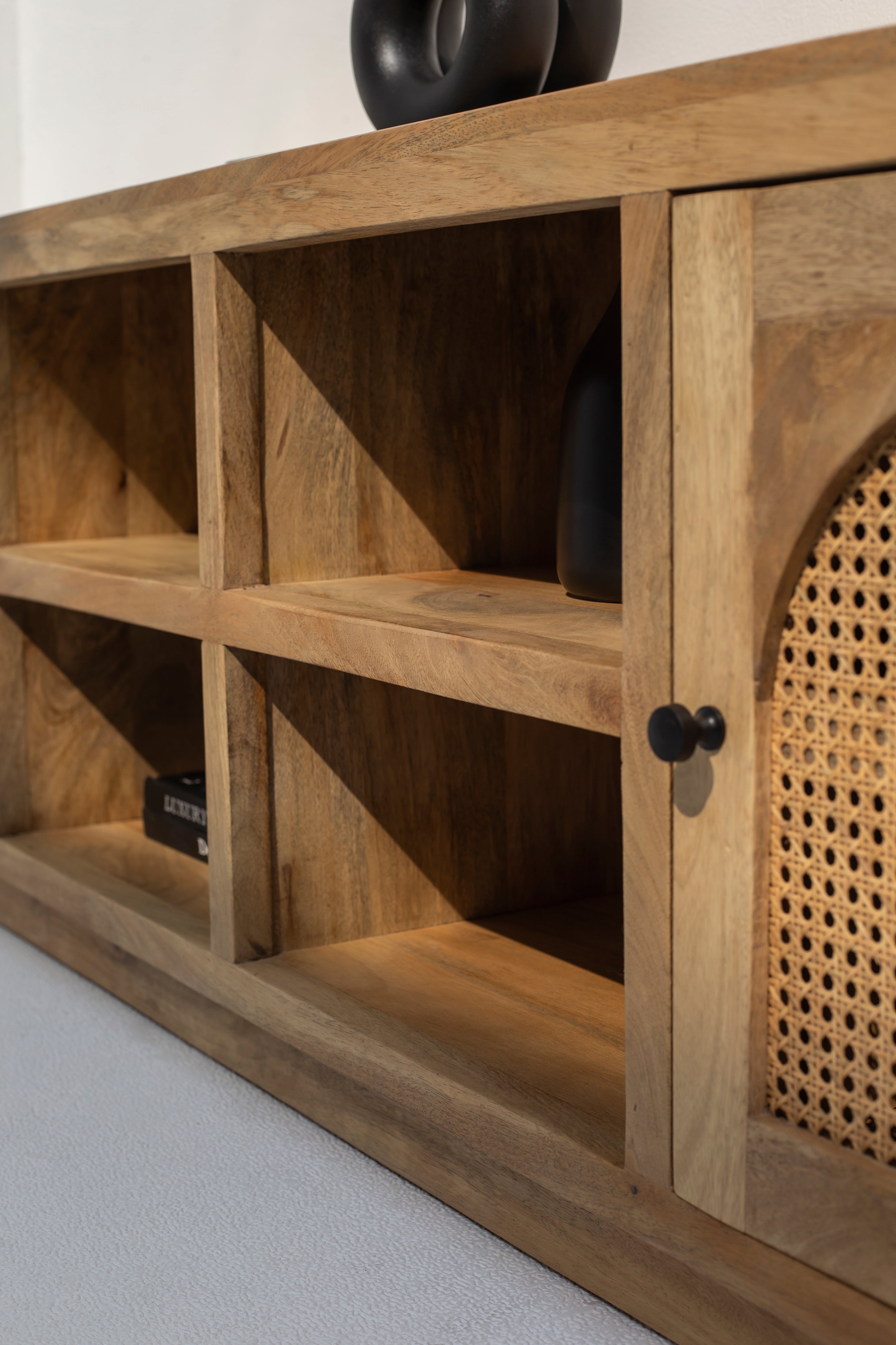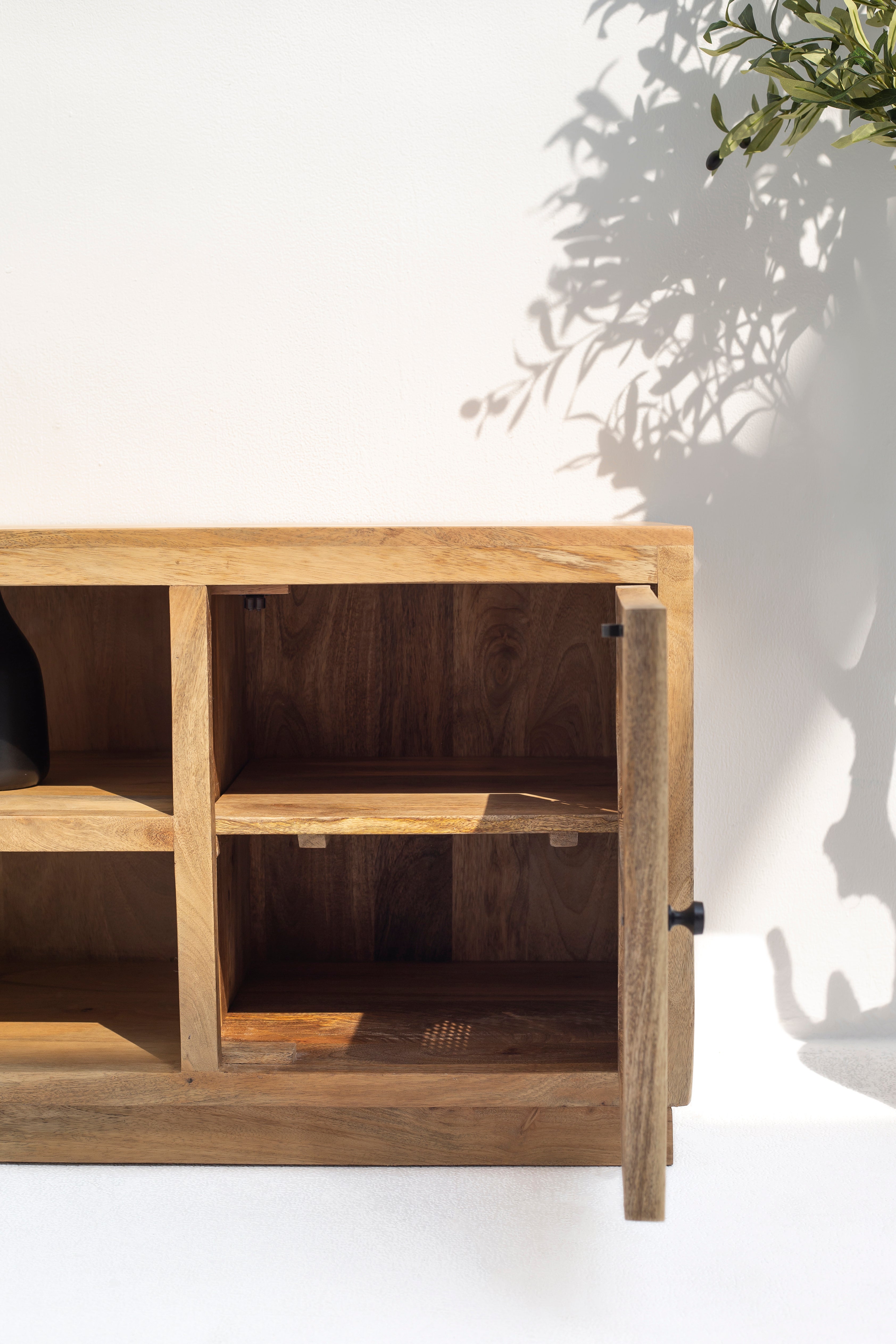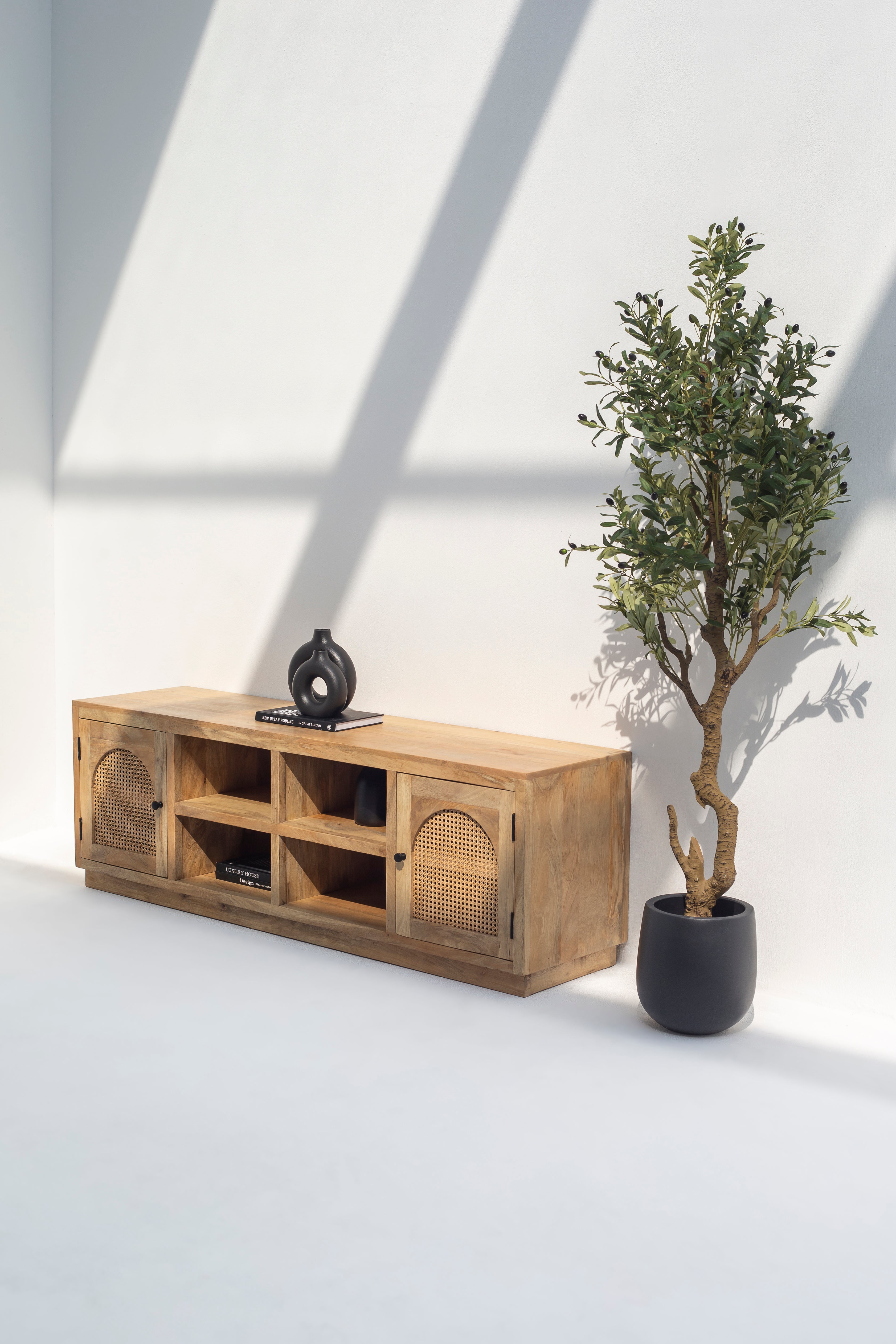 The Cyrille Wooden TV Unit, crafted from premium mango wood, showcases a natural finish that exudes warmth and sophistication. Its sleek rectangular shape features open shelving for display and rattan cabinets for concealed storage, perfectly blending modern aesthetics with timeless charm. The light wood grain texture adds a rustic touch, while its sturdy build ensures durability. This tv unit complements various interiors, offering functionality and a statement of elegance. Ideal for organizing living spaces while enhancing décor.