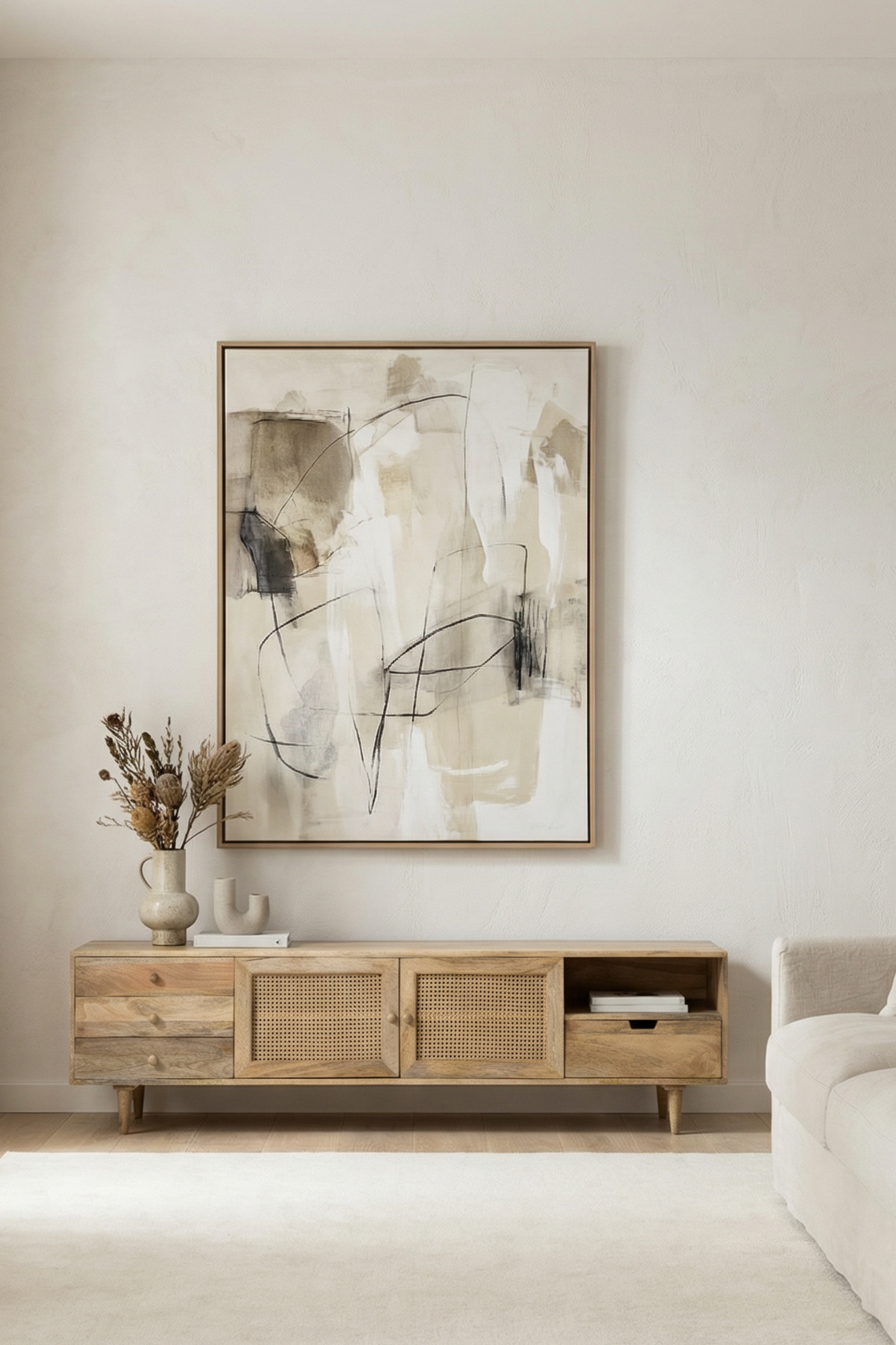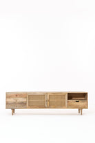 Designed to bring warmth and thoughtful functionality into your living space, this TV unit is crafted from solid mango wood and accented with woven cane panels that add texture and visual depth. The balanced composition of drawers, enclosed storage, and open shelving creates an easy flow for organizing media essentials while keeping the look calm and uncluttered. Natural grain variation gives each piece its own character, allowing it to blend effortlessly into relaxed contemporary, mid century, or modern natural interiors. Grounded yet refined, it offers a timeless foundation for everyday living.