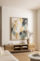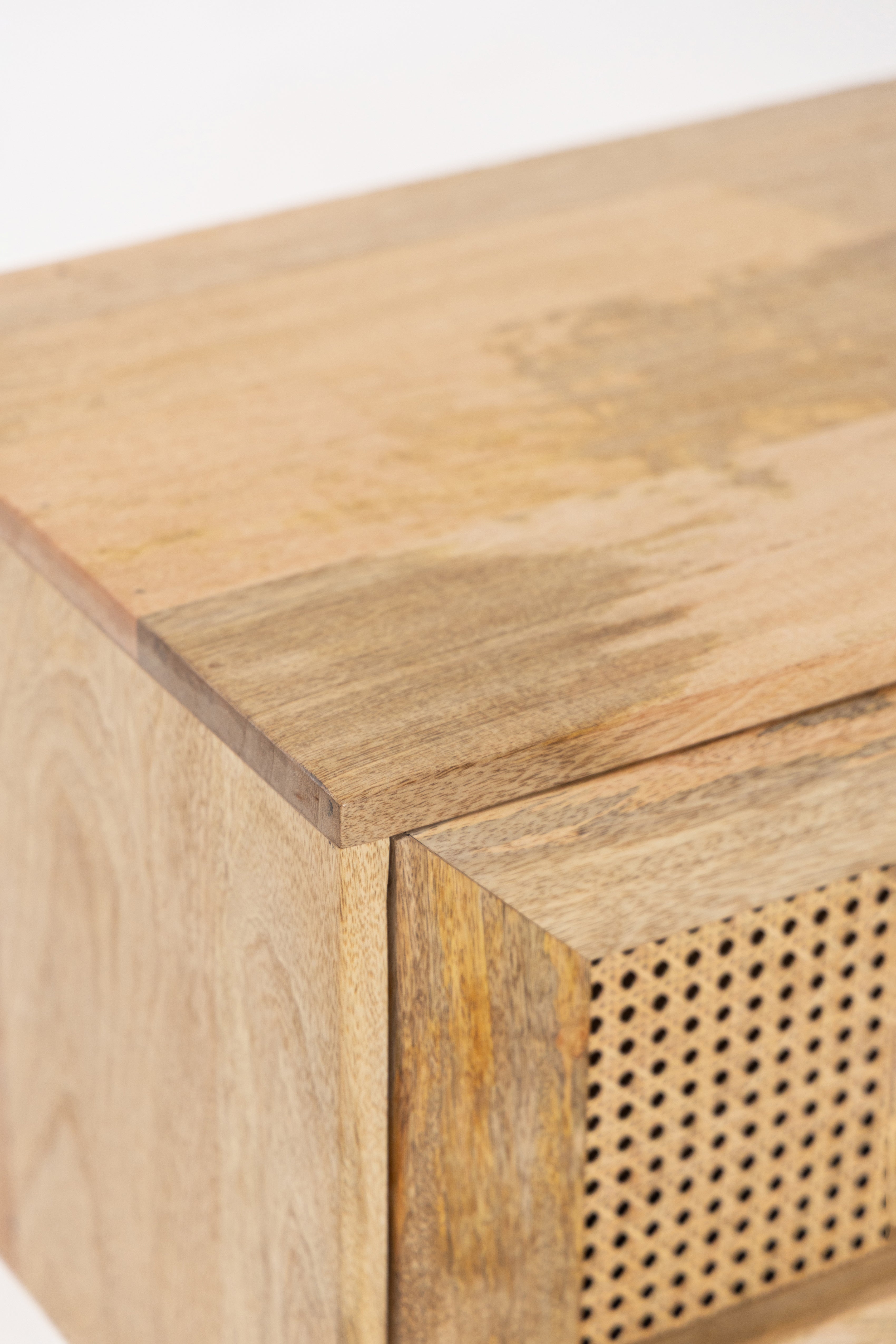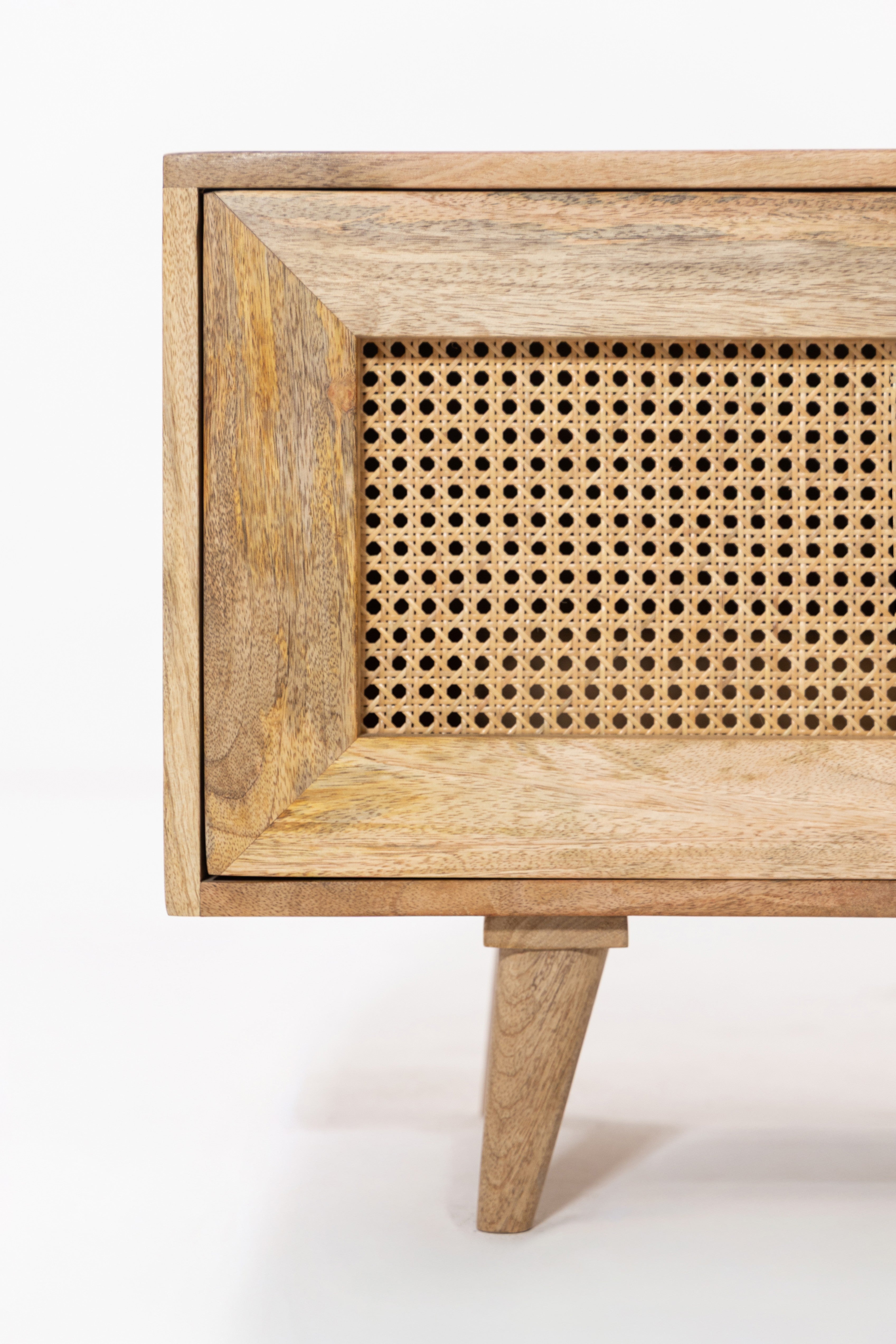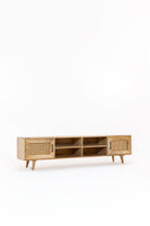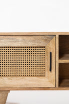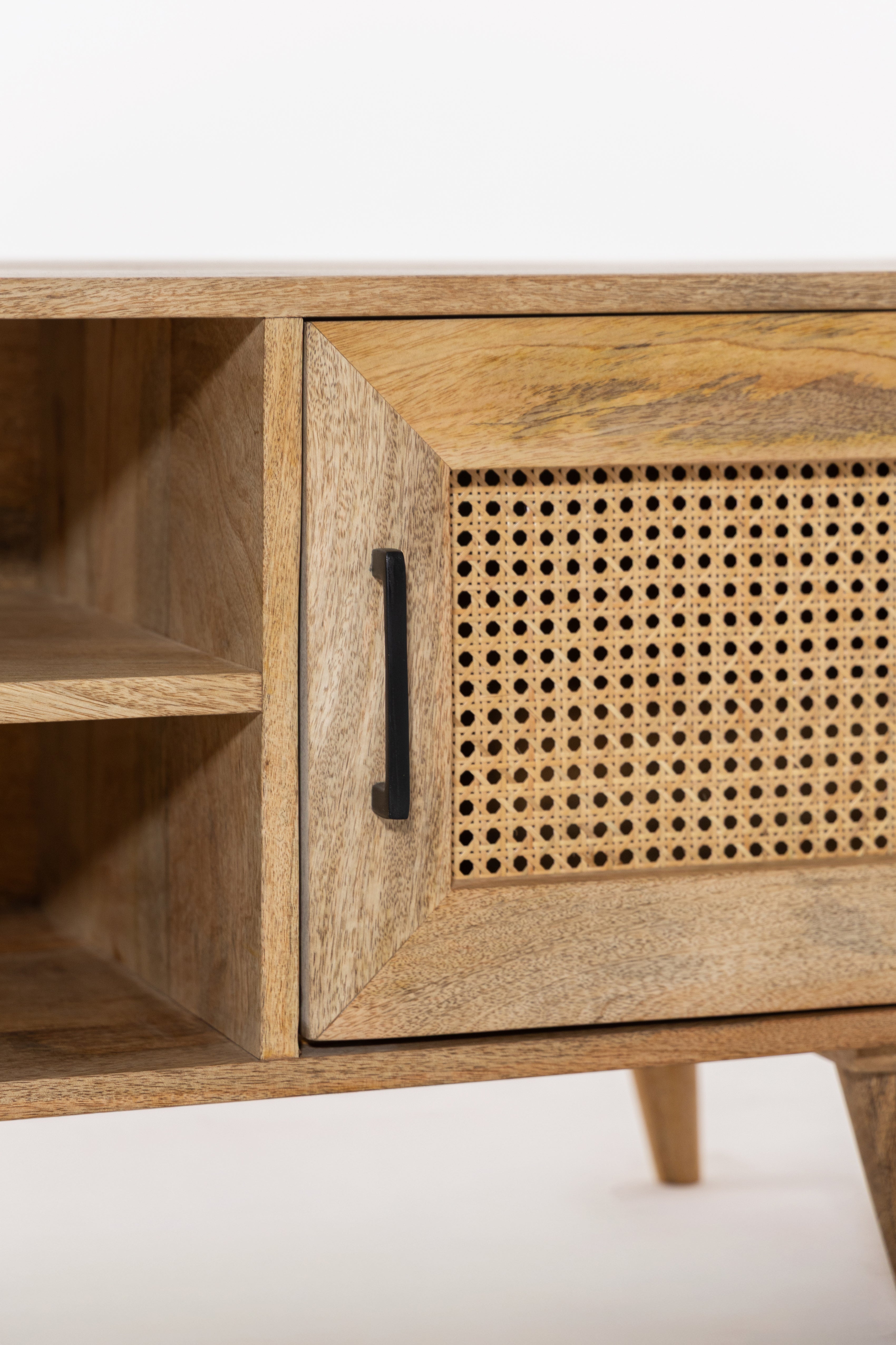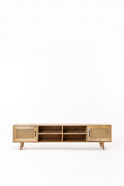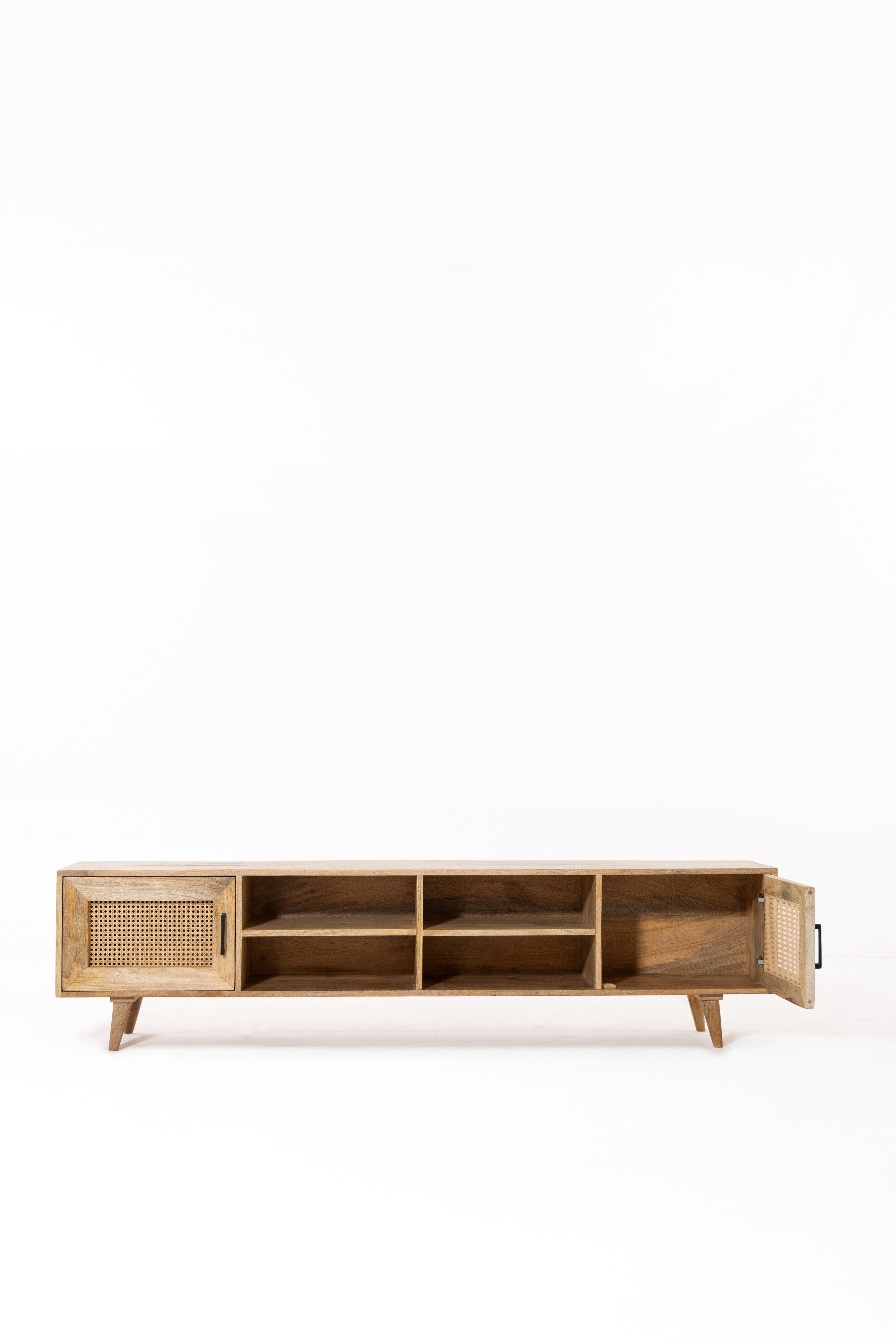 Designed to anchor your living space with warmth and understated character, this TV unit is crafted from solid mango wood and finished with natural cane detailing that adds texture and depth. The clean, elongated silhouette feels light and balanced, while the combination of open shelving and enclosed storage creates a practical yet visually calm setup for media essentials and decor.