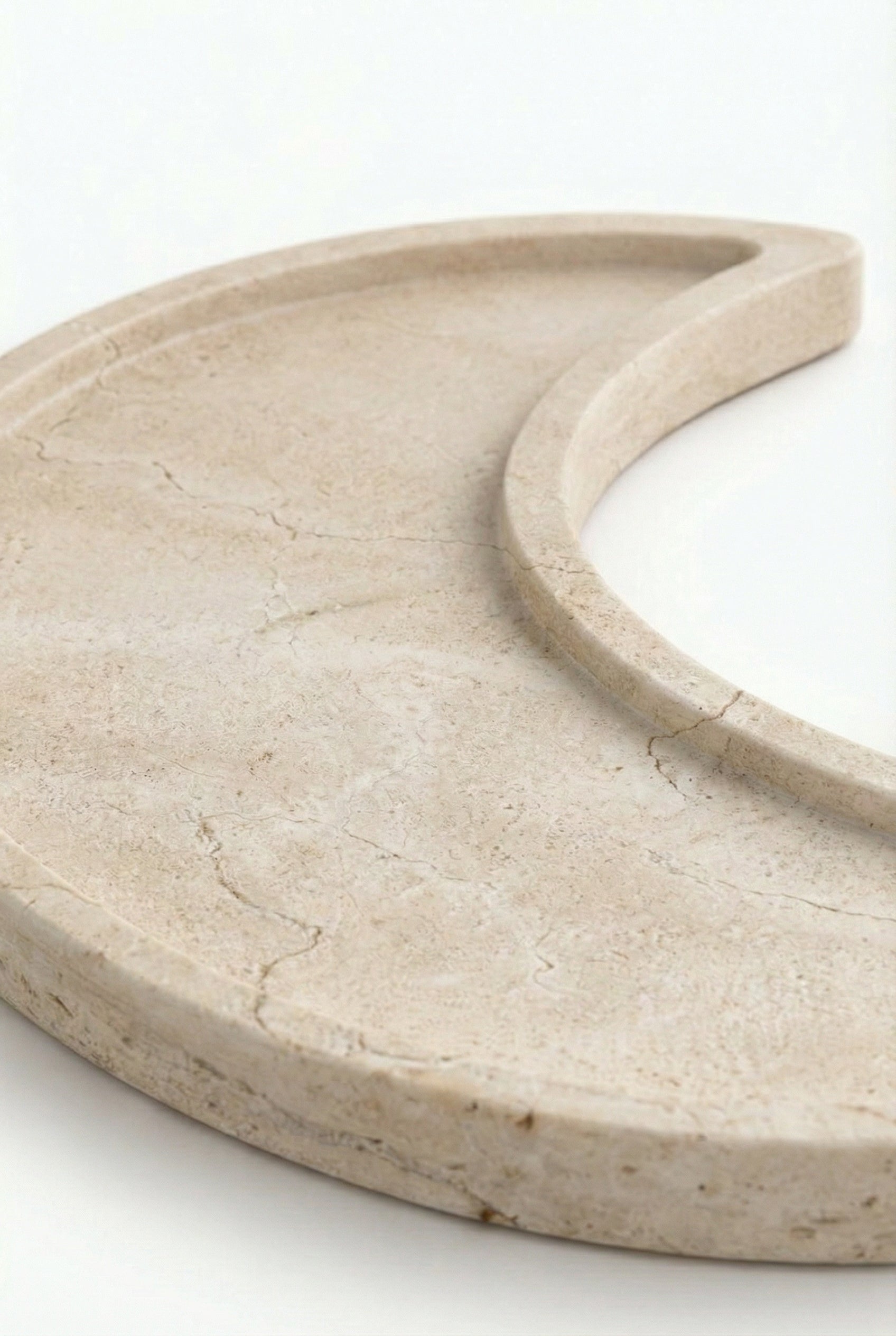 Shaped in a gentle crescent and carved from smooth Crema Marfil marble, this tray brings quiet balance and understated luxury to curated interiors. Soft ivory tones with subtle natural veining create a serene surface for candles, jewelry, or everyday objects, allowing your space to feel composed, warm, and intentionally styled through timeless stone elegance.