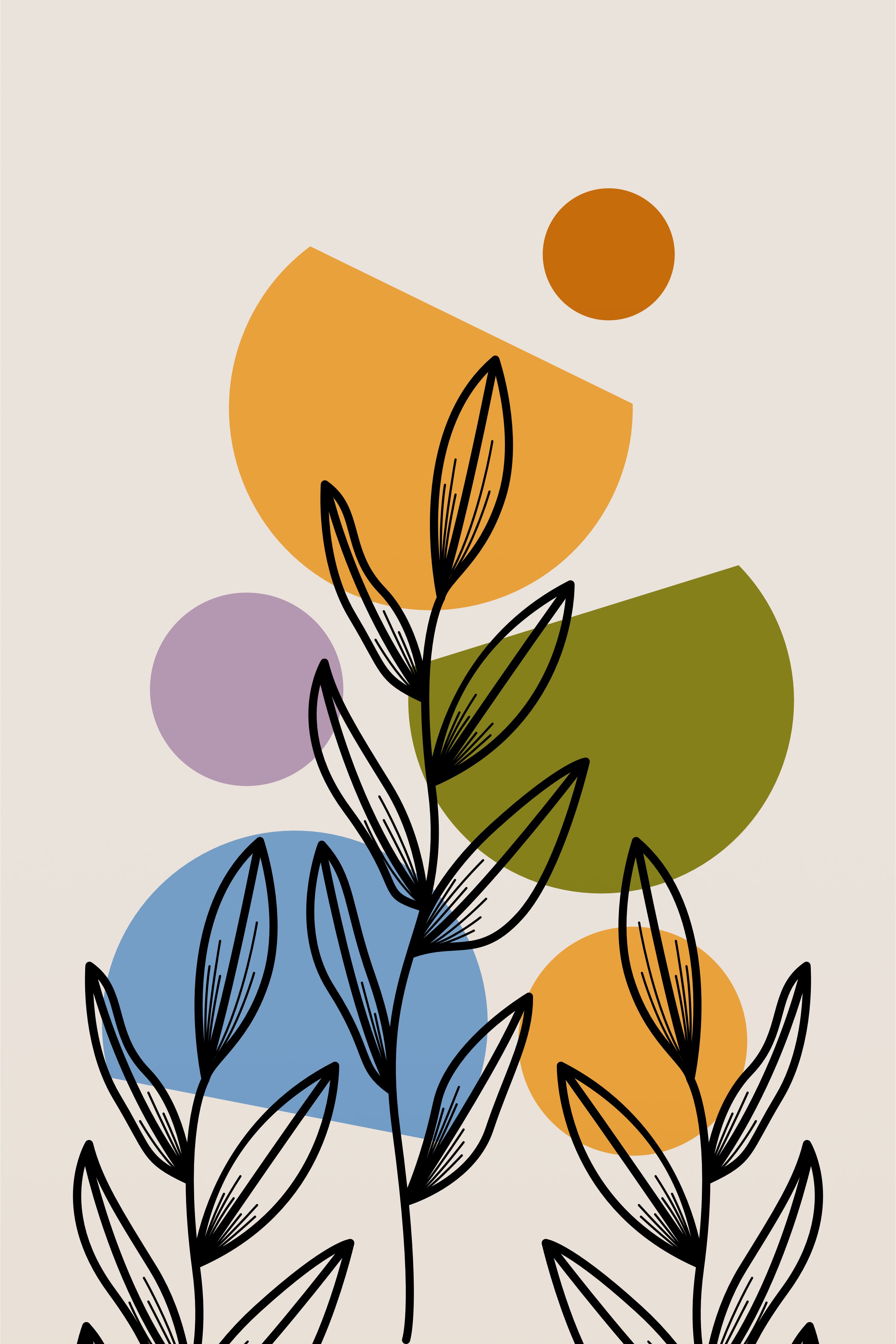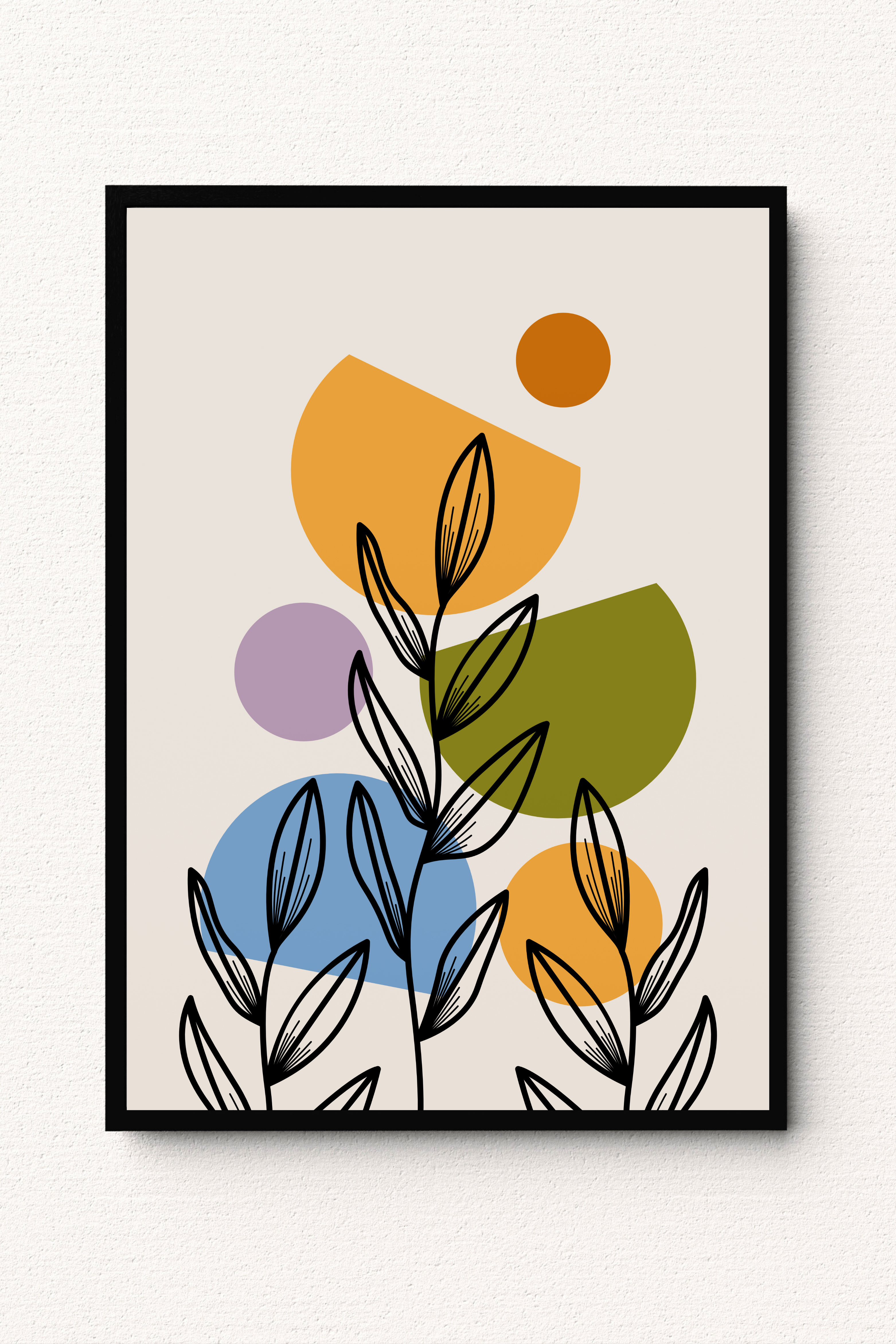 This artwork features expressive botanical linework layered over softly rounded color forms, creating a composition that feels lively yet balanced. The contrast between bold black stems and warm muted tones adds depth while keeping the overall look calm and modern. Designed to bring a gentle sense of movement and creativity into your space, it works beautifully in living areas, bedrooms, or curated gallery walls that celebrate artful simplicity.