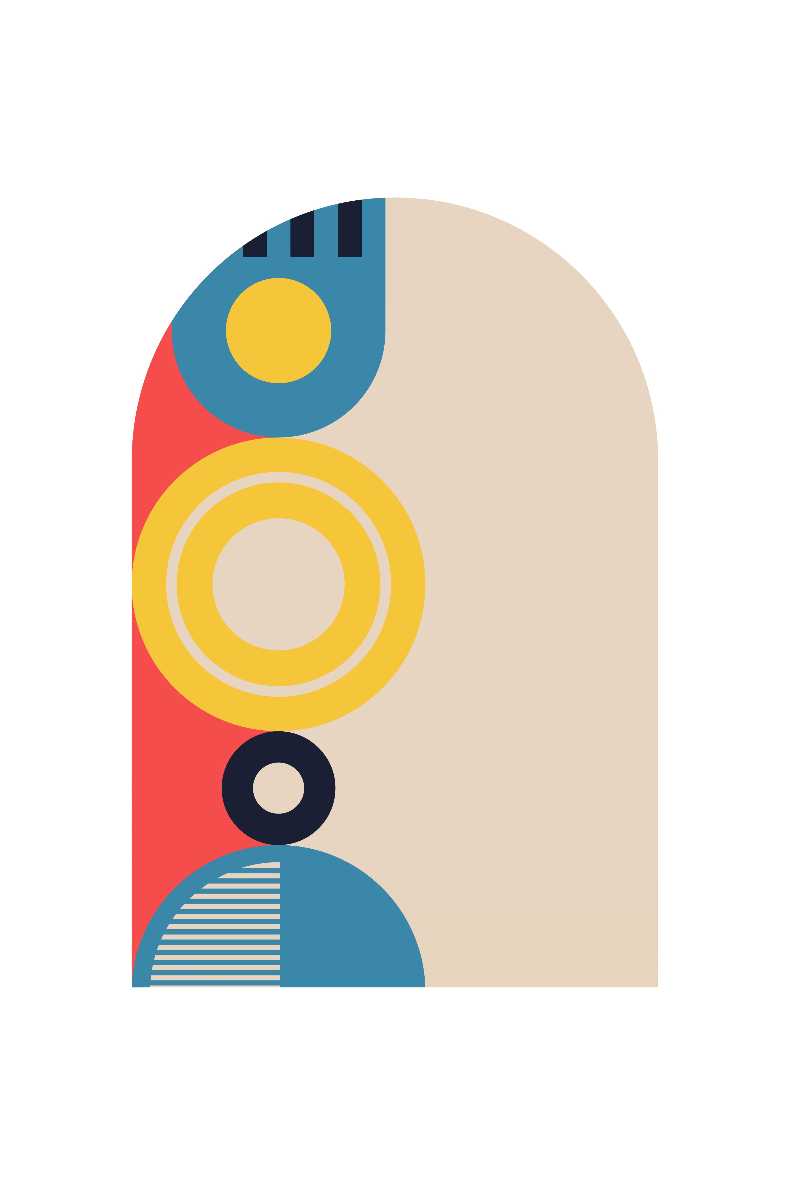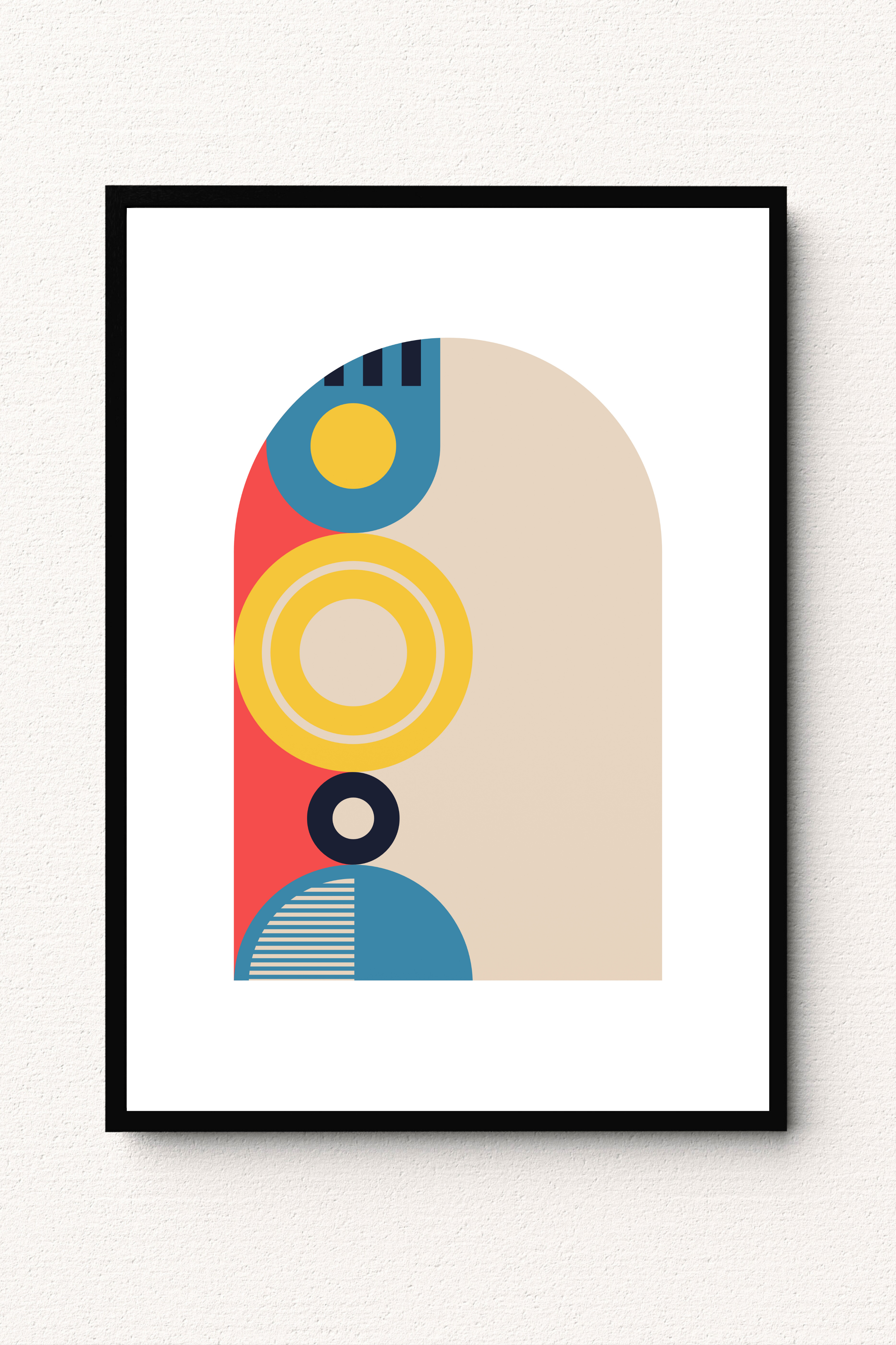 This artwork brings together bold geometric forms and an arched composition to create a sense of balance and quiet focus. The layered shapes and modern color palette guide the eye inward, offering a calming visual rhythm that feels structured yet expressive. Designed to complement contemporary interiors, it adds depth and intention to living spaces, bedrooms, or curated gallery walls while maintaining a refined and composed presence.
