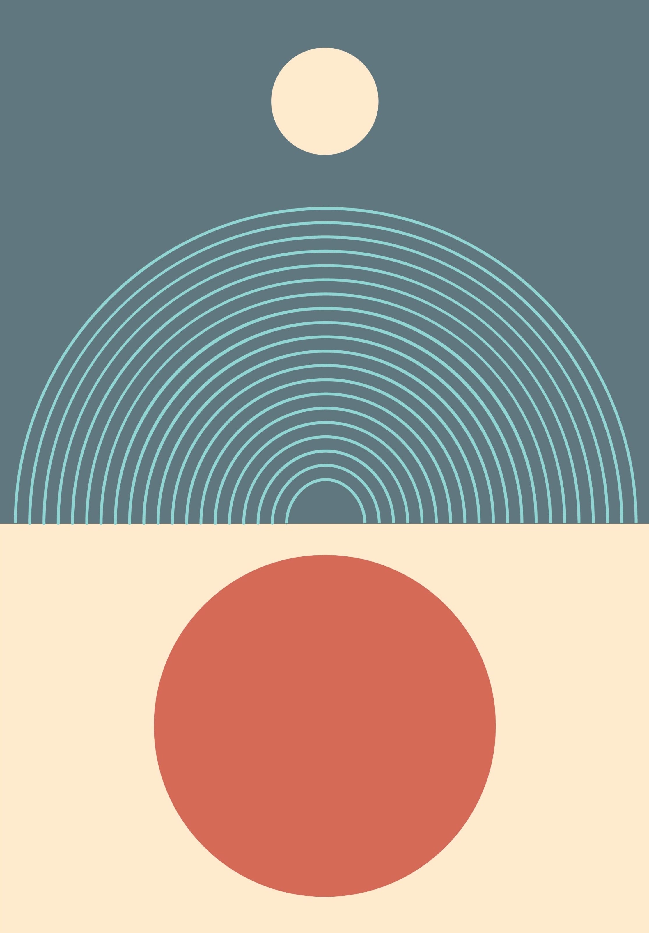 This artwork captures a sense of stillness through concentric arches and a soft horizon line that gently draws the eye inward. The balanced geometry and warm accent tones evoke quiet movement and modern elegance, making it ideal for interiors that value harmony and thoughtful design. Whether styled alone or as part of a set, it brings visual calm and refined character to your space.