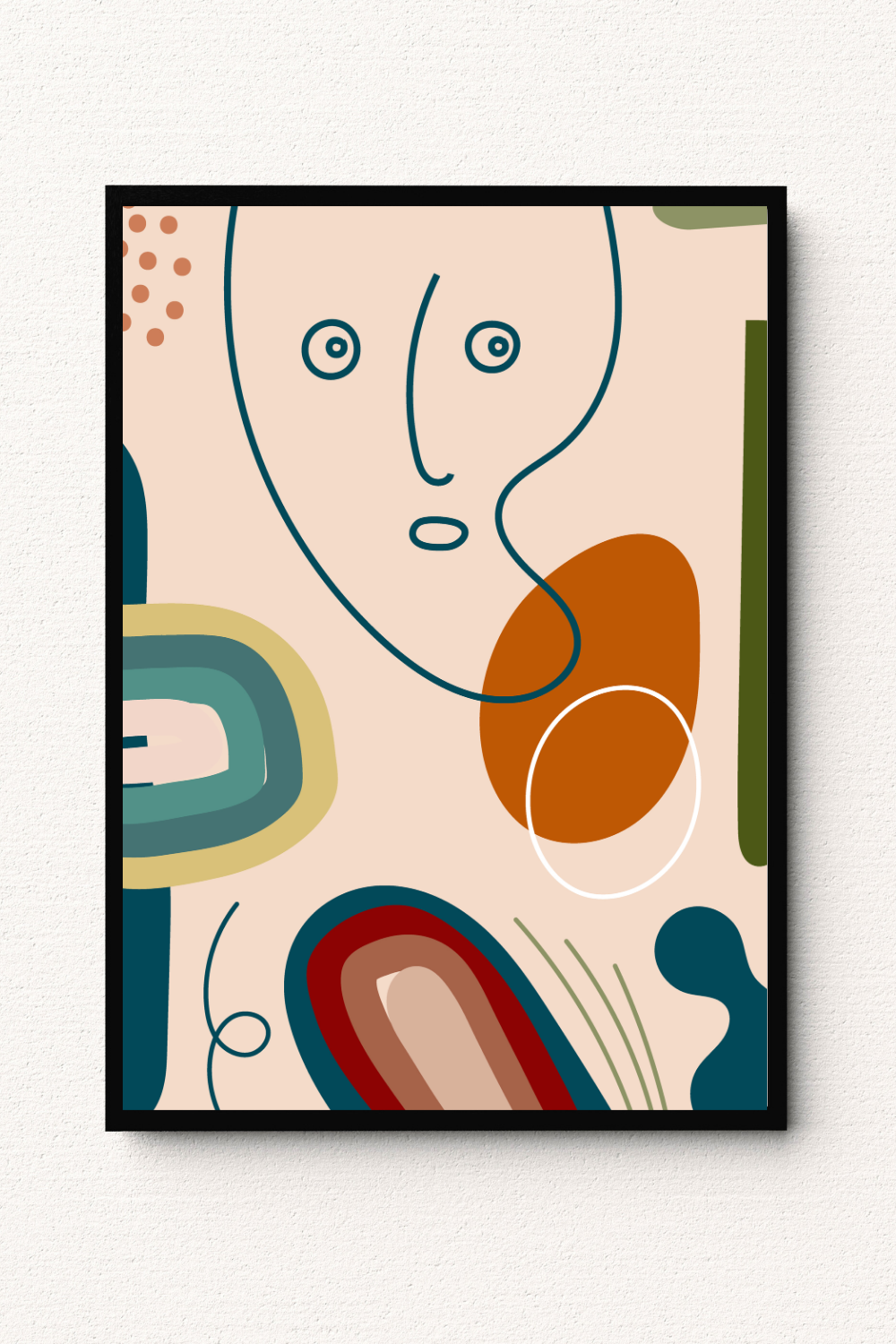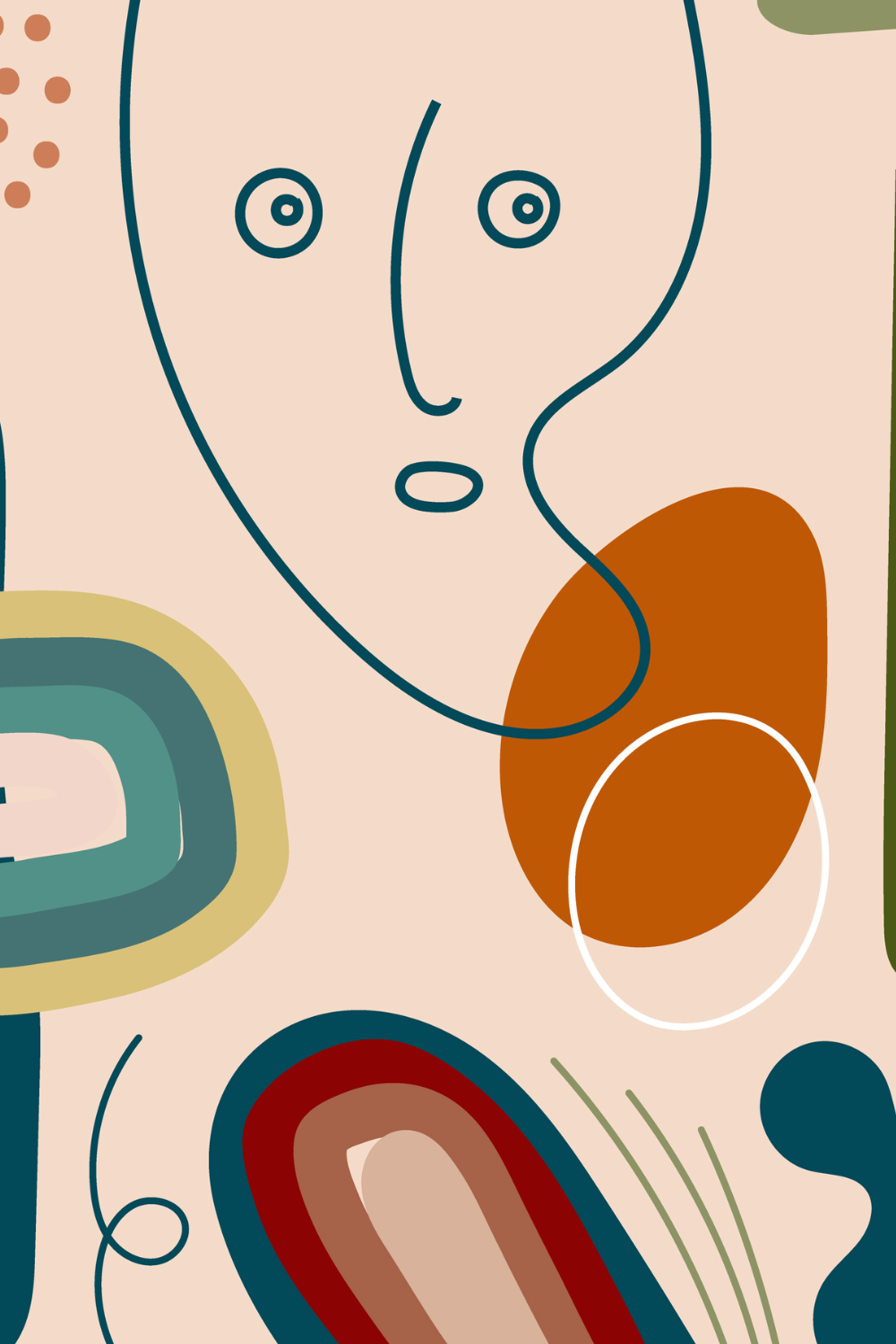 A fluid line portrait meets bold organic shapes in warm terracotta, deep teal, muted sage, and soft beige. The abstract face composition creates movement and emotion while layered forms add depth and balance. You bring character, artistry, and modern bohemian elegance into your space with this expressive contemporary statement piece.