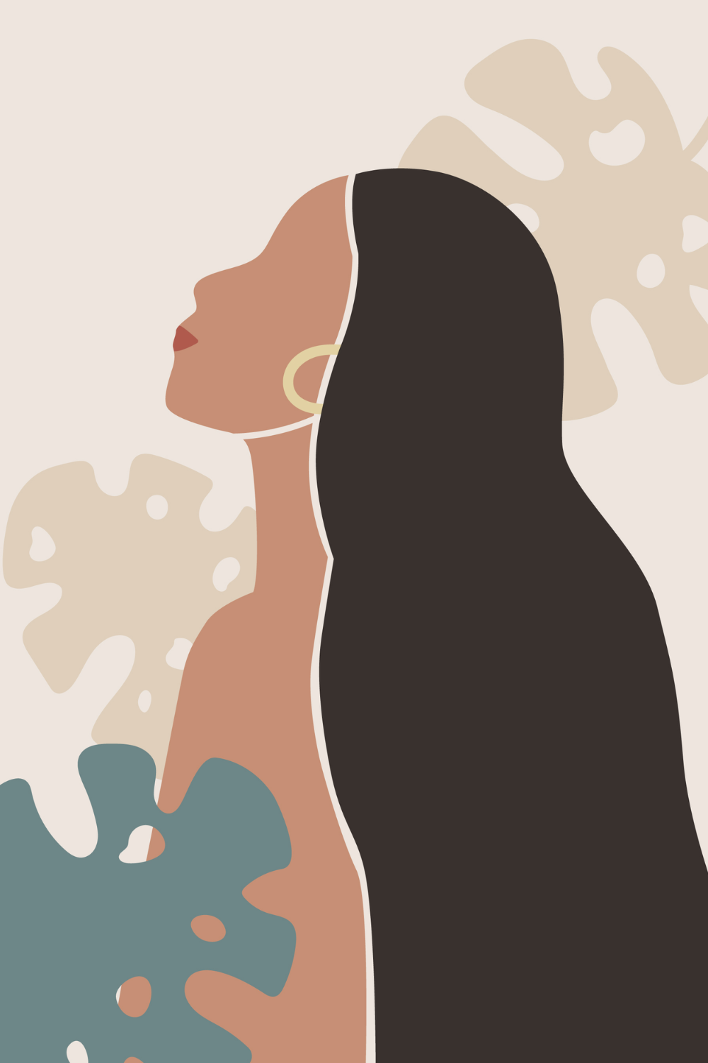 A graceful feminine profile emerges in warm sienna tones, framed by flowing dark contours and soft botanical forms in muted sage and sand. The subtle golden hoop accent adds depth and quiet radiance against the neutral backdrop. You bring warmth, confidence, and modern elegance into your space with this refined artistic statement.