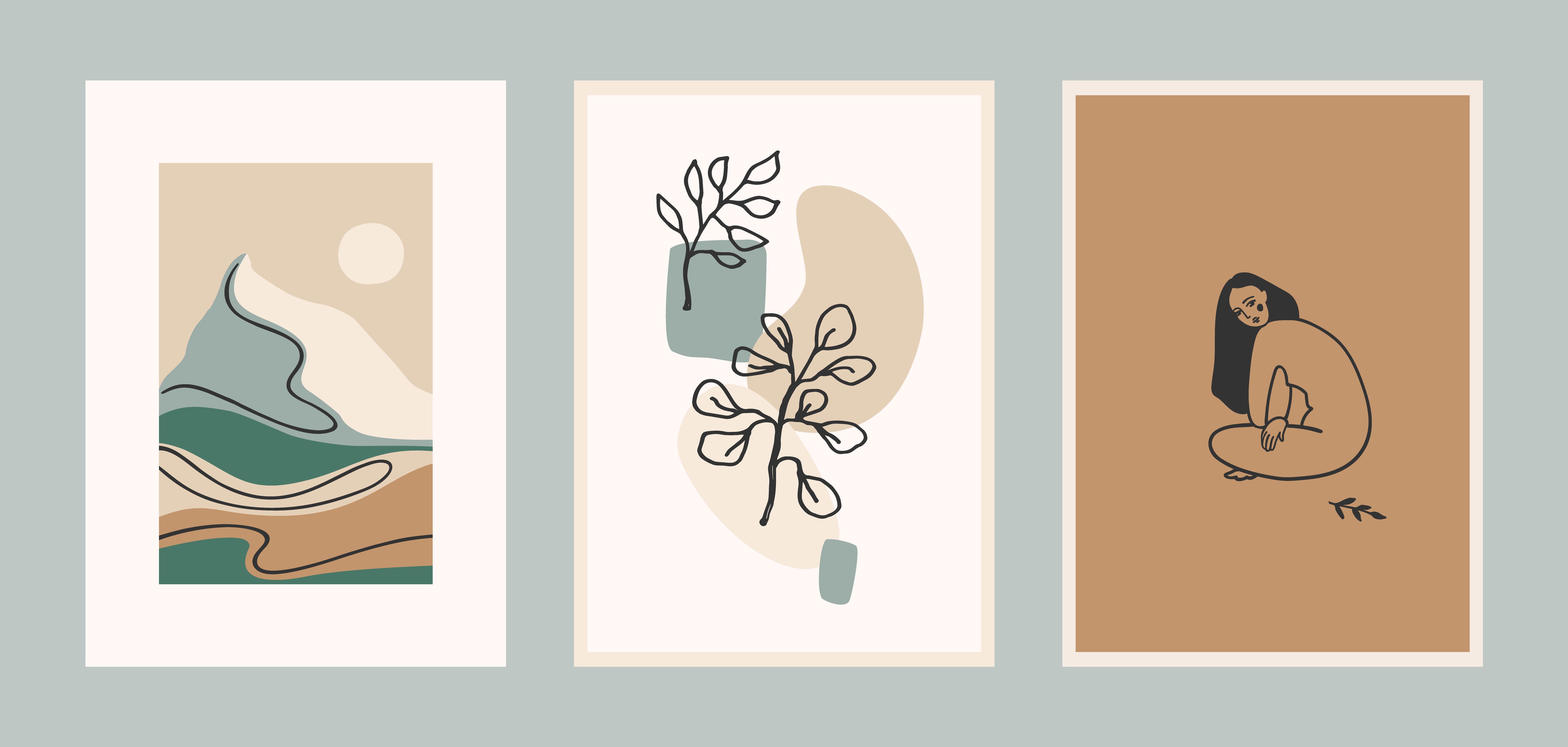 Delicate black linework branches unfold across soft sage and warm sand shapes, creating a balanced composition with subtle depth and organic movement. The muted palette and fluid contours bring a sense of calm refinement. You introduce effortless warmth and modern minimalism into your space with this serene botanical design.