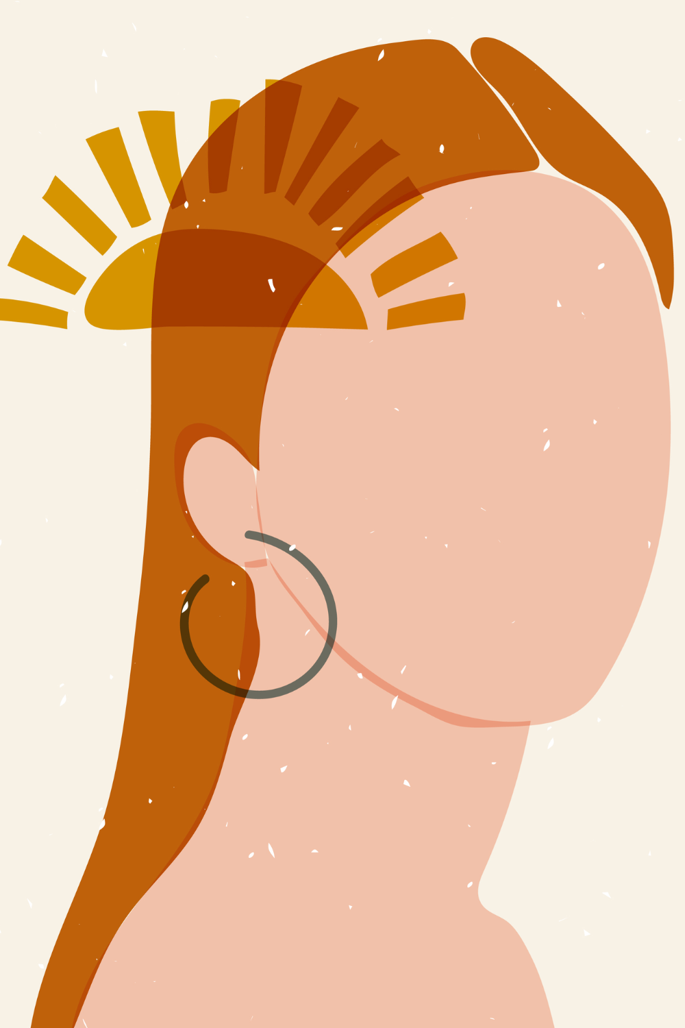 A bold feminine profile emerges in warm terracotta tones, framed by flowing amber hair and radiant sun accents that create a soft golden halo. Subtle layered textures and clean contours add depth while maintaining a refined minimalist aesthetic. You bring warmth, confidence, and luminous modern elegance into your space with this striking artistic statement.