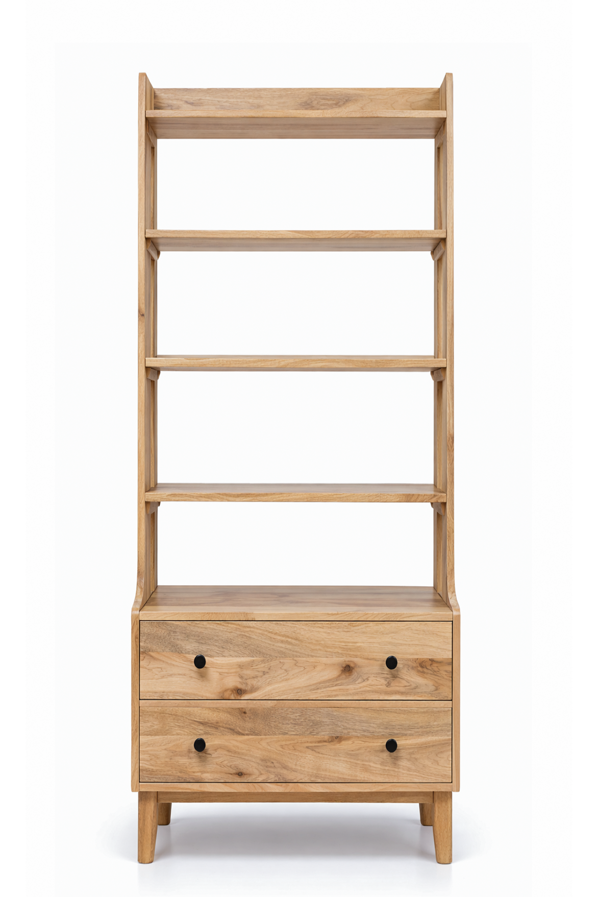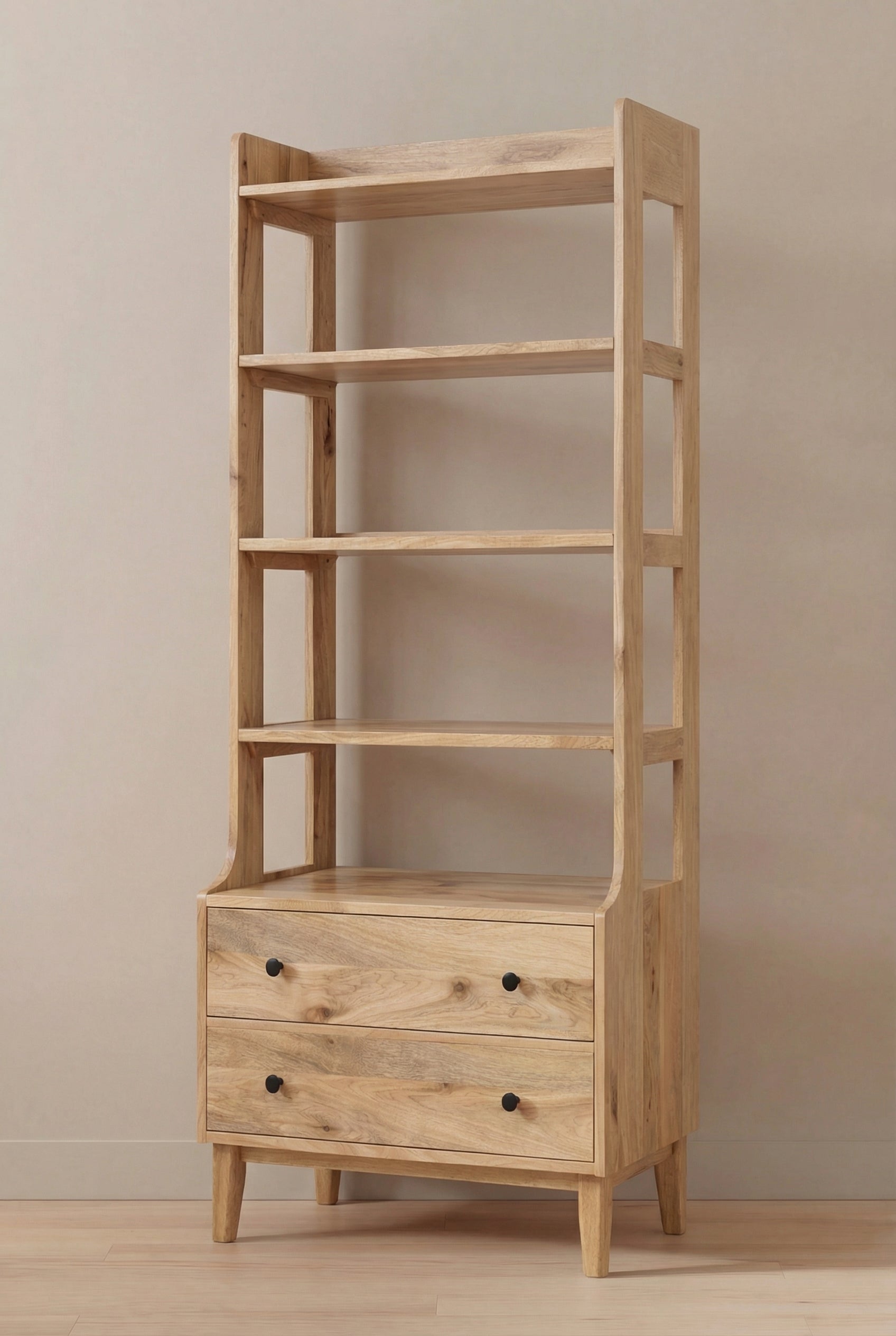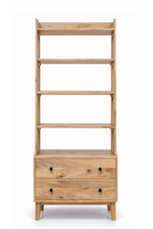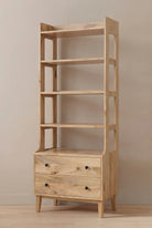 Alain Wooden Bookcase features warm natural wood with visible grain patterns that add depth and authenticity to your interior. Its tall open shelving creates a clean vertical silhouette, perfect for styling books and sculptural decor, while the lower drawers provide concealed storage for a balanced and refined look. With its soft edges and minimalist structure, it enhances your space with organic warmth, modern simplicity, and understated elegance.