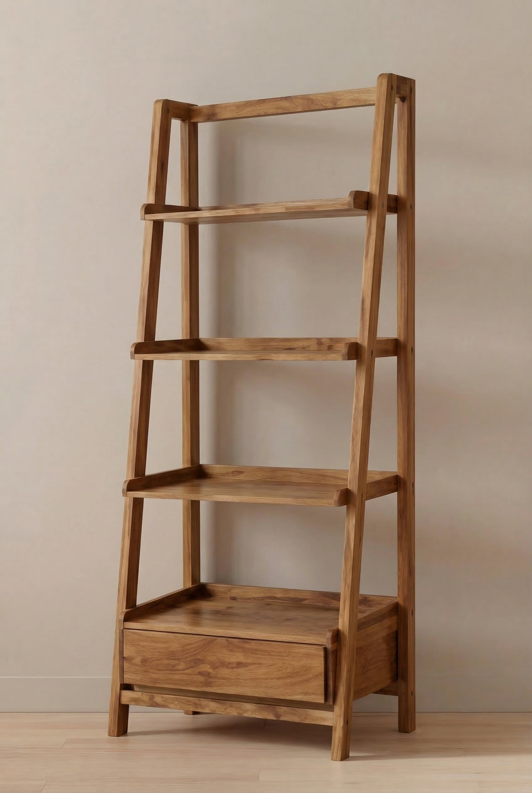 Crafted from solid mango wood, this ladder-style bookshelf brings warm grain and clean structure to your space. The open stepped design keeps the room feeling light while offering generous display space for books, ceramics, framed art, and plants. A sturdy base shelf adds extra storage for larger pieces, and the gently angled profile creates a relaxed, modern look that suits living rooms, home offices, and styled corners.