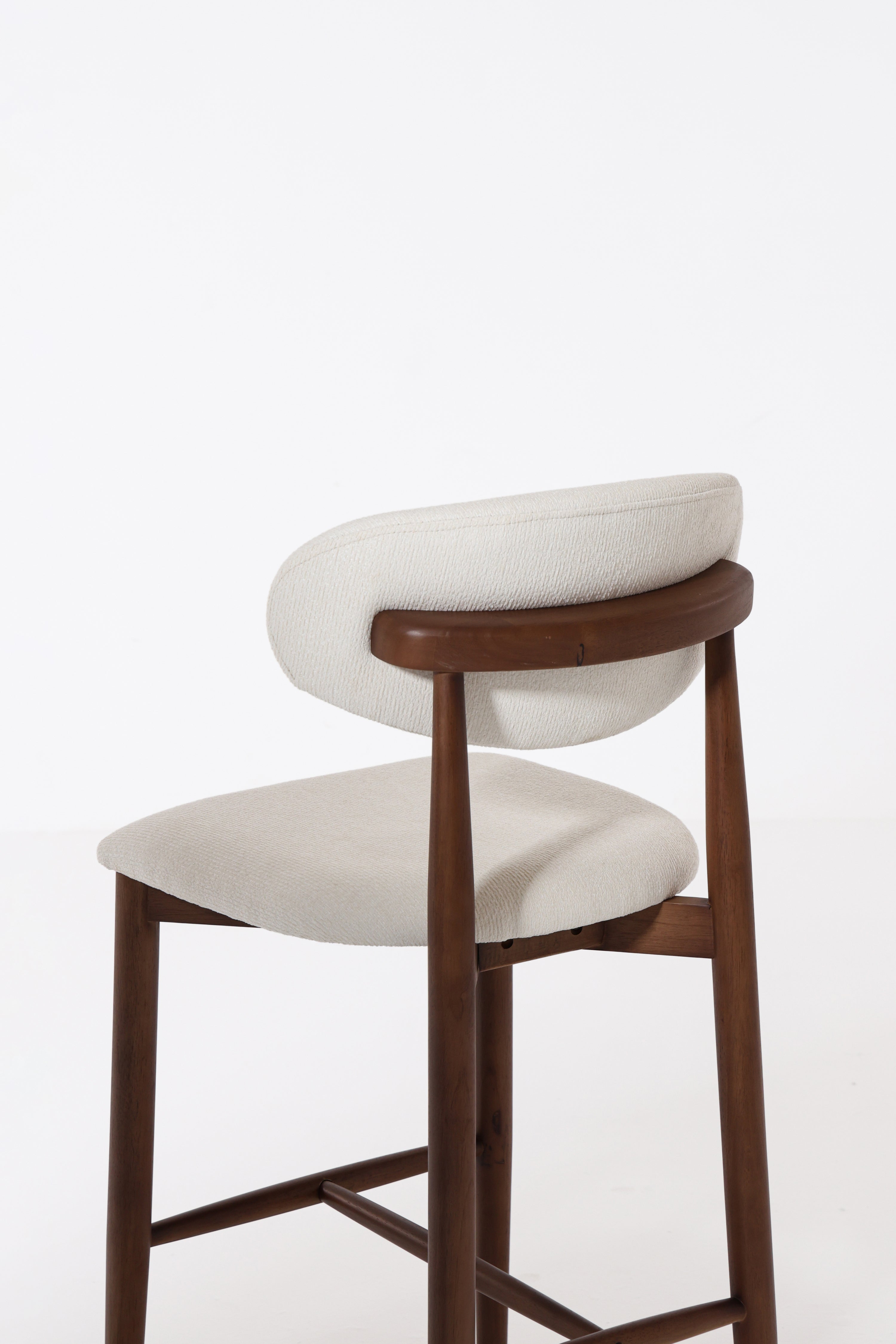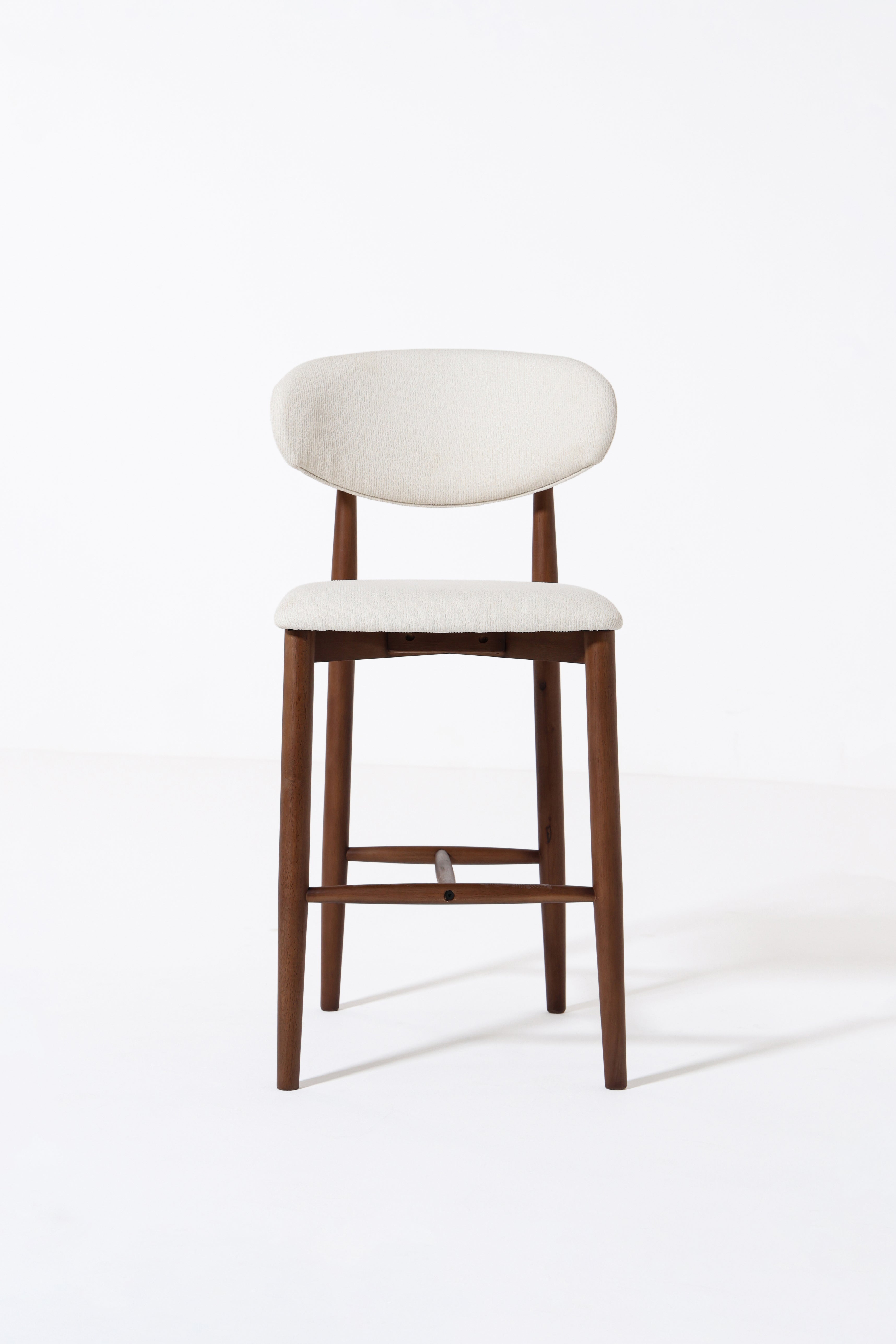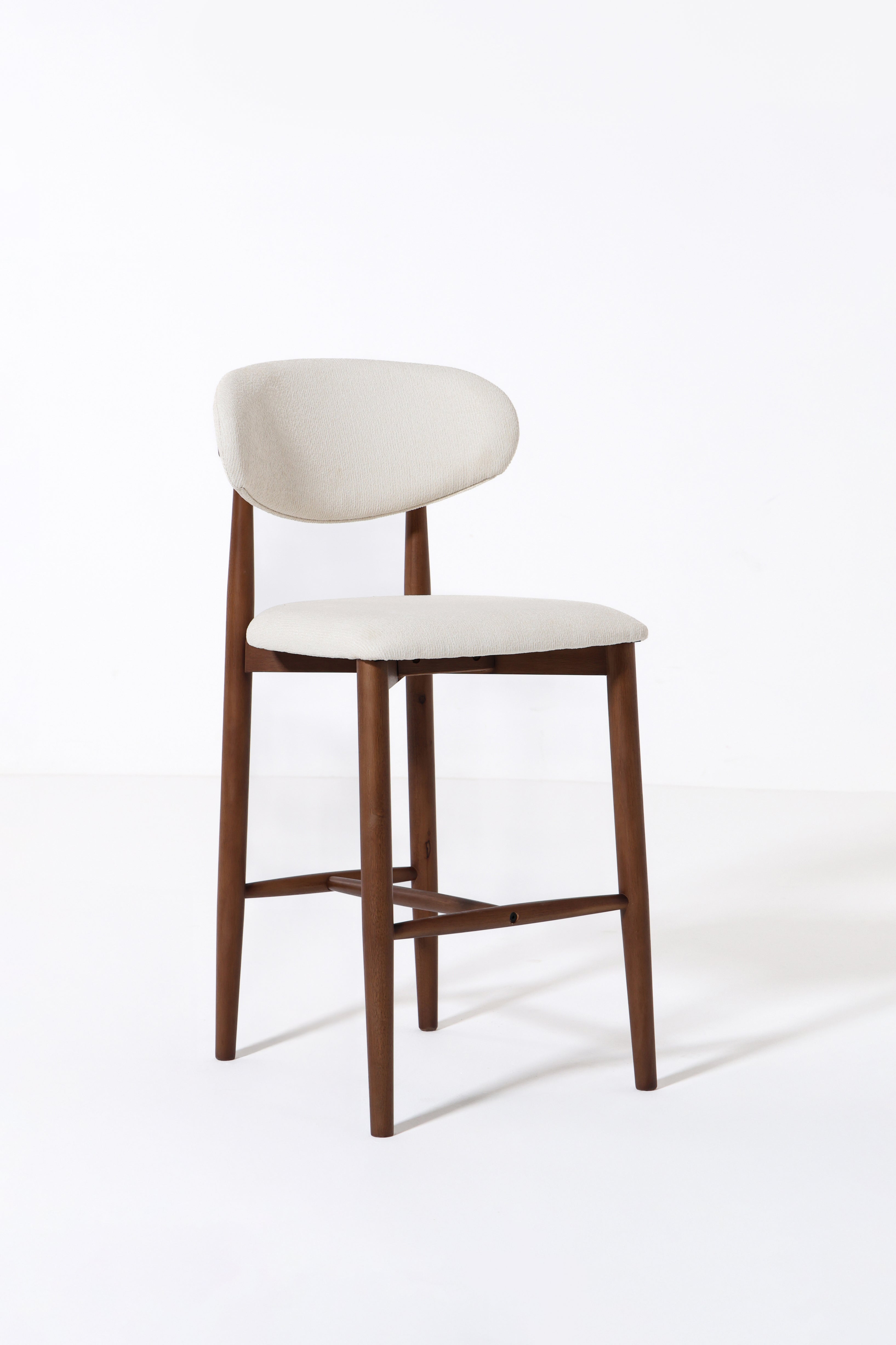 Crafted with a warm wooden frame and slim tapered legs, it radiates natural elegance while ensuring lasting durability. The off-white upholstered seat and gently curved backrest embrace you with support and sophistication, inviting long conversations and relaxed moments. Inspired by mid-century design, its versatile silhouette complements modern, Scandinavian, and transitional interiors alike. A refined yet practical addition, this stool elevates dining and entertaining with effortless style.