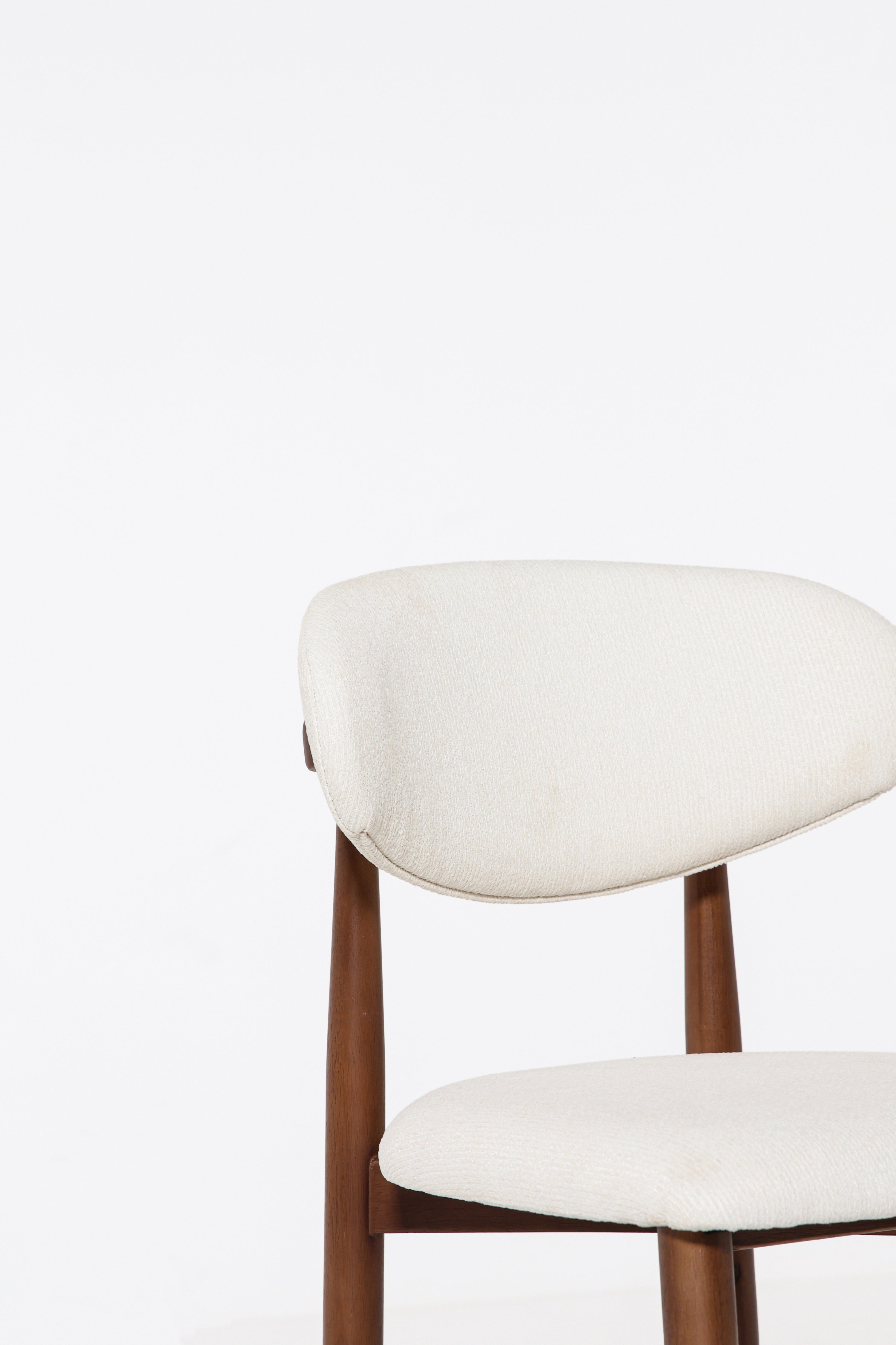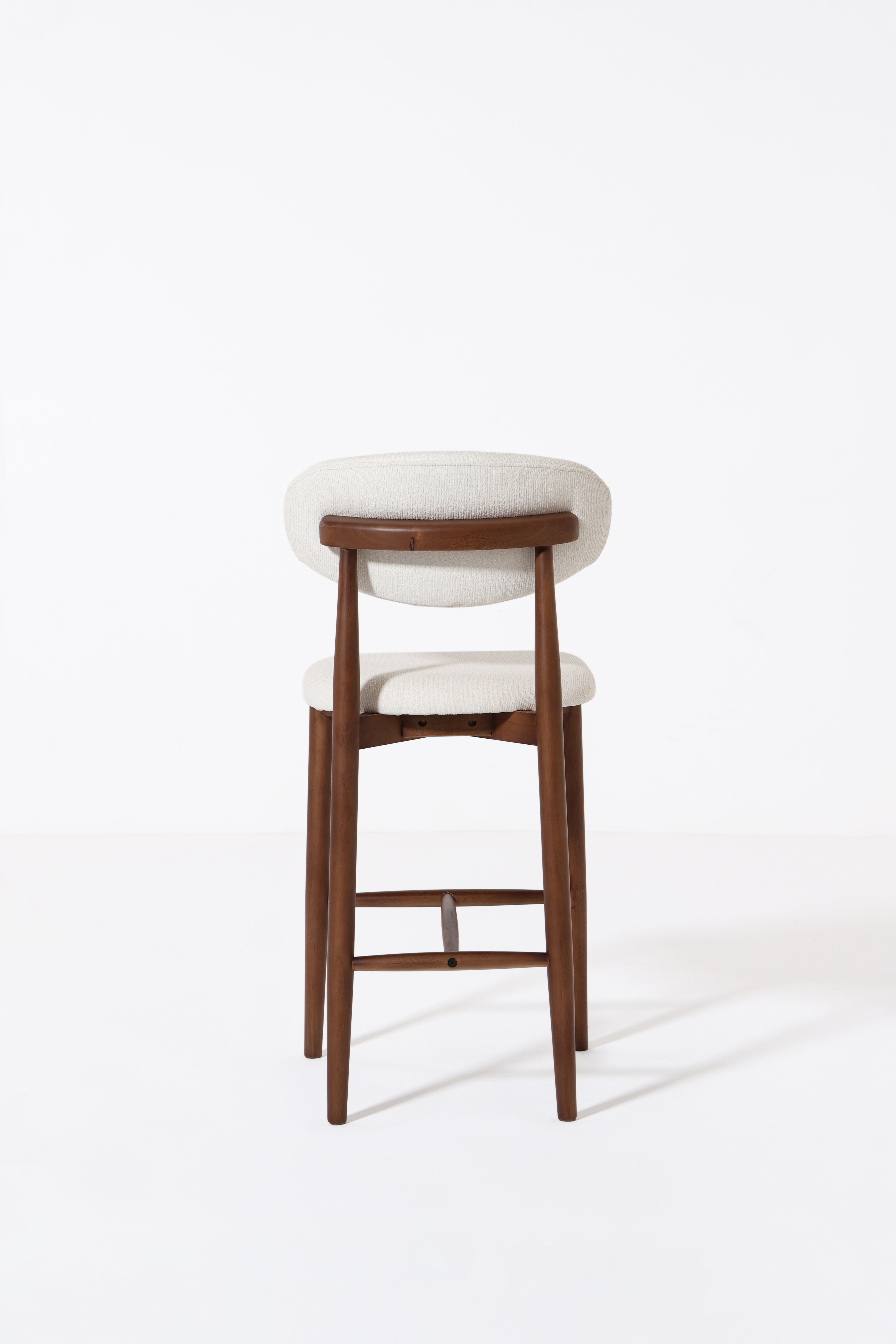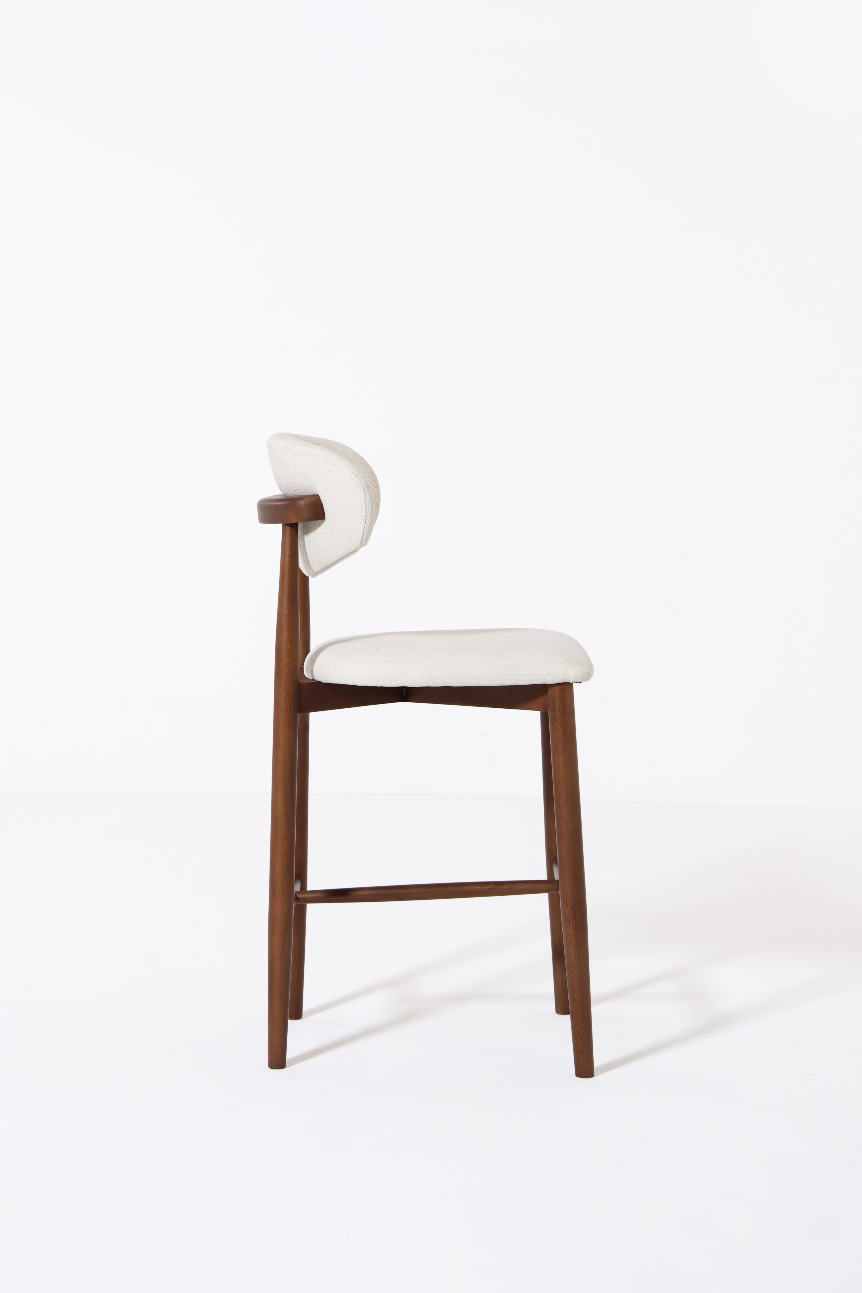Crafted with a warm wooden frame and slim tapered legs, it radiates natural elegance while ensuring lasting durability. The off-white upholstered seat and gently curved backrest embrace you with support and sophistication, inviting long conversations and relaxed moments. Inspired by mid-century design, its versatile silhouette complements modern, Scandinavian, and transitional interiors alike. A refined yet practical addition, this stool elevates dining and entertaining with effortless style.