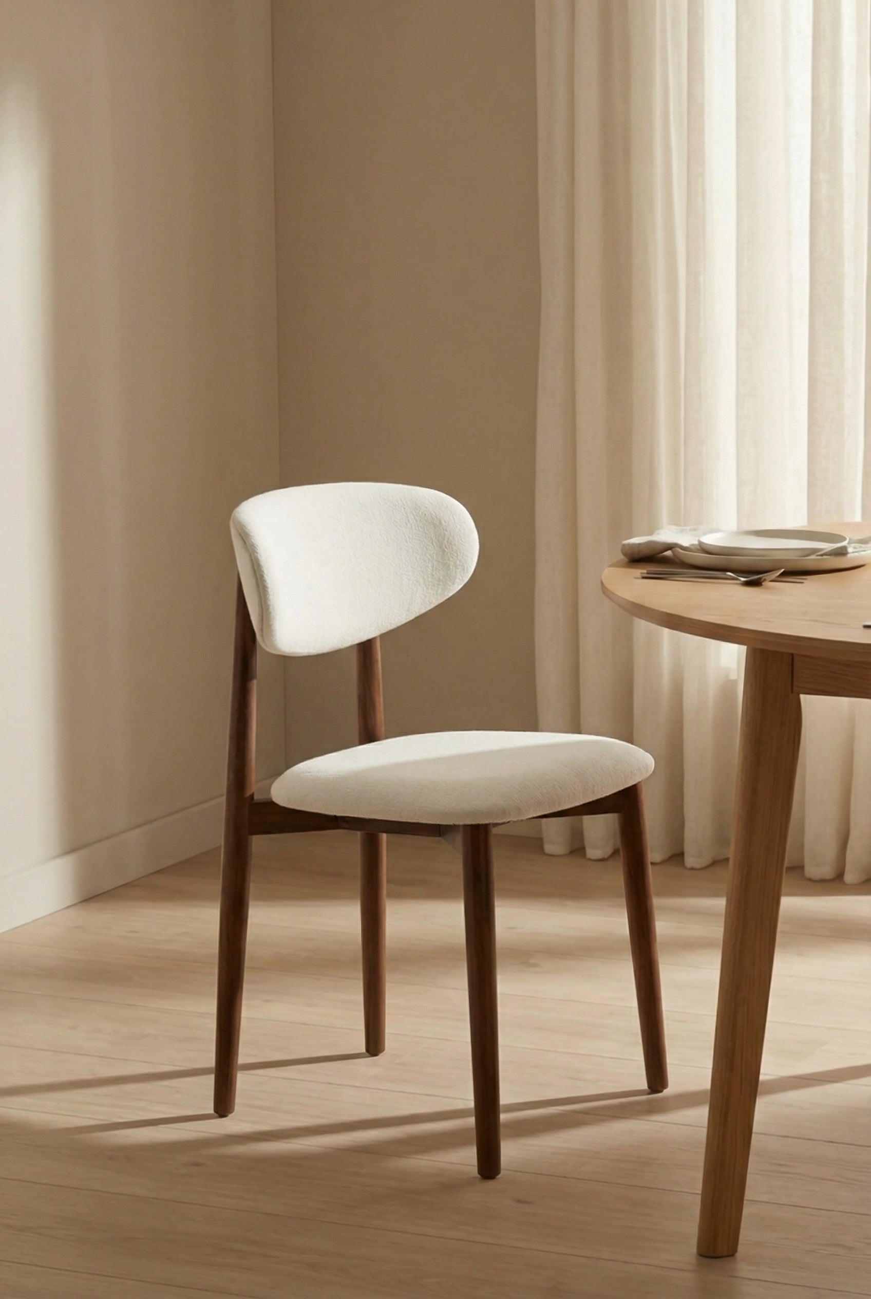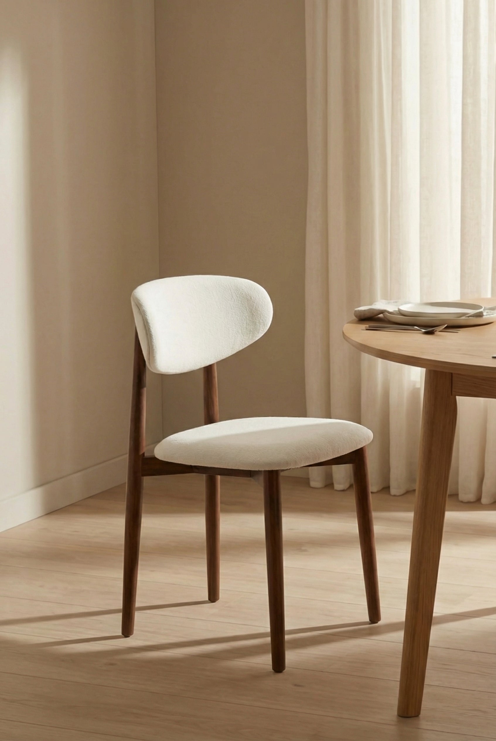 Bring refined simplicity to your dining space with a chair that balances timeless style and comfort. A warm walnut-finished wooden frame with slim tapered legs showcases natural grain and durability, while the softly upholstered seat and gently curved backrest in light off-white fabric provide inviting support. Inspired by mid-century design, the versatile silhouette blends seamlessly into modern, Scandinavian, and transitional interiors, turning every meal into a stylish gathering.