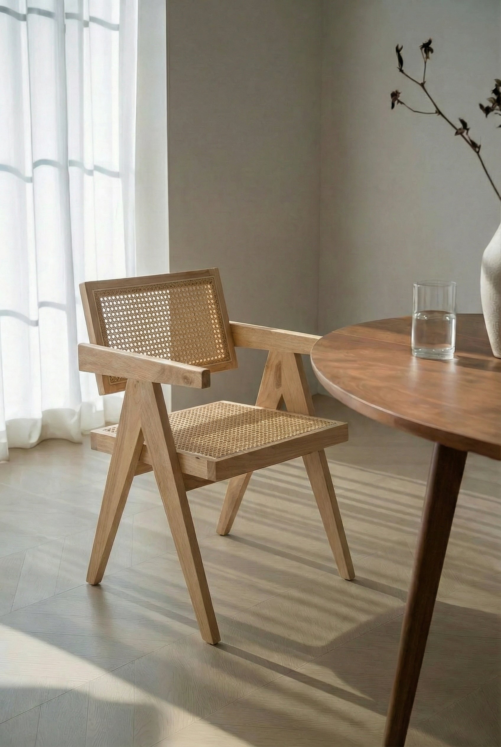 Crafted for effortless everyday elegance, this dining chair blends clean architectural lines with the warm, organic charm of woven rattan for a look that feels both modern and timeless. The light wood frame brings a natural airy presence to your dining space, while the cane seat and backrest add texture, comfort, and a beautifully relaxed finish. Perfect for styling around minimalist tables or pairing with soft neutral interiors, it creates a welcoming atmosphere that feels elevated without ever trying too hard, making every meal feel a little more curated and calm.