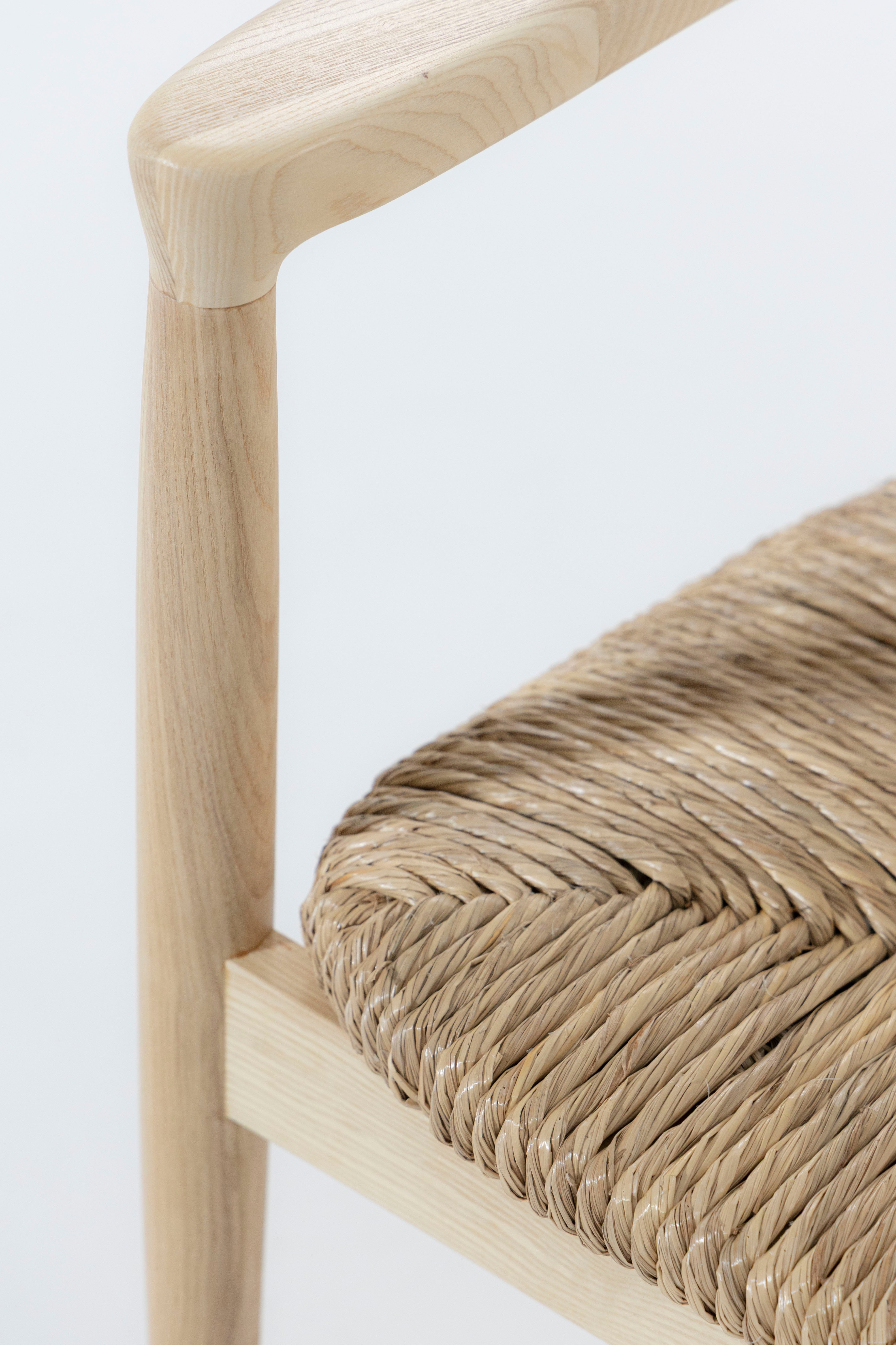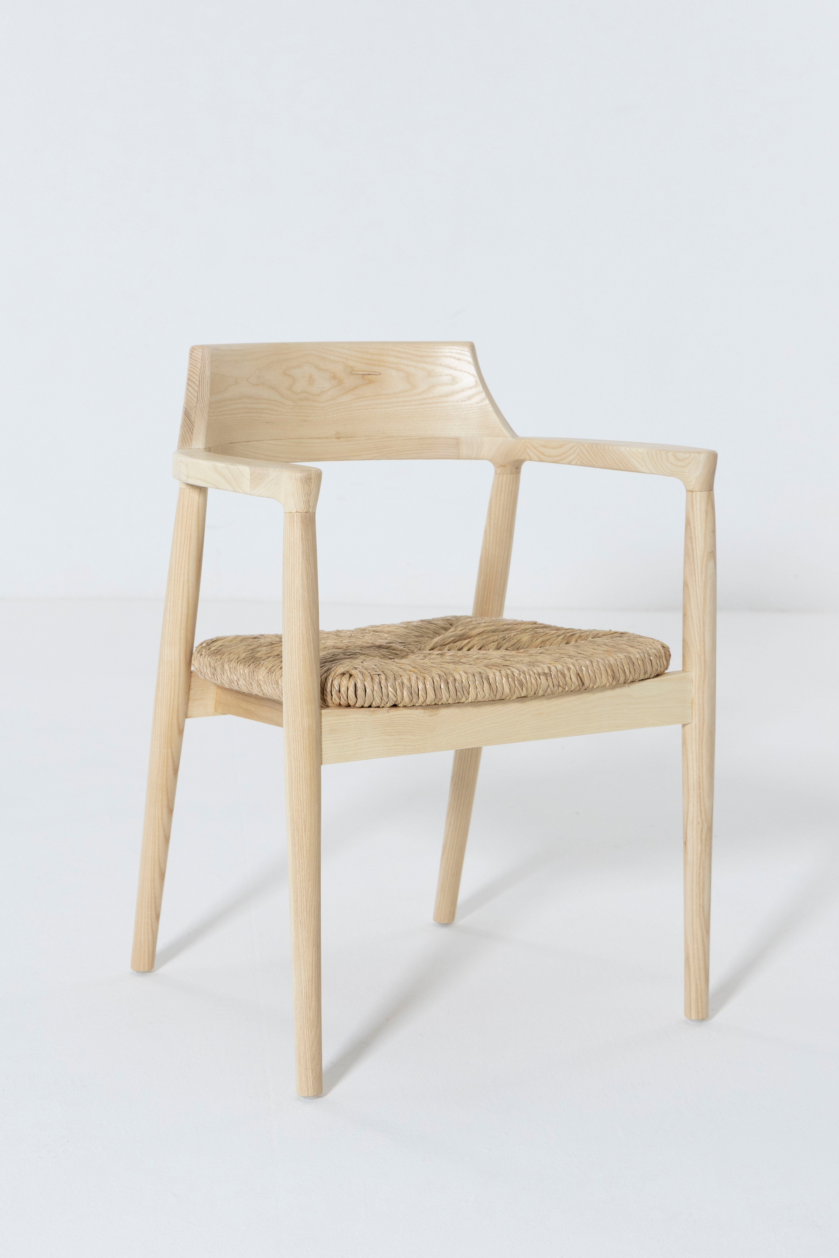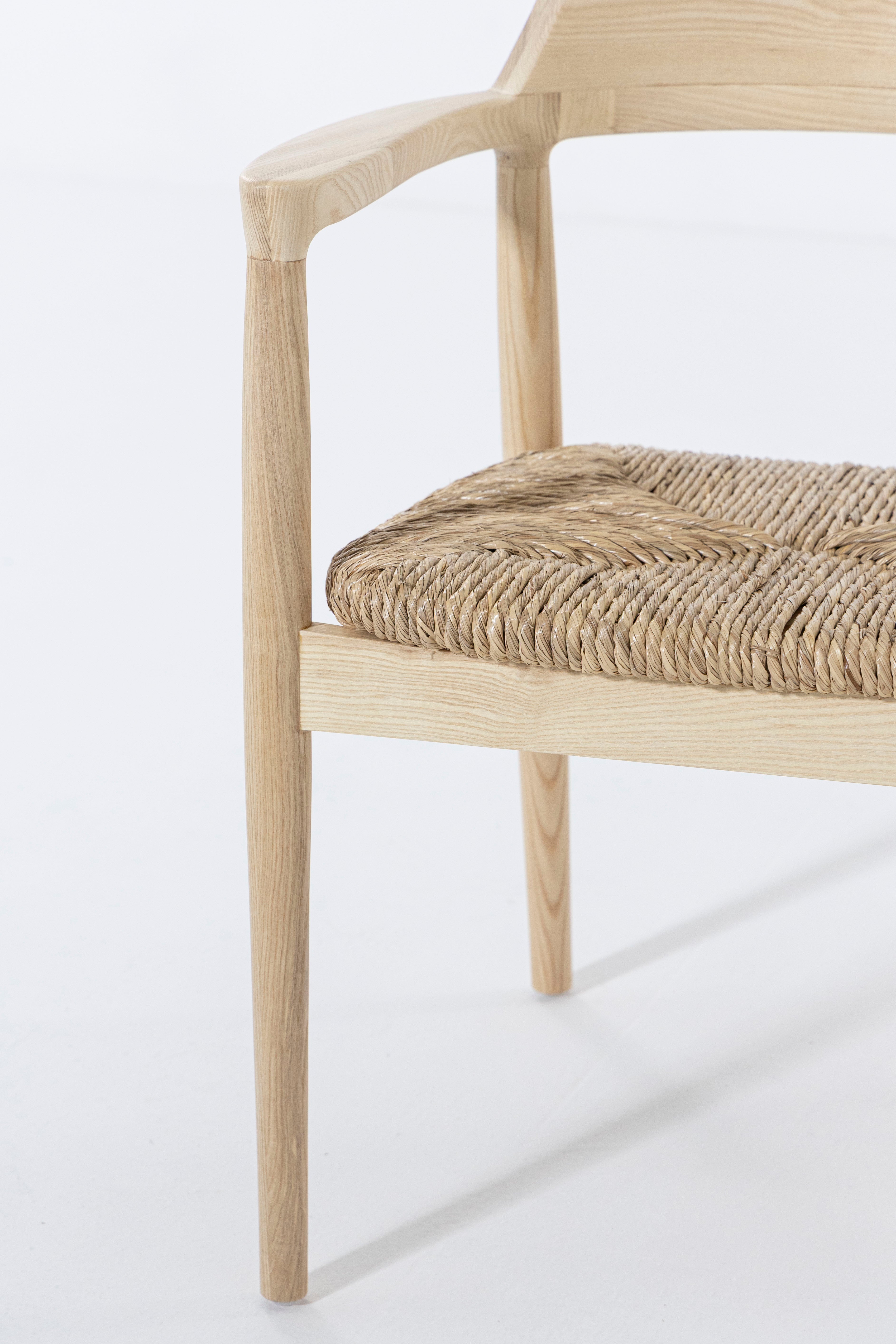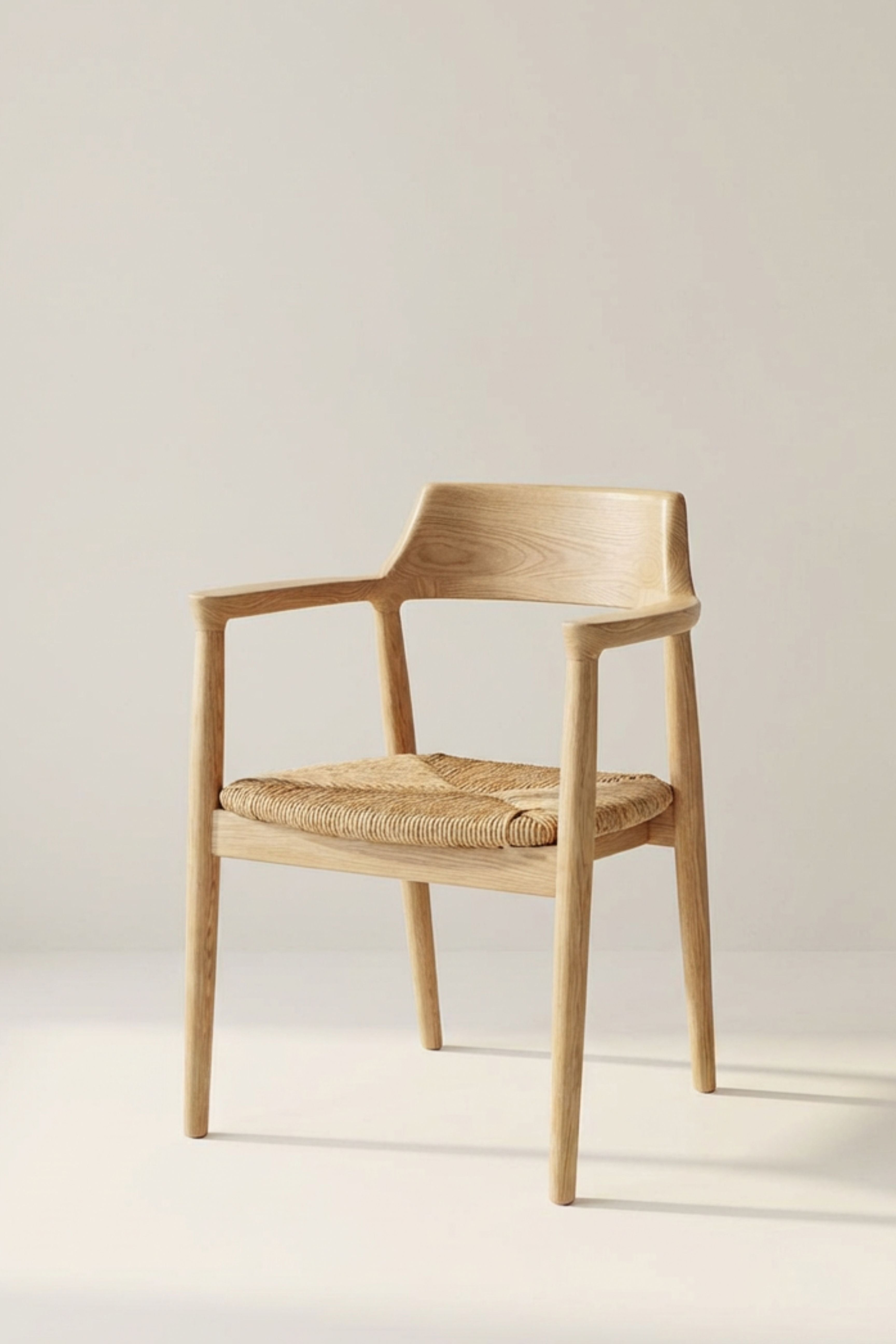 Crafted from smooth Ash wood and complemented by a handwoven rattan seat, this dining chair brings natural warmth and refined craftsmanship to any space. Its gently curved back and subtle arm detailing create a sculptural silhouette that balances comfort with clean minimalist lines. The airy rattan weave adds texture and breathability, while the sturdy Ash wood frame offers lasting durability and timeless appeal. Designed to blend seamlessly with Scandinavian, modern, and coastal-inspired interiors, this chair provides both style and everyday comfort, making it an elegant addition to any dining setting.