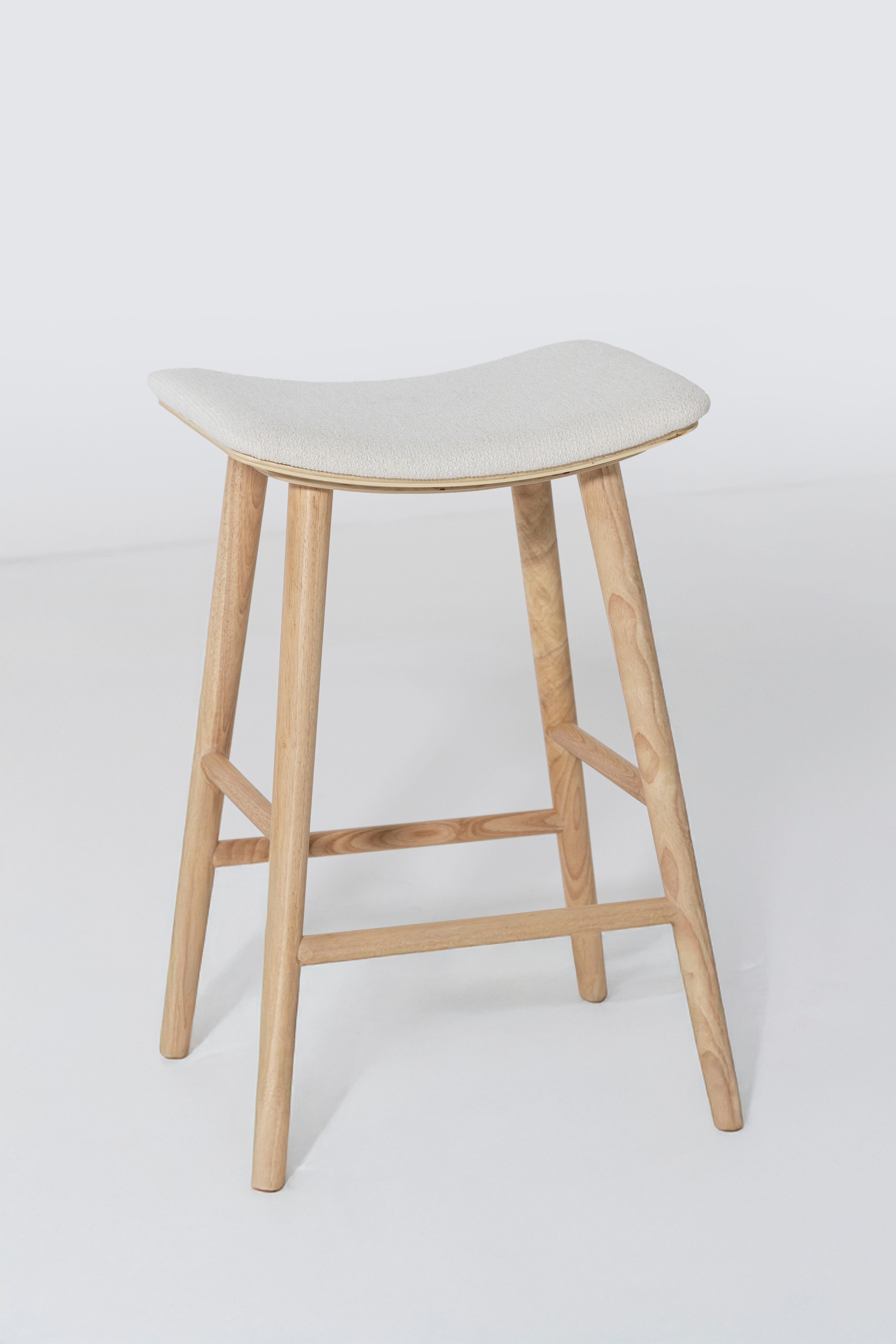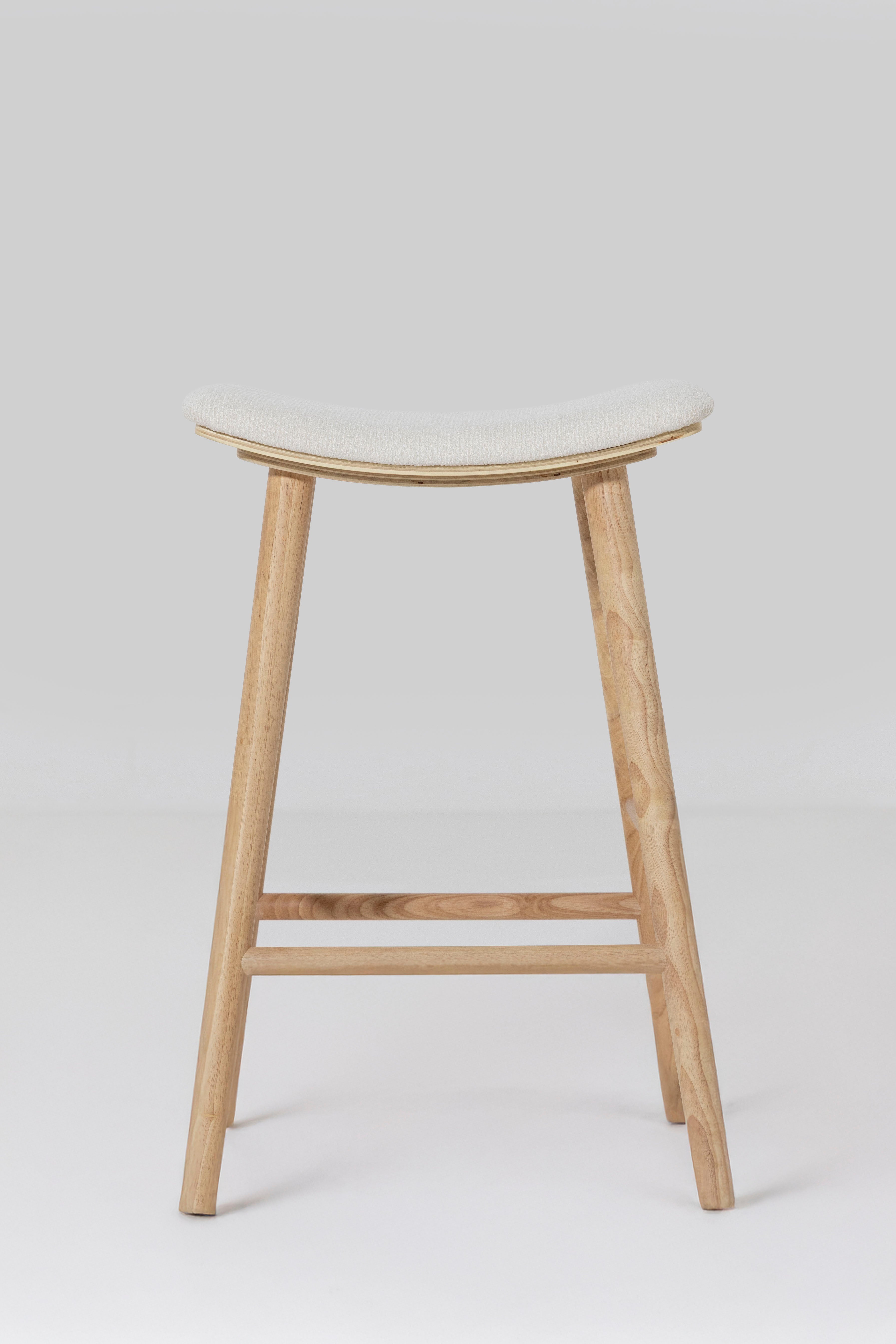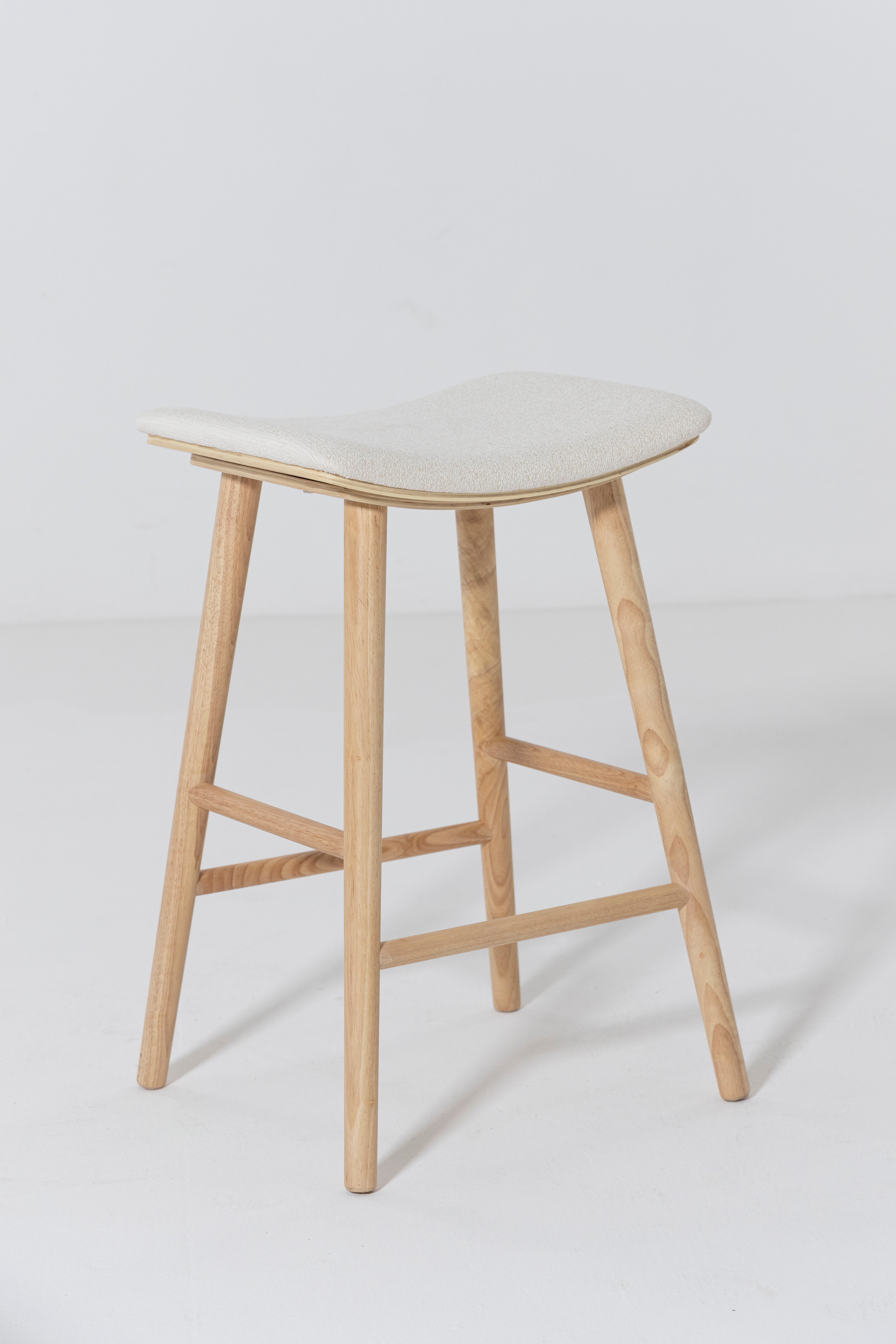 Crafted from solid ash wood, this clean backless counter stool showcases a refined natural finish that highlights the wood’s soft grain and tonal depth. A cushioned Sahara white fabric seat adds subtle contrast while offering everyday comfort for relaxed dining moments. The gently curved top supports ease of use, while rounded legs and understated stretcher bars deliver stability without visual heaviness. Designed to blend seamlessly into modern kitchens, it slides effortlessly beneath islands and breakfast counters for a streamlined look.
