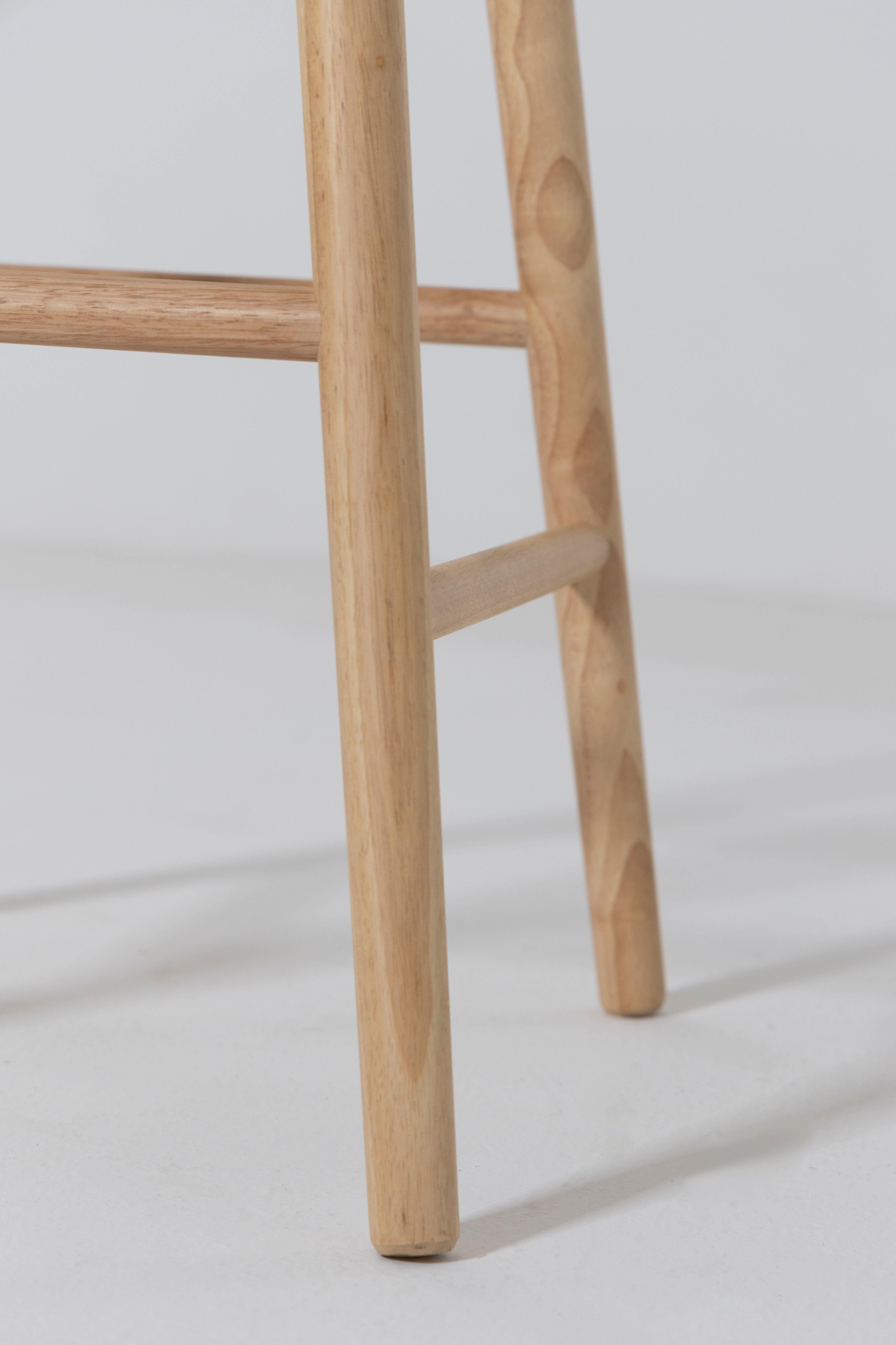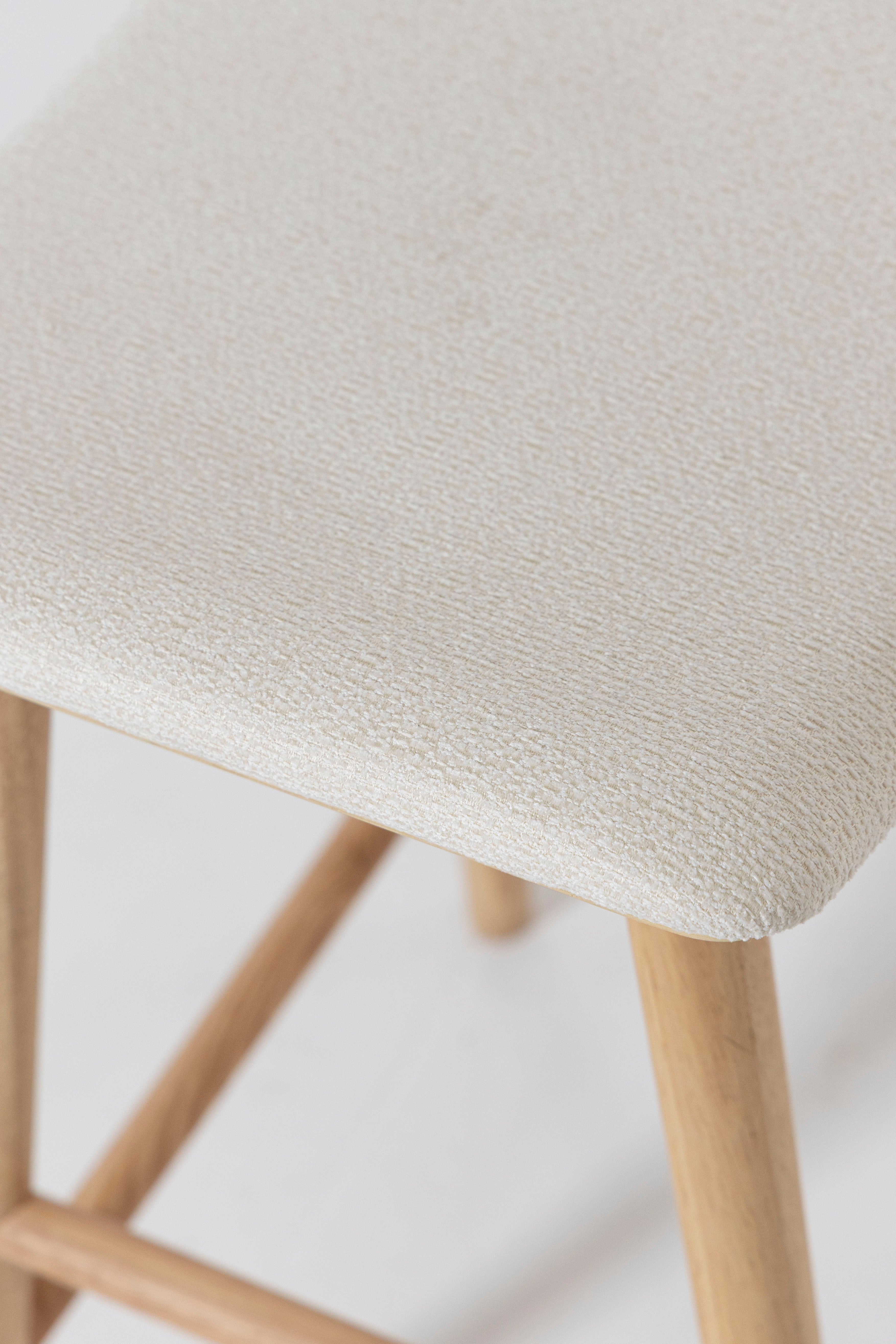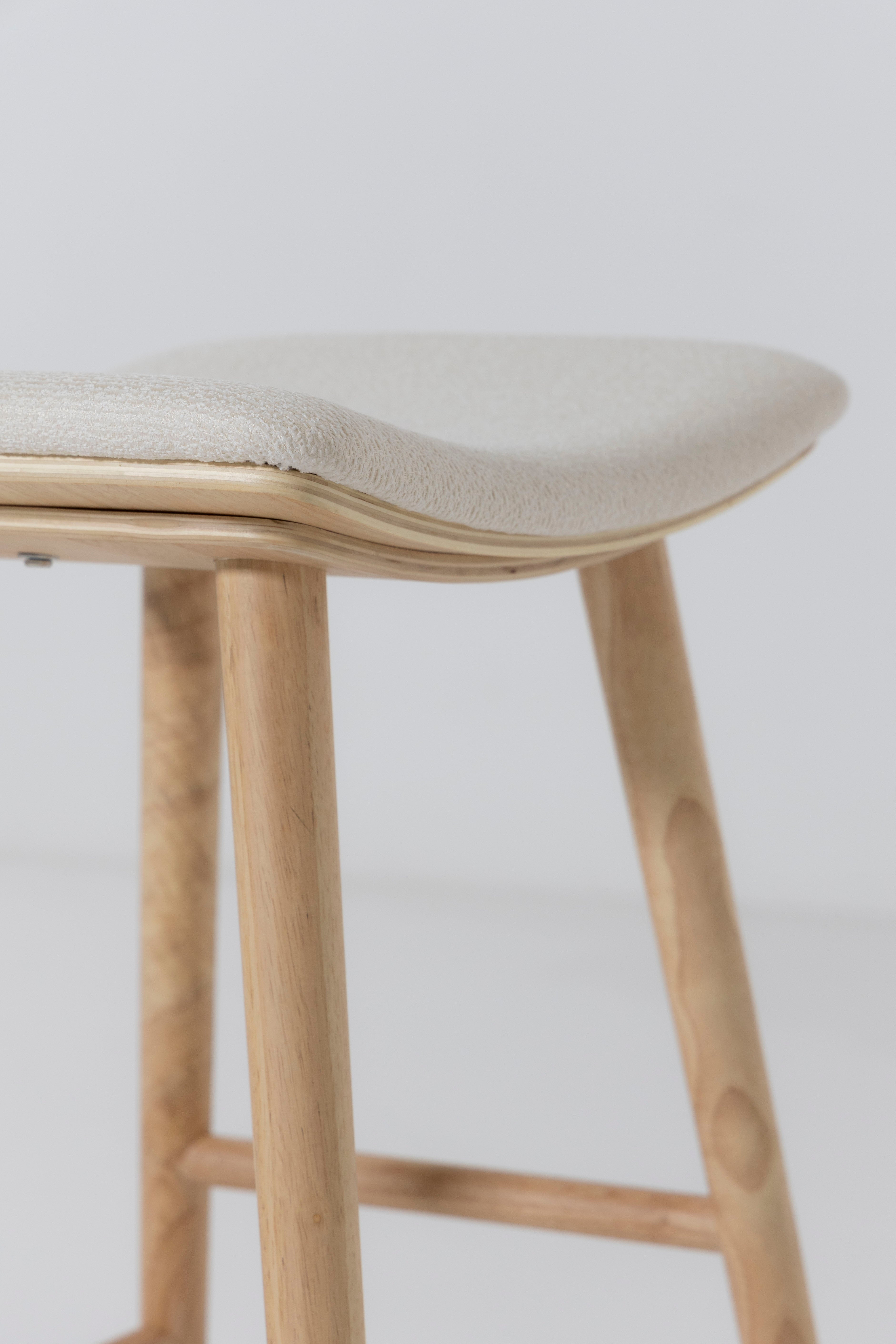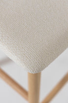Crafted from solid ash wood, this clean backless counter stool showcases a refined natural finish that highlights the wood’s soft grain and tonal depth. A cushioned Sahara white fabric seat adds subtle contrast while offering everyday comfort for relaxed dining moments. The gently curved top supports ease of use, while rounded legs and understated stretcher bars deliver stability without visual heaviness. Designed to blend seamlessly into modern kitchens, it slides effortlessly beneath islands and breakfast counters for a streamlined look.