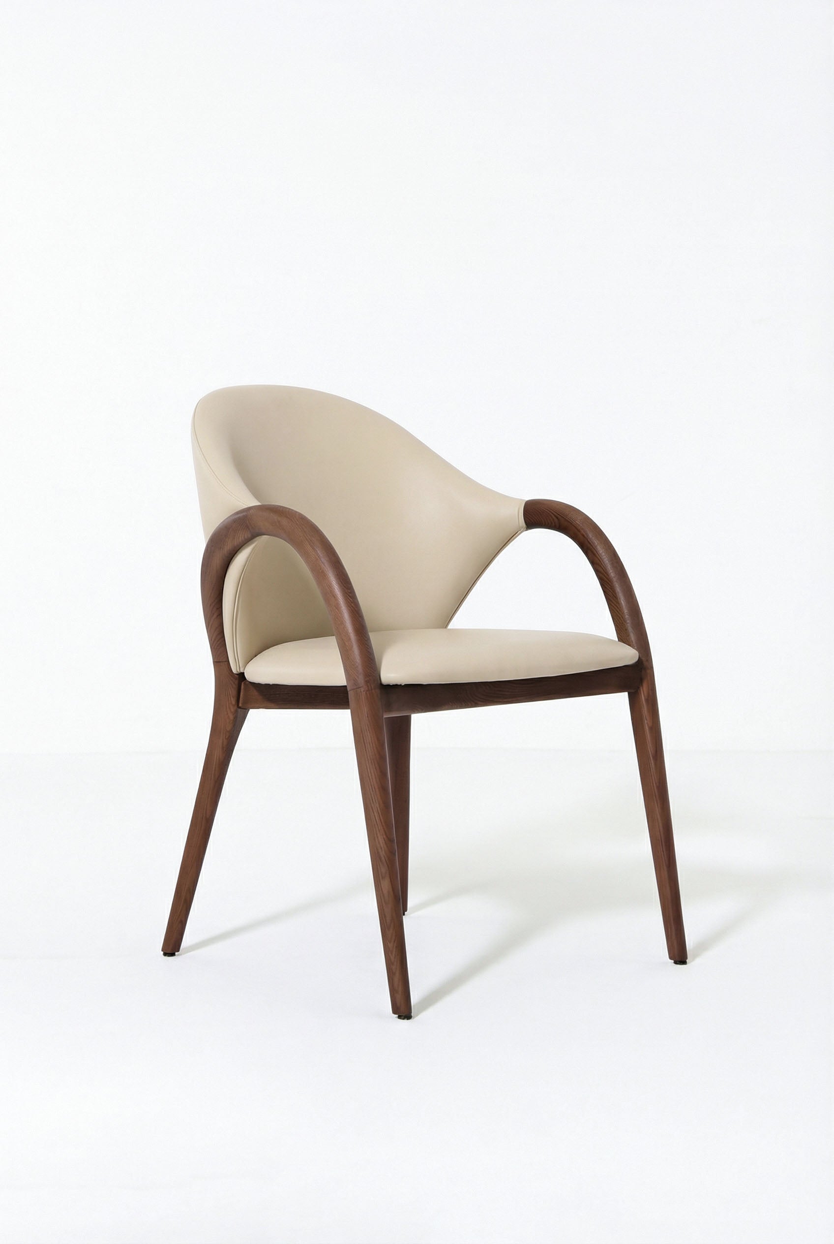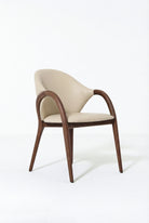Soft warm beige upholstery is paired with beautifully sculpted solid wood arms to create a dining chair that feels both welcoming and architecturally refined. The gently curved silhouette encourages relaxed posture while offering a sense of quiet luxury, making everyday dining feel intentional and elevated. Natural wood grain adds warmth and visual depth, allowing the piece to blend seamlessly into modern, contemporary, and softly organic interiors while placing comfort and craftsmanship at the center of your space.