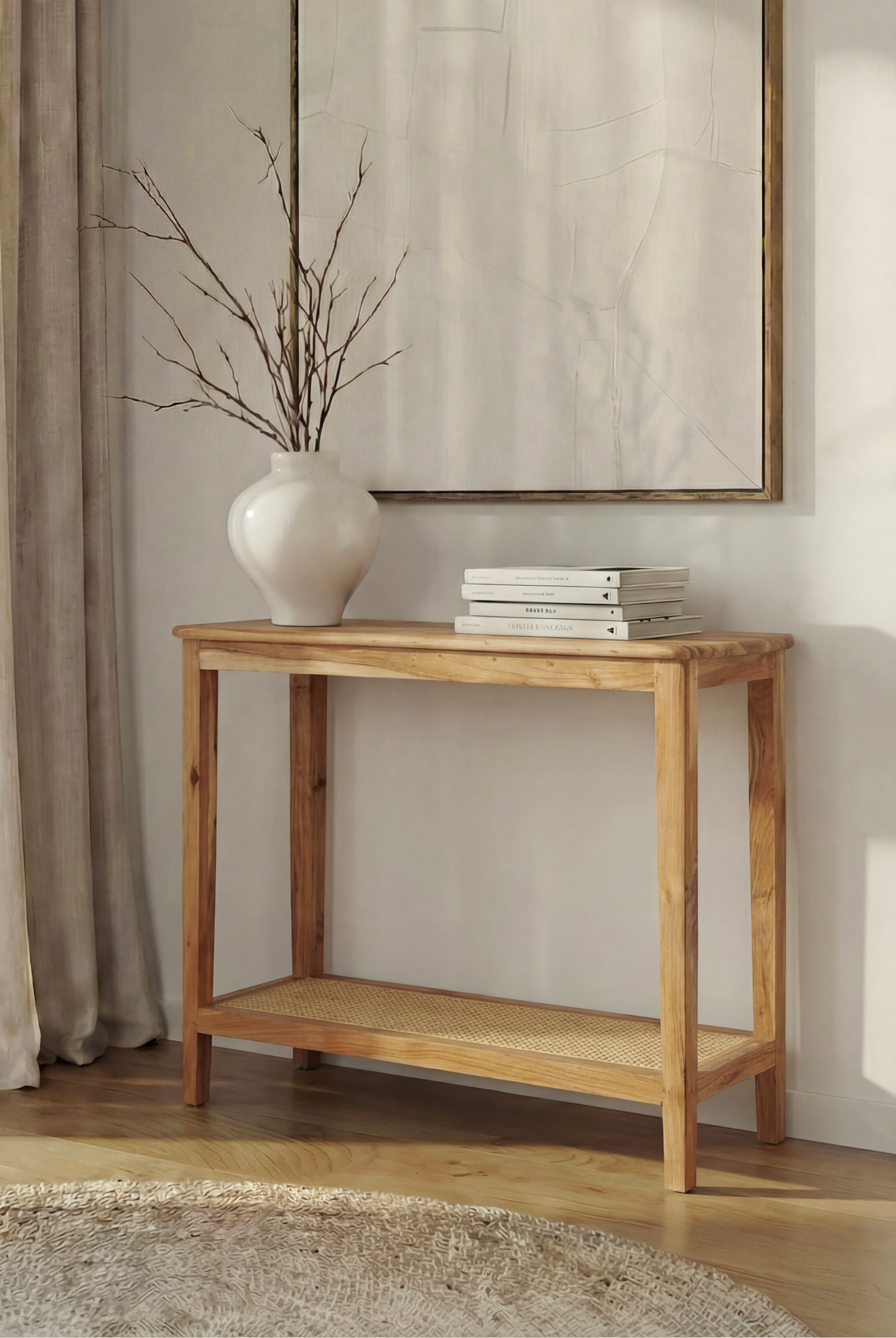 Elevate your home decor with our distinguished collection of hardwood console tables, masterfully crafted from the finest acacia and mango woods, complemented by select pieces in elegant rattan. Renowned for their distinct grain patterns, resilience, and aesthetic appeal, acacia and mango wood bring both character and durability to every piece in this range, while the inclusion of rattan adds a touch of organic texture and versatile charm.