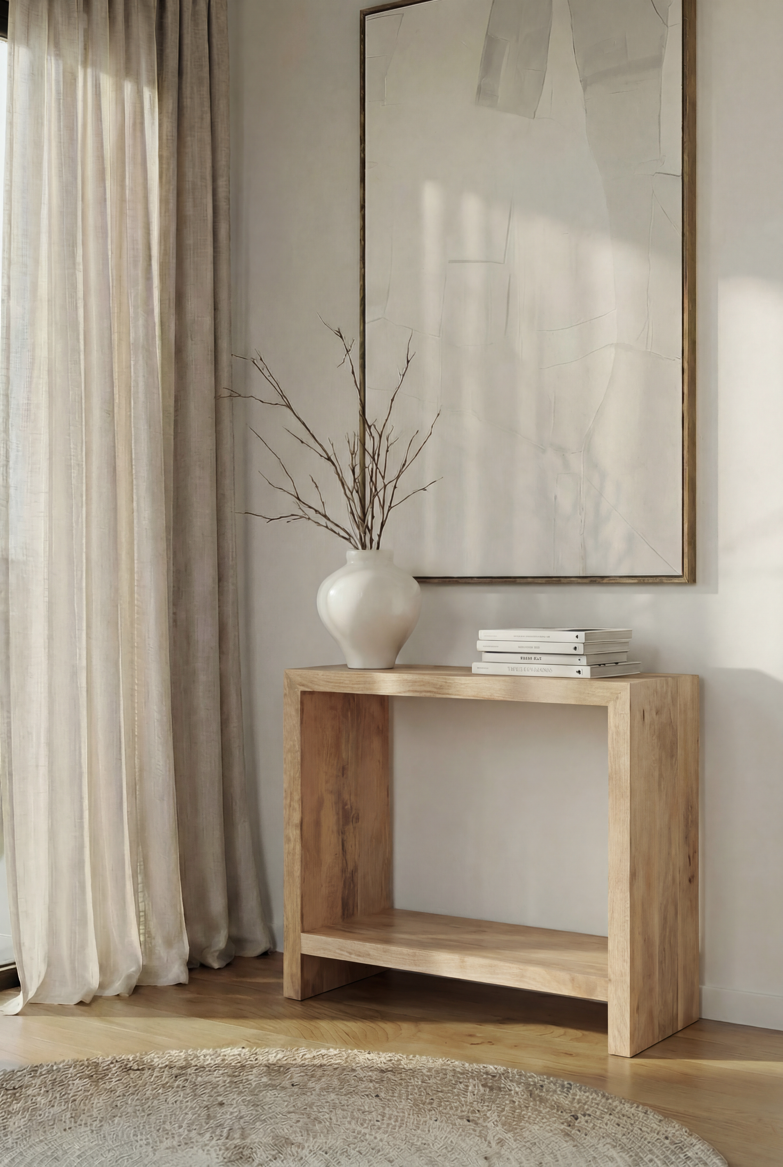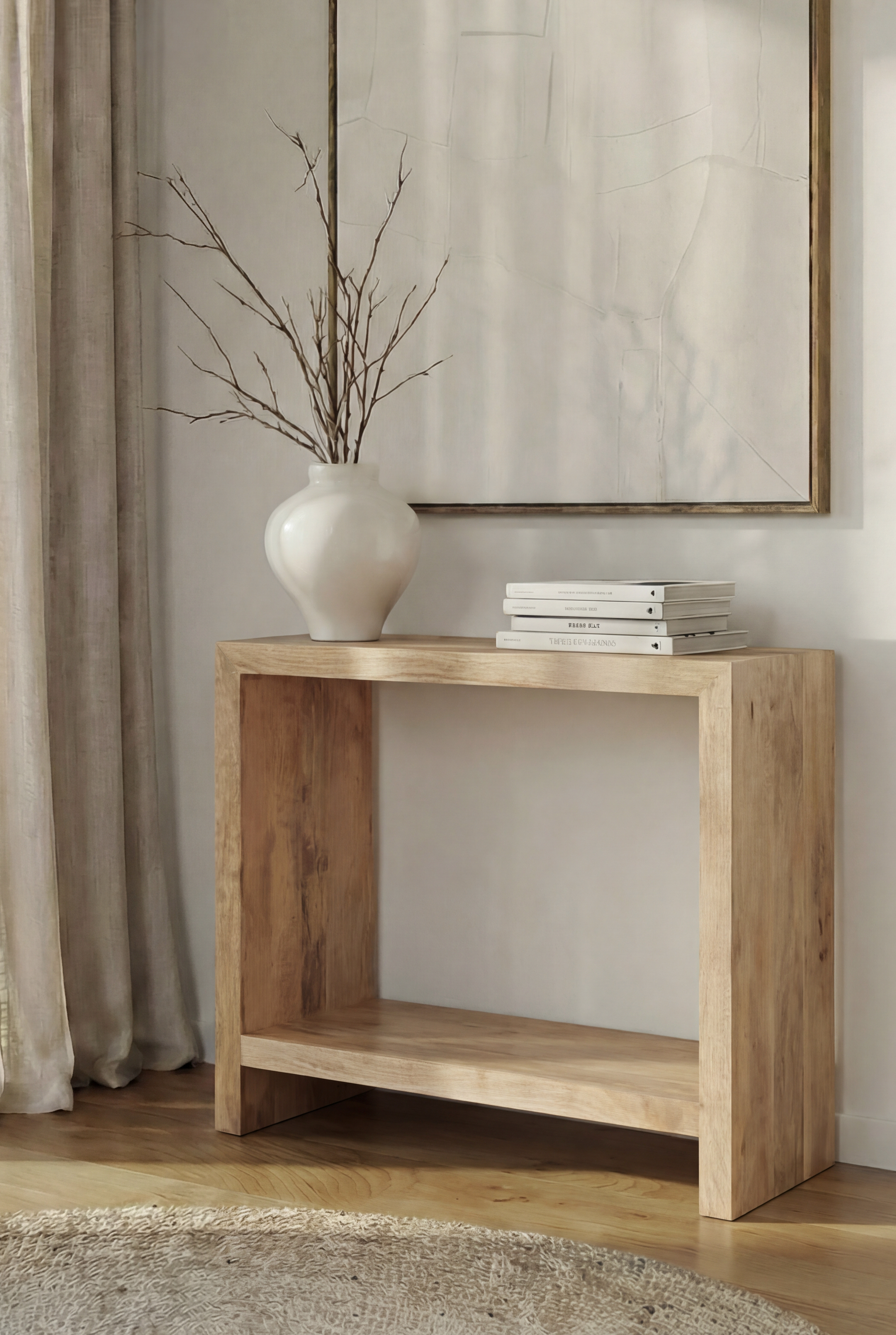 Florent Wooden Console Table is crafted from warm natural wood, featuring a clean open frame silhouette that highlights modern architectural simplicity. Soft beige and honey toned grain patterns enhance its organic warmth, while the structured rectangular form creates a refined balanced presence. Designed to elevate your entryway or living space, it allows you to style and layer with ease, bringing understated French elegance and contemporary minimal charm into your home.