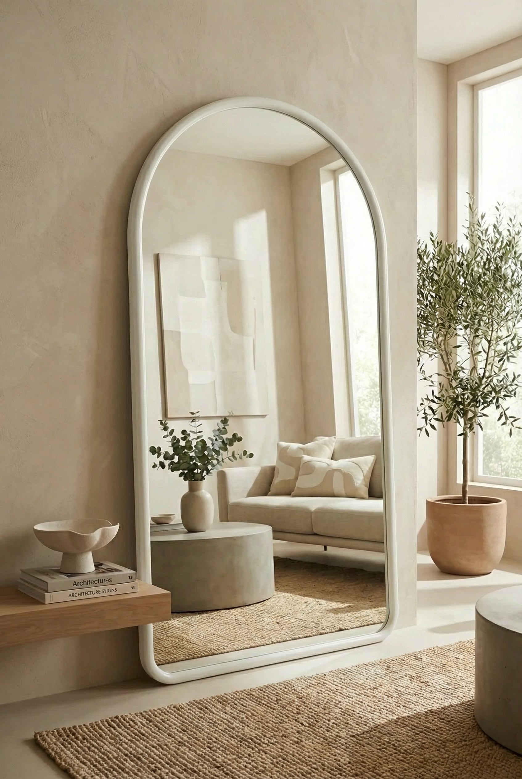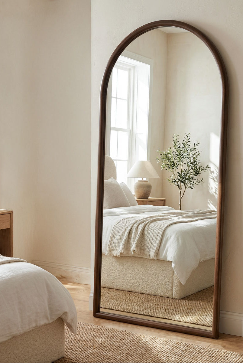 Vanelle Wooden Arch Mirror: A sculptural arch design crafted in natural wood, ideal for adding softness, height, and a refined focal point to contemporary interiors.