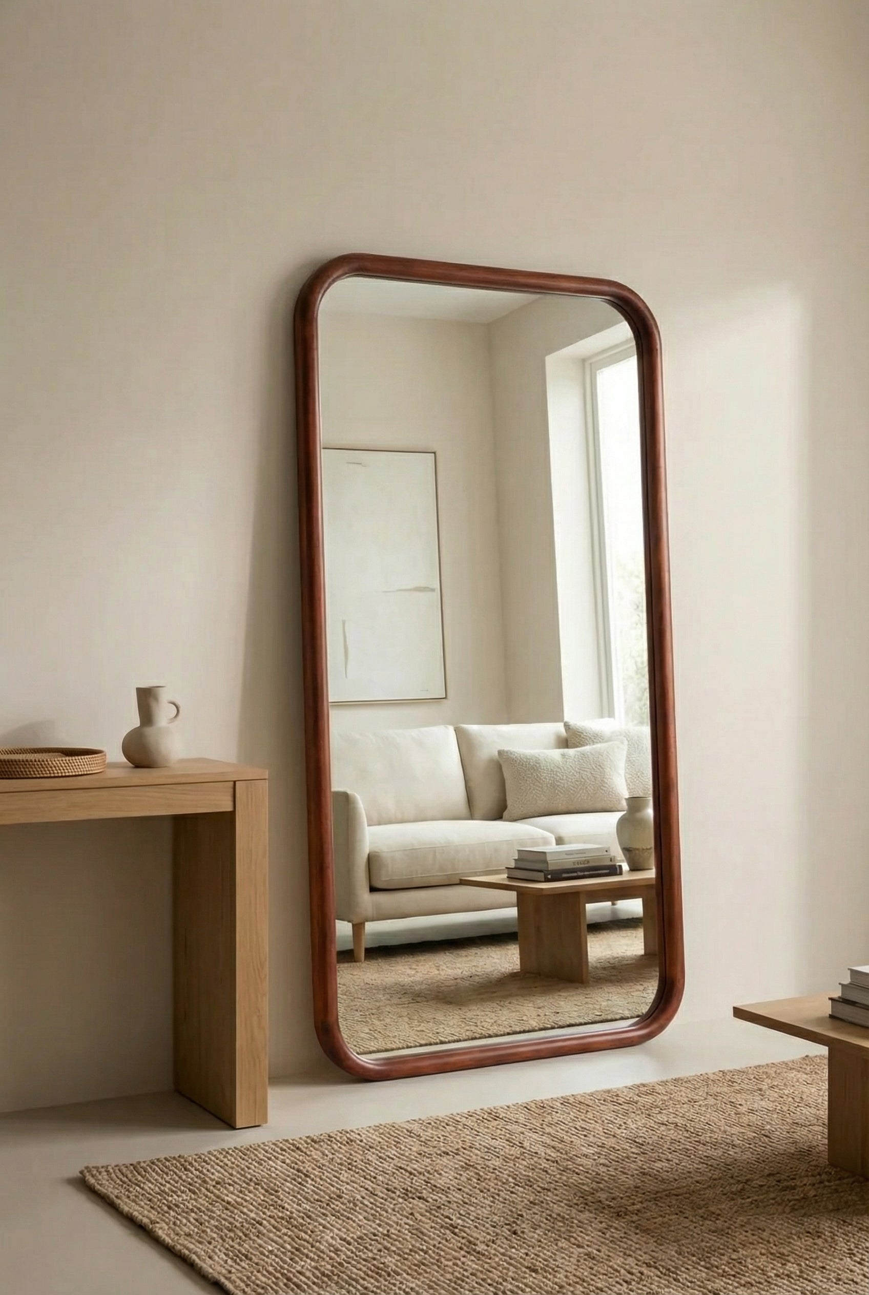 This rectangular mirror brings warmth and understated elegance to your space through its softly rounded wood frame and natural finish. Designed to enhance light and create a sense of openness, it blends seamlessly into serene bedrooms, living areas, or entryways while complementing neutral palettes and organic textures. Its timeless silhouette and warm tones add depth and balance, making it an effortless accent that elevates everyday interiors with quiet sophistication.